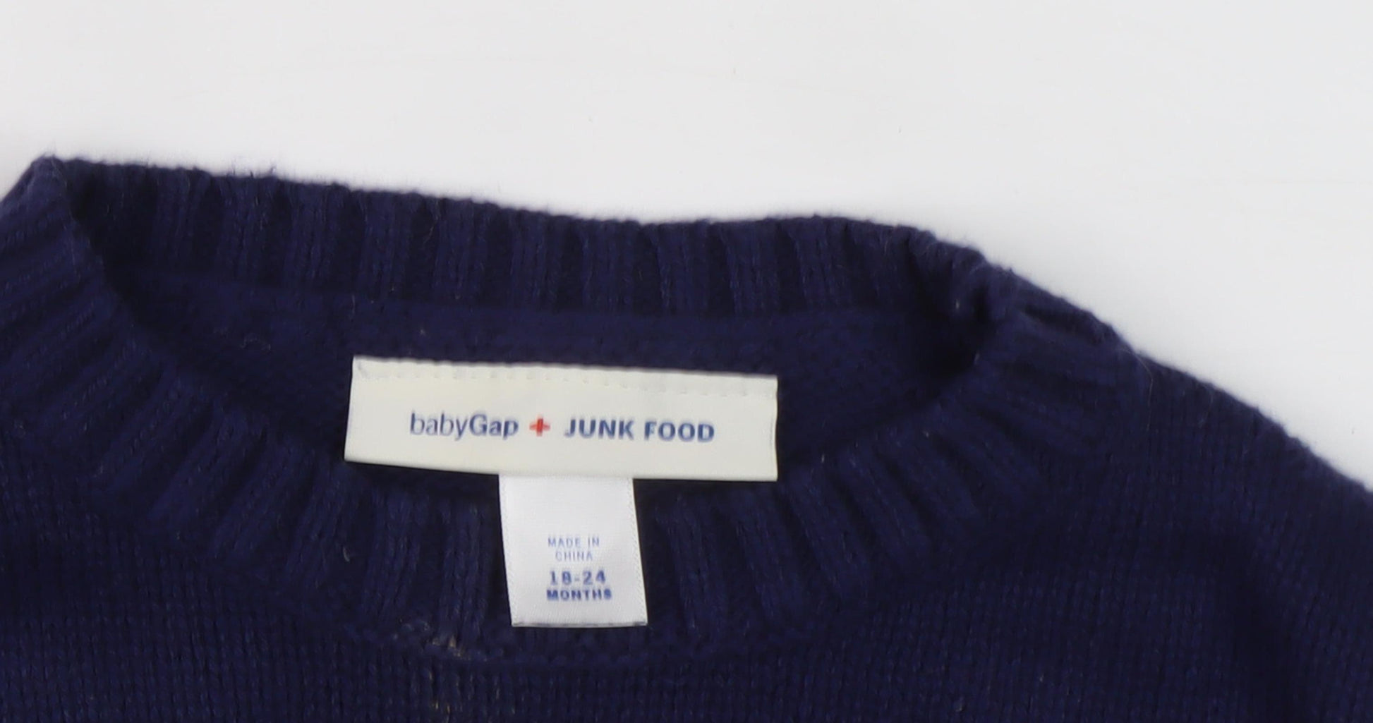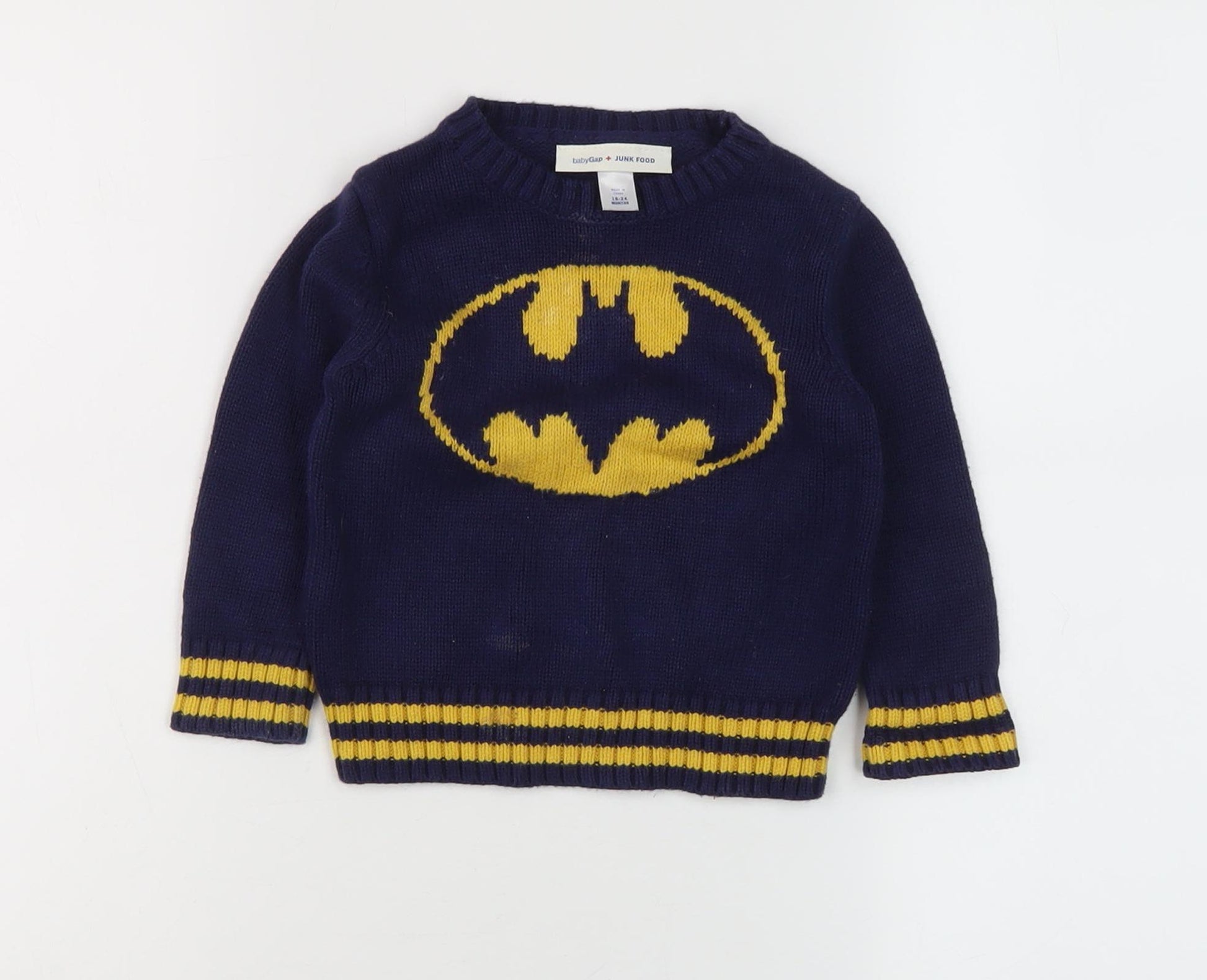 This charming babyGap + Junk Food boys' jumper is a playful addition to any young superhero's wardrobe. Featuring the iconic Batman logo in a vibrant graphic print, this chunky-knit pullover offers both style and comfort. Crafted from 100% cotton, it is soft on the skin, ensuring all-day wearability for young adventurers. Its deep blue base with contrasting yellow accents makes this jumper a standout piece, perfect for casual outings or cozy days at home. The long sleeves and crew neckline offer a classic fit, providing warmth during those chilly autumn and winter months. Ideal for fans of the DC Universe, this jumper is not just a piece of clothing but a tribute to one of the most beloved superheroes. Though pre-loved, it remains in good condition, ready to bring joy and excitement into your child's daily adventures. Make your little one's day extra special with this delightful Batman-themed jumper!