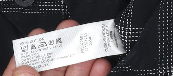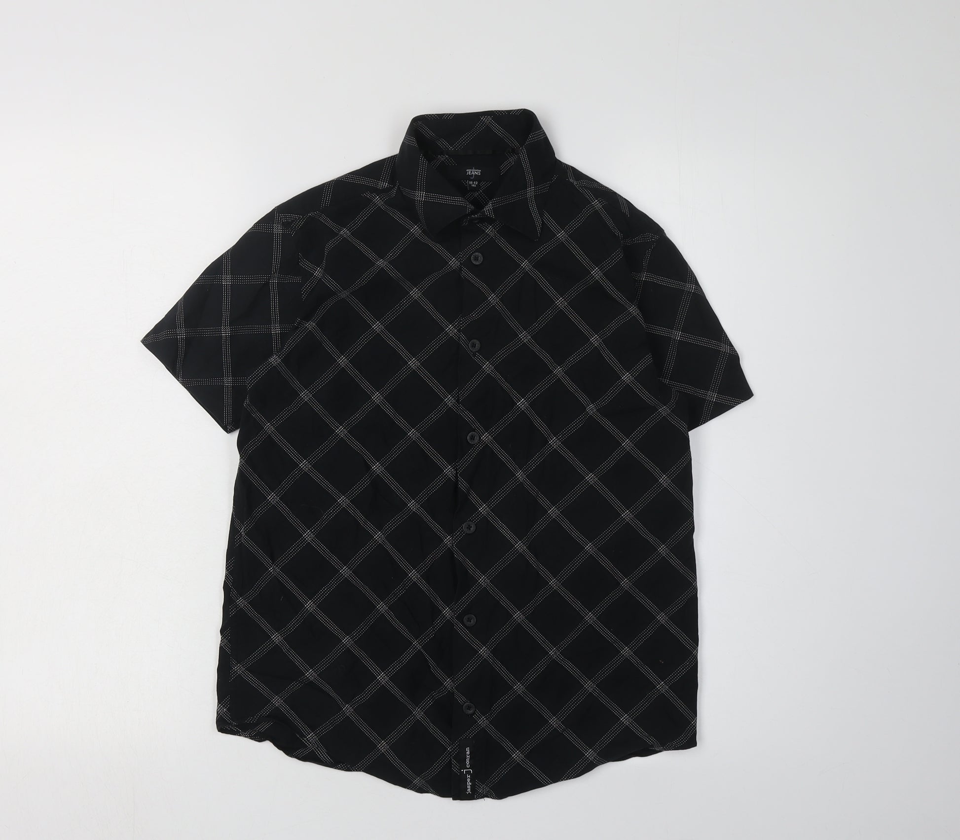 Introducing the stylish Debenhams button-up shirt for boys aged 11-12 years, perfect for any casual occasion. Crafted from 100% cotton, this black shirt features a classic check pattern and short sleeves, making it a versatile addition to any wardrobe. Designed with a regular fit, the shirt provides comfort while maintaining a modern, sleek look. The collared neckline and easy-care buttons add to the shirt's timeless style. Ideal for all seasons, this basic yet trendy piece is suitable for everyday wear. Whether dressing up for a casual outing or heading to school, this shirt ensures your young one stays comfortable and stylish. Don't miss out on this new with tags item from Debenhams for a great price.