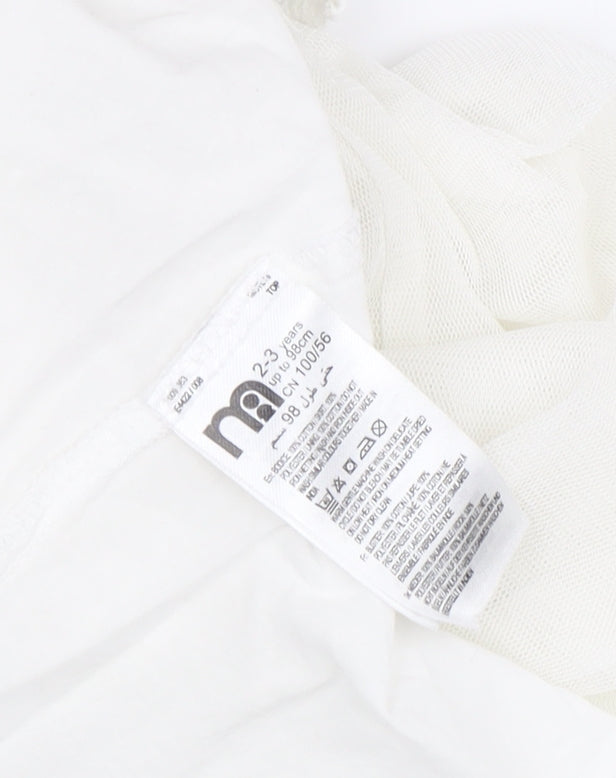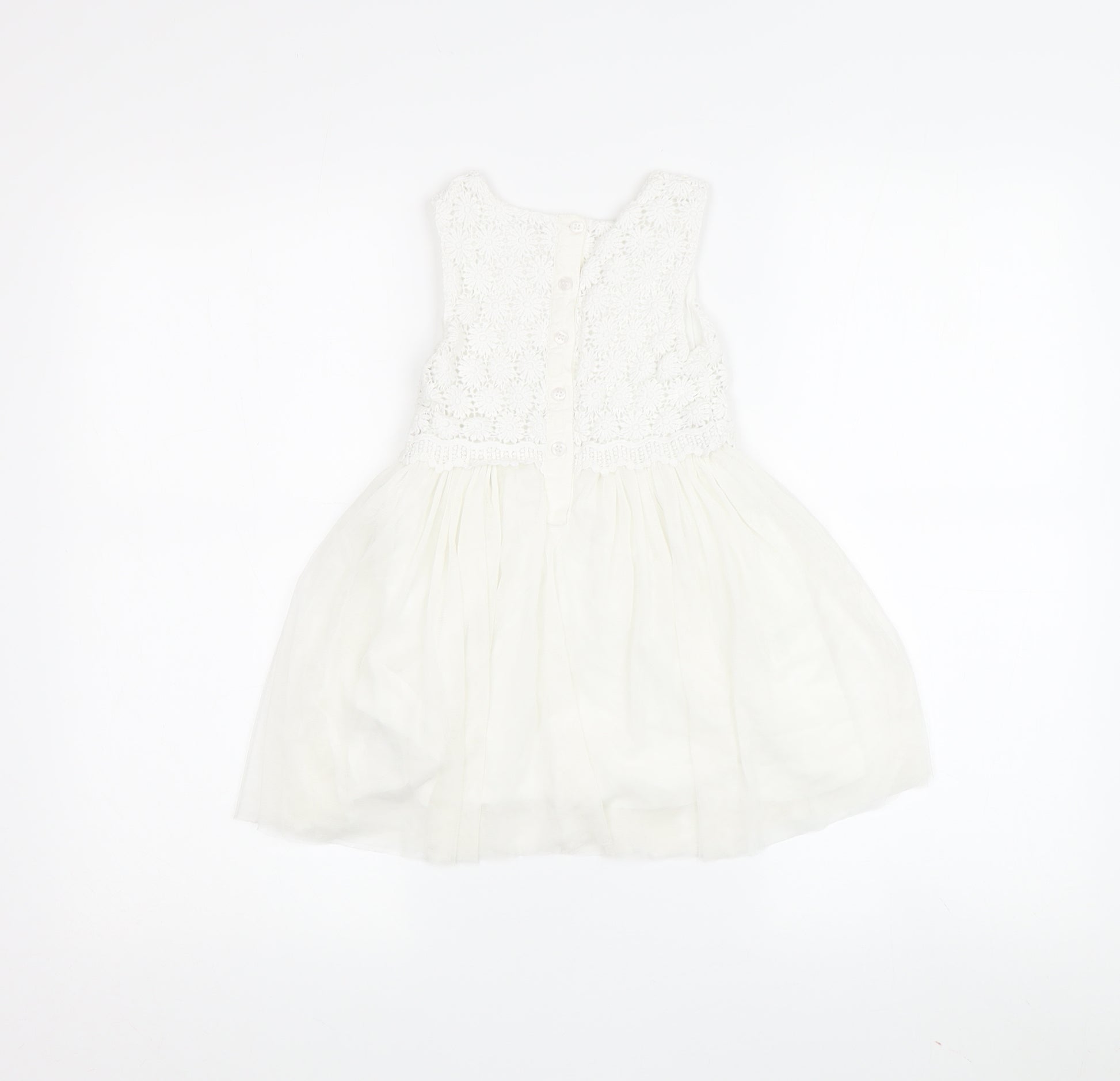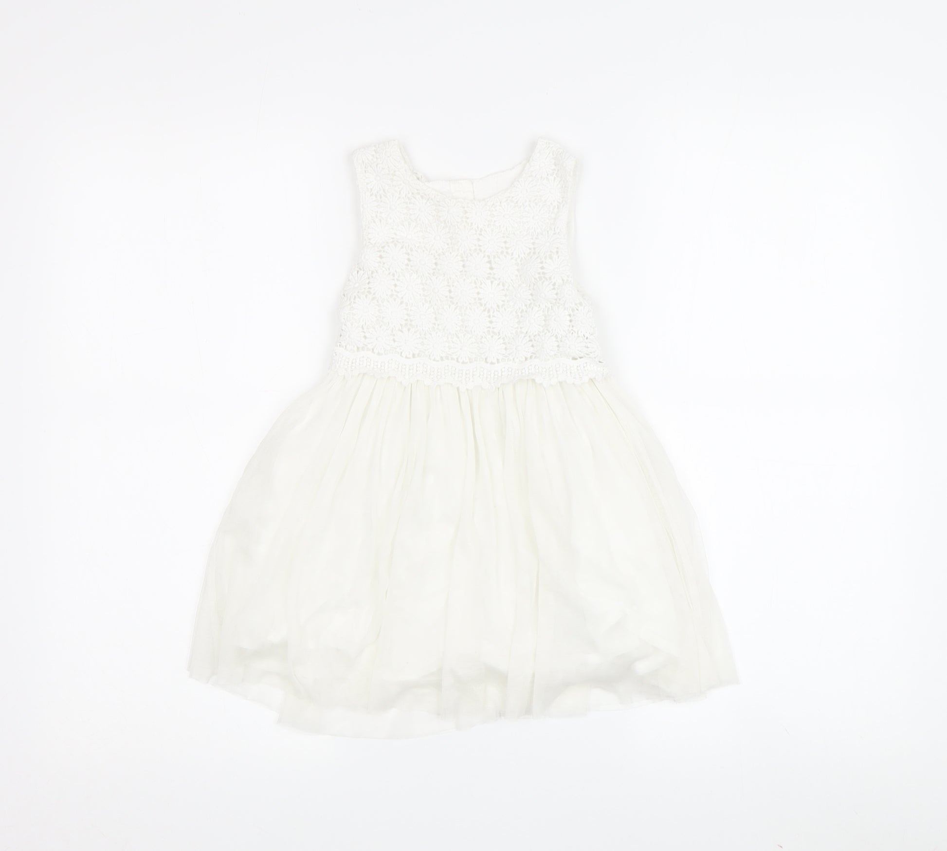 Introducing a charming addition to your little one's wardrobe, the Matalan Girls White Lace A-Line Party Dress in size 2-3 Years. Crafted with delicate attention to detail, this dress features a beautifully crocheted bodice complemented by a soft, flowy tulle skirt for a touch of elegance. The classic A-line silhouette ensures a comfortable fit and ease of movement, perfect for twirling at parties or weddings. Designed with a round neckline and sleeveless style, it keeps your child cool and comfortable during sunny spring and summer days. The dress boasts a buttoned back closure for easy dressing, while the all-white ensemble adorned with intricate lace accents adds a timeless, princess-perfect charm. Made from quality cotton lining and polyester outer, it promises durability and a premium feel. It's machine washable, offering practicality for busy parents. This versatile piece is ideal for casual outings or special occasions. Despite its excellent condition, please note the absence of original tags, making it a delightful pre-loved find. Treat your young fashionista to this exquisite dress that blends style, comfort, and affordability, now available for just £12.00.
