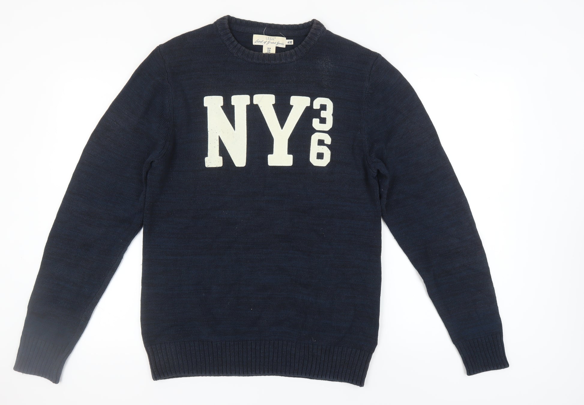 Upgrade your casual wardrobe with this stylish H&M pullover jumper, featuring a bold 'NY 36' college-style logo on the front. Crafted from 100% high-quality cotton, this knitwear piece is designed for comfort and breathability, making it a perfect go-to for everyday wear. The deep blue colour palette lends an air of sophistication, while the classic crew neck and regular fit make it versatile for layering over shirts or wearing alone. Finished with a long sleeve design, it offers warmth, making it ideal for both the autumn and winter seasons. Its graphic print adds a modern touch to the traditional pullover, making it suitable for casual occasions. Despite its pre-loved status, the jumper remains in excellent condition, showcasing only slight wear around the logo area. Enjoy easy maintenance with its machine-washable fabric, ensuring it stays fresh and ready to wear. Whether you're heading to a laid-back weekend gathering or a casual outing, this jumper promises to deliver style and comfort effortlessly. Don't miss out on the chance to elevate your everyday look with this desirable piece from H&M's reputable clothing line.