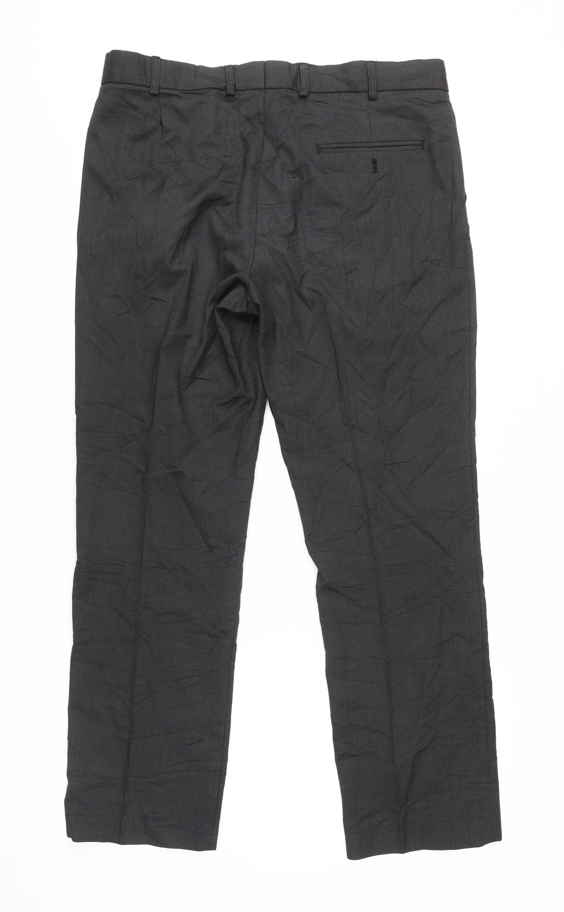 Elevate your wardrobe with these sophisticated black trousers from Burton, perfect for any formal occasion. Crafted with a flattering regular fit, these trousers sit comfortably at the waist, ensuring an impeccable look that complements your silhouette. Made from a durable blend of 65% polyester and 35% viscose, they promise not only style but also longevity. Designed for the modern man, these trousers feature a classic straight leg style, offering a timeless appeal. The flat front construction gives them a polished, professional appearance, making them ideal for both business and formal events. The trousers boast a waist size of 36 inches, with a regular inside leg fit, ensuring a comfortable and precise fit. While maintaining a minimalist aesthetic, these trousers come with practical slash pockets, adding to their functionality without compromising on style. Though they bear slight creasing, this is easily remedied, keeping them in excellent condition. These trousers are an ideal addition to any gentleman's wardrobe, offering versatility and elegance in one. Whether you're heading to a business meeting or a formal event, these trousers are sure to make a compelling impression. Don't miss out on this essential wardrobe staple.