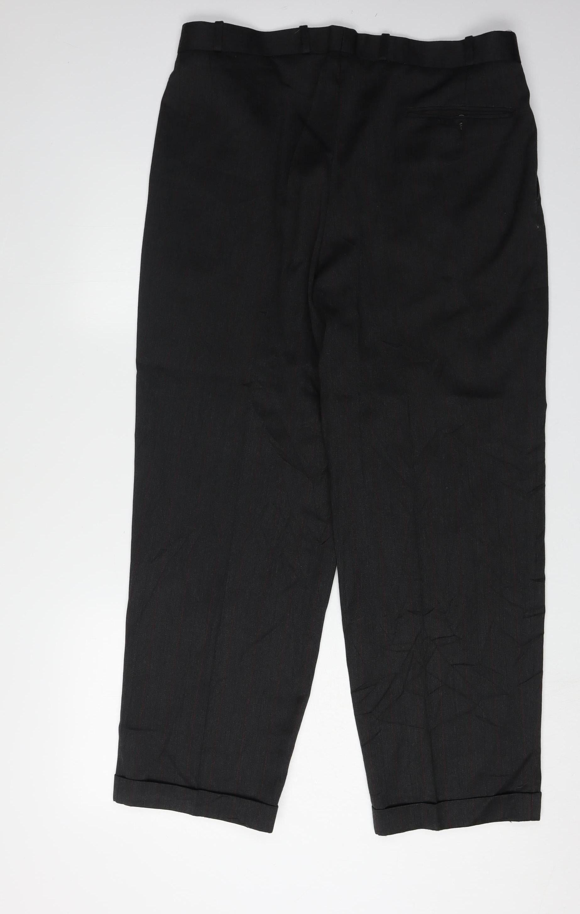 Discover elegance and sophistication with these Men's Black Pleated Trousers by Burtons, crafted meticulously for those who appreciate classic styles. Designed with a waist size of 36 inches, these trousers embody a regular fit that provides both comfort and style. Featuring a pleated front, these trousers offer a refined business and formal appeal, making them the perfect choice for office wear or special occasions. Crafted from a durable blend of 65% Polyester and 35% Viscose, they ensure longevity while maintaining a sleek, smooth finish. The trousers are attributed with a mid-rise of 10-12 inches, providing a conventional fit that complements most body types. They are black in colour, allowing them to be easily paired with a variety of shirts, blazers, and shoes, enhancing your wardrobe's versatility. Made in Portugal, these trousers guarantee quality craftsmanship, evident in every stitch and contour. The closure is classic with a button, ensuring ease of wearing. Though gently worn, these trousers display no signs of significant wear or damage, preserving their excellent condition. Their straight leg style adds to their timeless design, offering a look that's both modern and elegant. Perfect for the colder seasons of Autumn and Winter, these trousers are not only stylish but practical. Machine washable, maintaining them is effortless, adding to their utility value. Elevate your attire with these splendid trousers from Burtons, ensuring you make a confident impression in every setting.