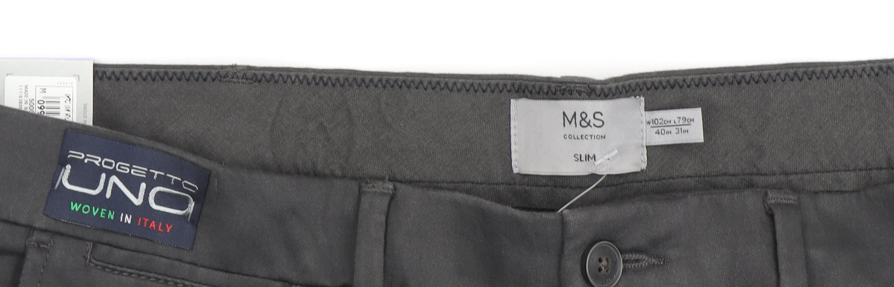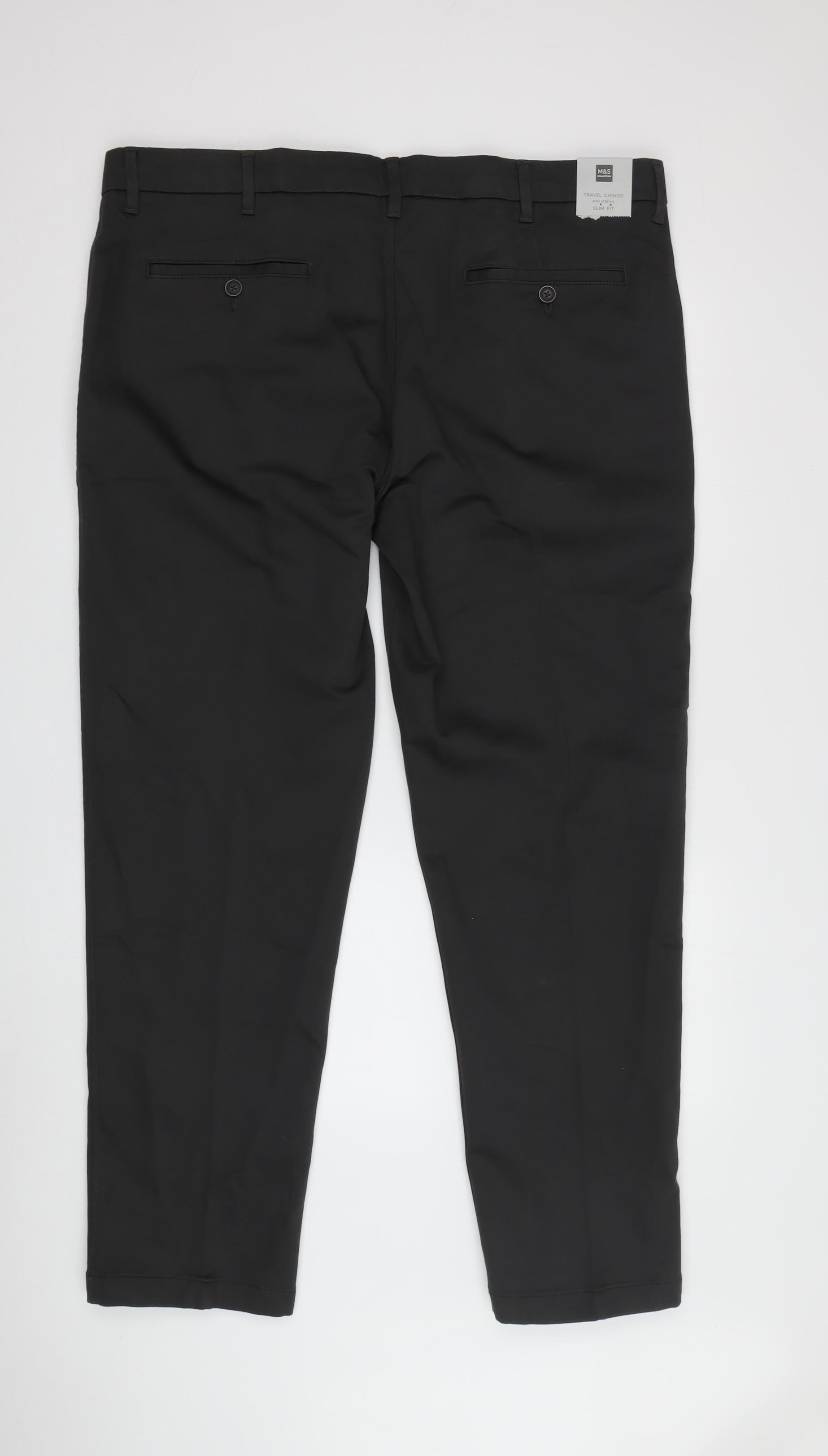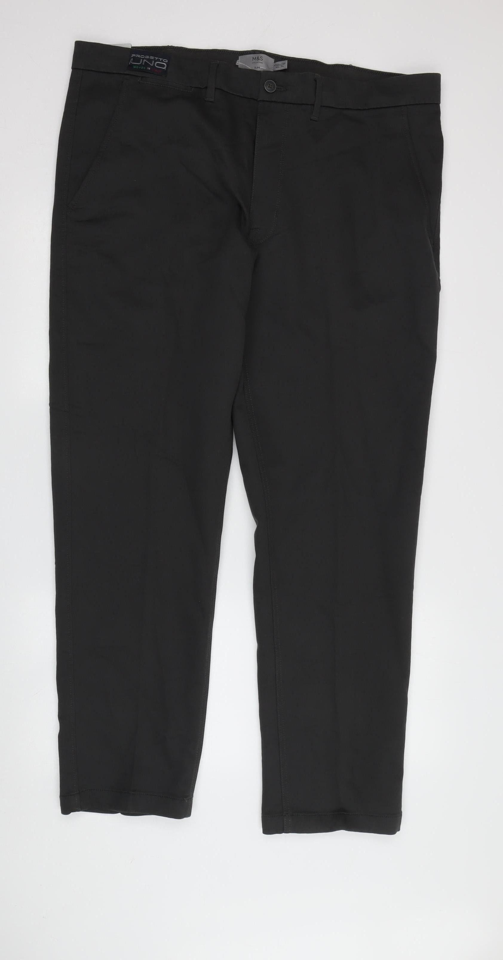 Step out in style with these sleek black chino trousers from Marks and Spencer, crafted for the discerning gentleman who appreciates both comfort and fashion. These slim fit chinos perfectly blend contemporary style with timeless appeal, making them a versatile addition to any wardrobe. A mid-rise design and straight leg styling ensure these trousers provide a flattering silhouette while offering a relaxed fit ideal for all-day wear.The trousers are made from a durable blend of 65% cotton, 33% polyester, and 2% elastane, ensuring long-lasting wear and flexibility. The soft twill fabric lends a touch of luxury, while the black colour offers a sophisticated finish, easily coordinating with various tops and shoes for different occasions. Whether off to a business meeting, enjoying a casual day out, or travelling, these chinos cater to all your needs with style and comfort.Featuring practical slash pockets for convenience and a secure button and zip closure, these trousers guarantee ease of wear without compromising on style. The elastic waist adds an element of comfort, ensuring you feel as good as you look. Machine washable for easy care, these trousers promise to be a mainstay in your fashion rotation.Ideal for spring and autumn wears, their versatile nature makes them suitable for a range of settings from business to casual outings. Elevate your wardrobe with these Marks and Spencer chinos and enjoy their plush feel and sophisticated style, which promise to make a striking impression wherever you go.