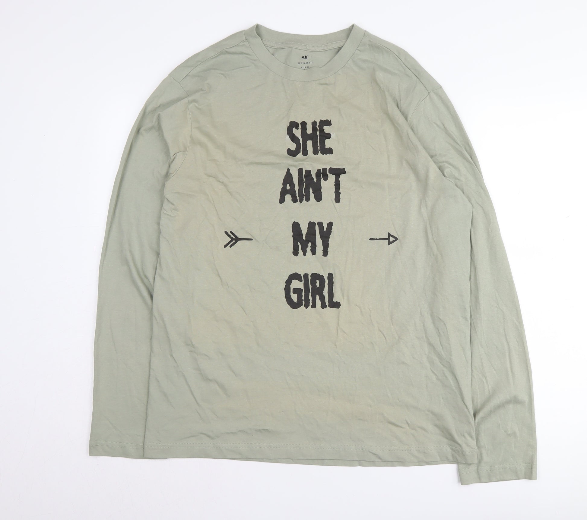 Embrace a casual yet stylish look with this H&M men's beige graphic T-shirt. Crafted from 100% cotton, this long-sleeved tee offers comfort and breathability, making it perfect for all seasons. The regular fit ensures a relaxed silhouette, while the striking 'She Ain't My Girl' graphic print adds a humorous touch, making it a standout piece for your wardrobe. Its crew neckline contributes to a classic and versatile style, suitable for a variety of occasions. Although it shows slight wrinkling, this T-shirt is in excellent condition and machine washable for easy maintenance. Perfect for casual days out or relaxed gatherings, this tee pairs well with jeans or shorts. Get ready to turn heads with this unique and quirky addition to your collection.