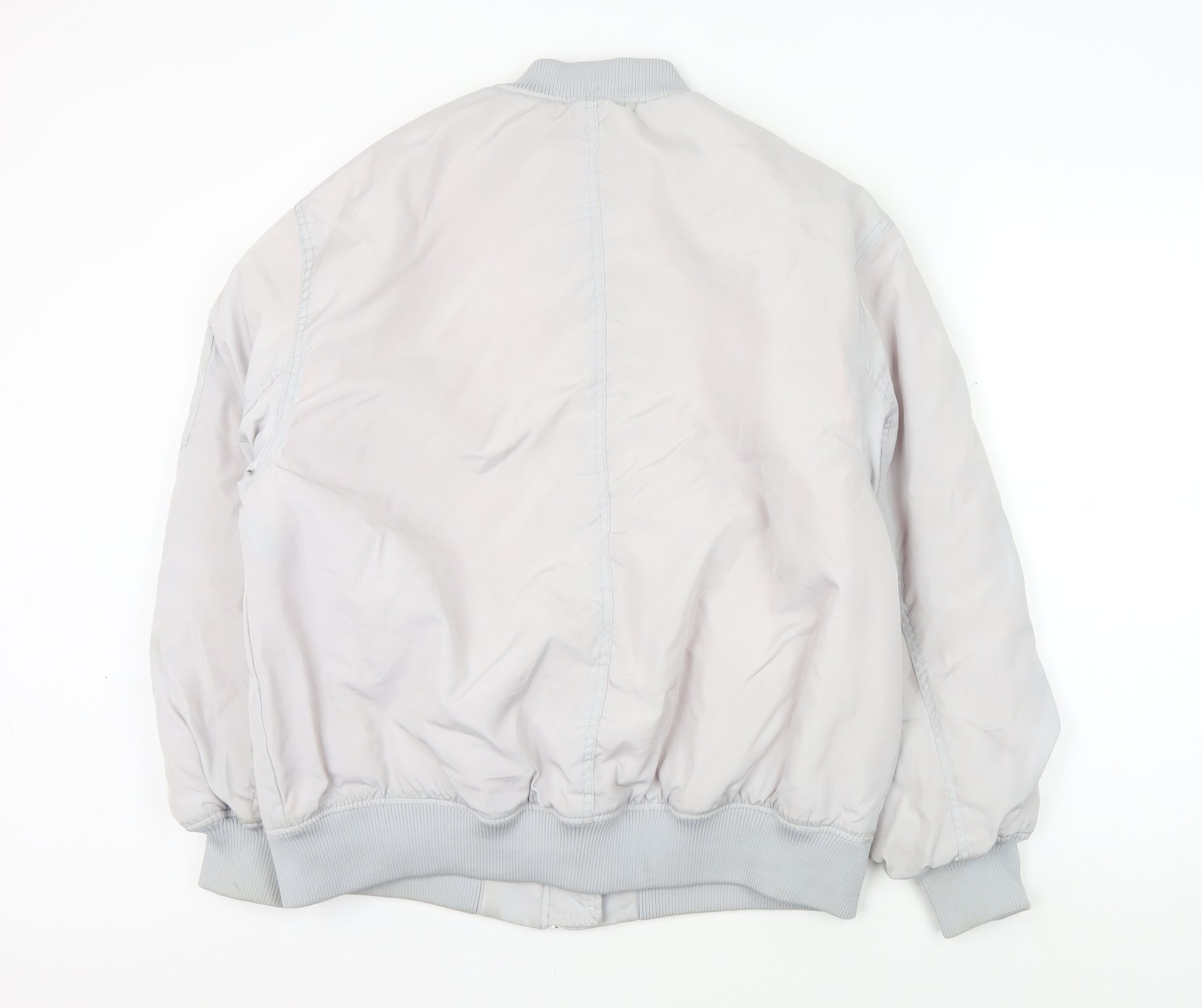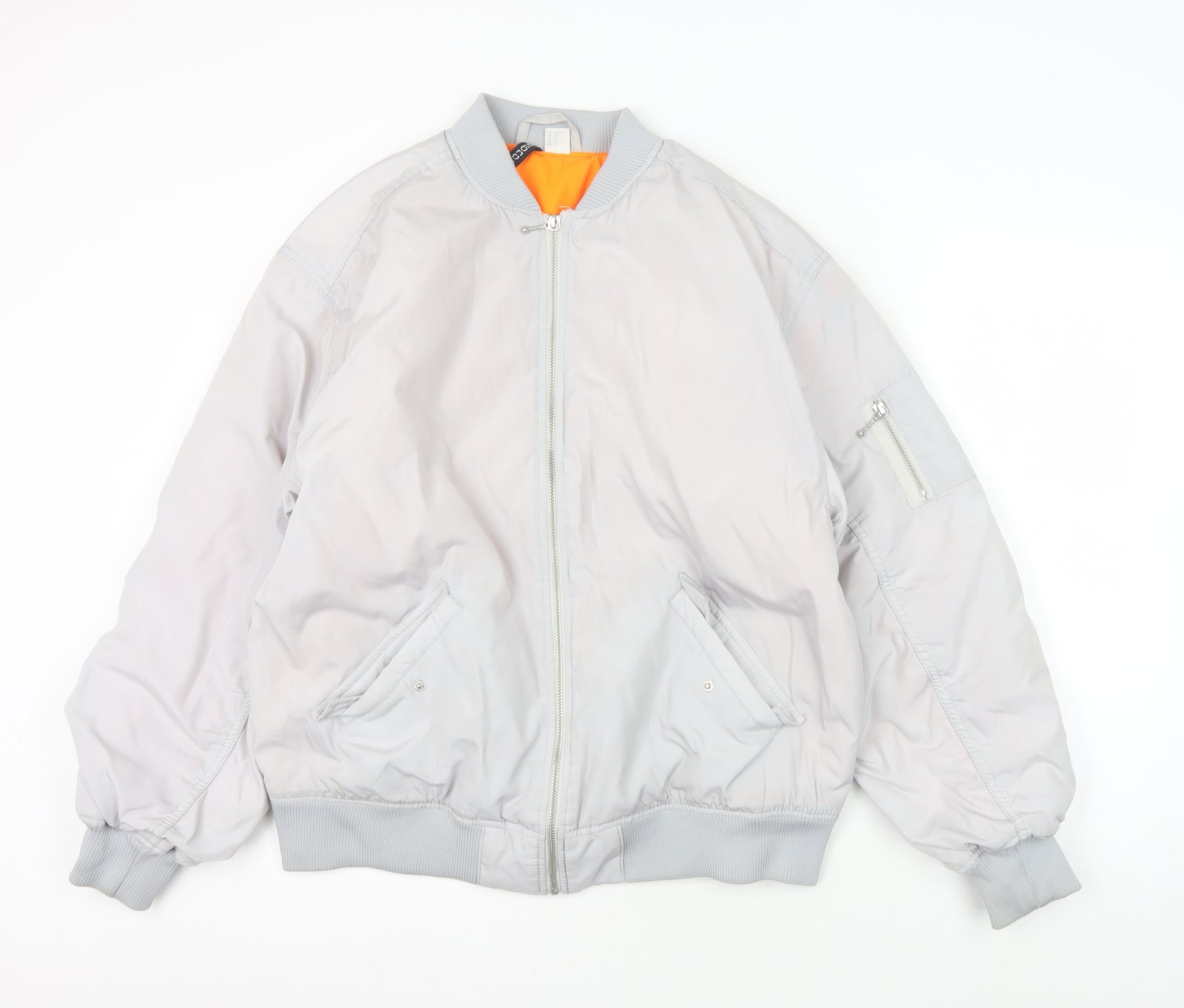 Step out in style with this sleek grey bomber jacket by H&M, expertly crafted for the modern man. Made from 100% polyester, this piece combines durability with an effortlessly cool aesthetic. Designed for all seasons except summer, it's the perfect choice for those looking to transition their wardrobe through autumn, winter, and spring. The jacket features a practical zip closure and is complemented by zipped pockets, making it as functional as it is fashionable. The stand-up collar adds a touch of edge, while the short, regular fit provides a flattering silhouette.