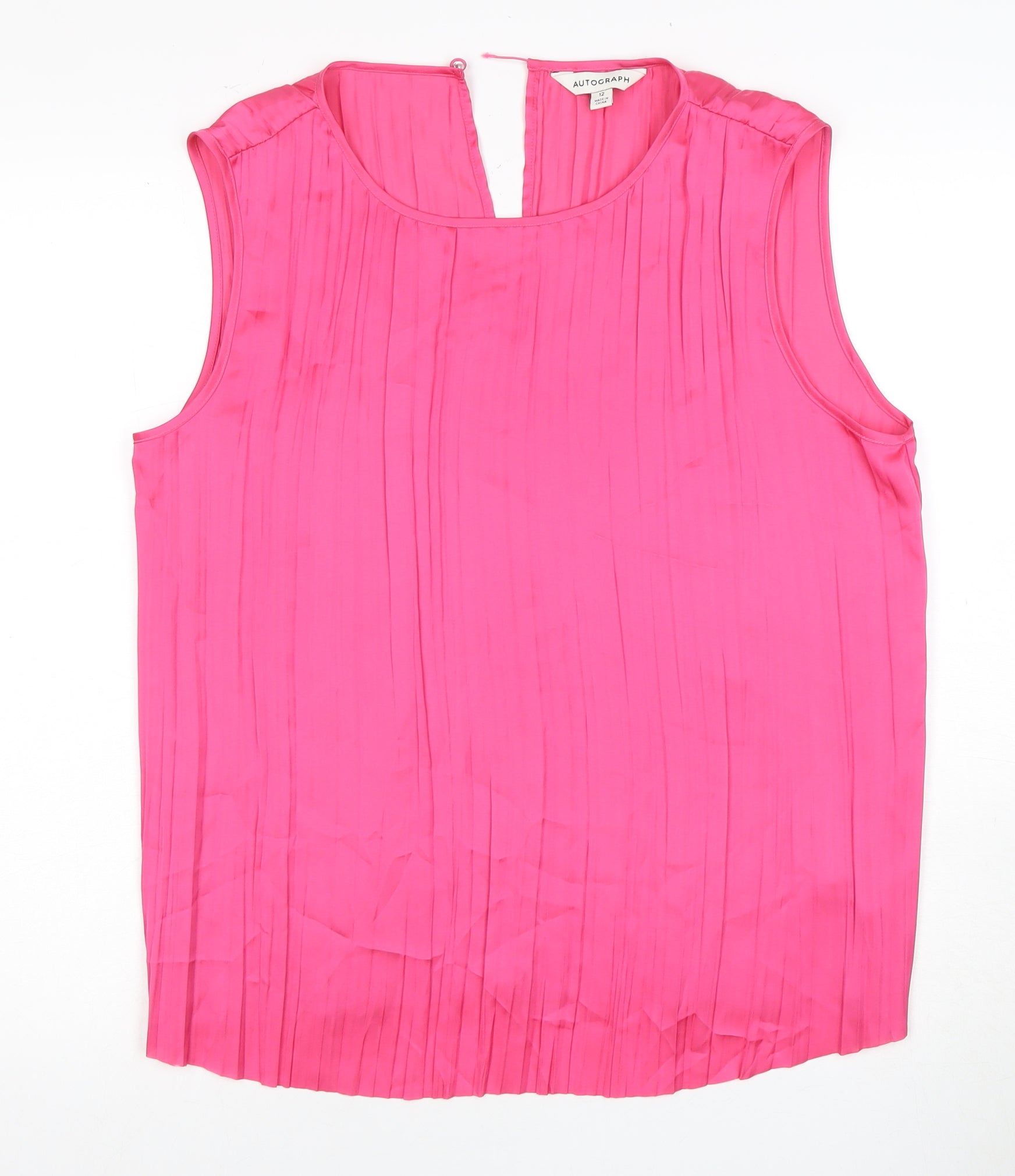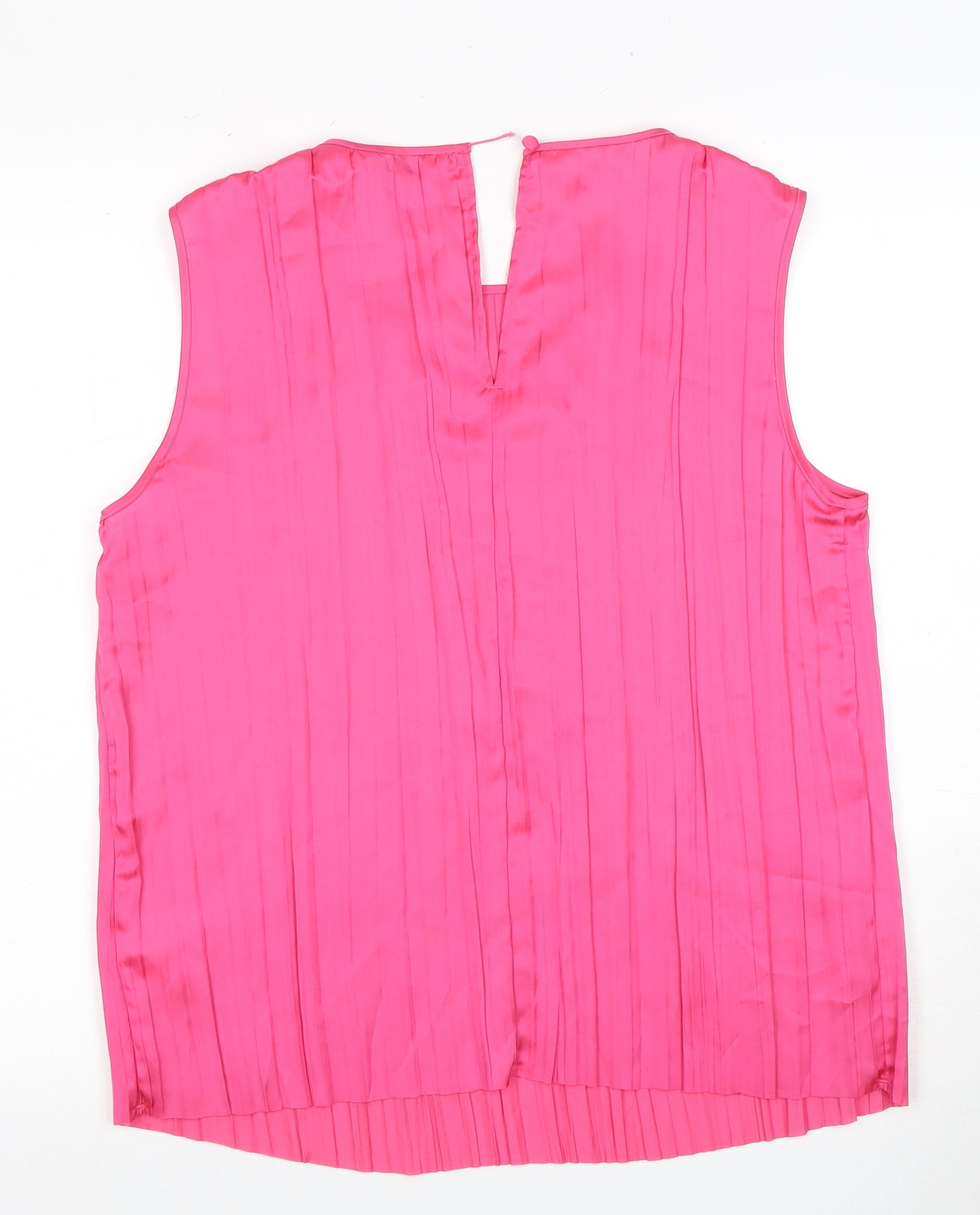 Add a pop of colour to your wardrobe with this vibrant pink sleeveless blouse from Marks and Spencer. Tailored for women, this regular-fit blouse is made completely from high-quality polyester, ensuring both comfort and style. The design features a round neckline and a subtle button closure at the back, giving it a sleek and modern look perfect for casual occasions.Crafted to perfection, this blouse boasts a fine pleated texture that adds an elegant flair, enhancing its overall appearance. It's easy to care for, being machine washable, thus offering both convenience and style for your day-to-day attire. Whether you're heading out for a casual brunch or looking for a chic outfit for a day at the office, this blouse pairs well with both jeans and skirts. Despite being pre-owned, it is in excellent condition with no visible flaws, ensuring you get a quality garment at a fraction of the price.Explore versatile styling possibilities with this Marks and Spencer blouse to keep your wardrobe up-to-date and fashion-forward.