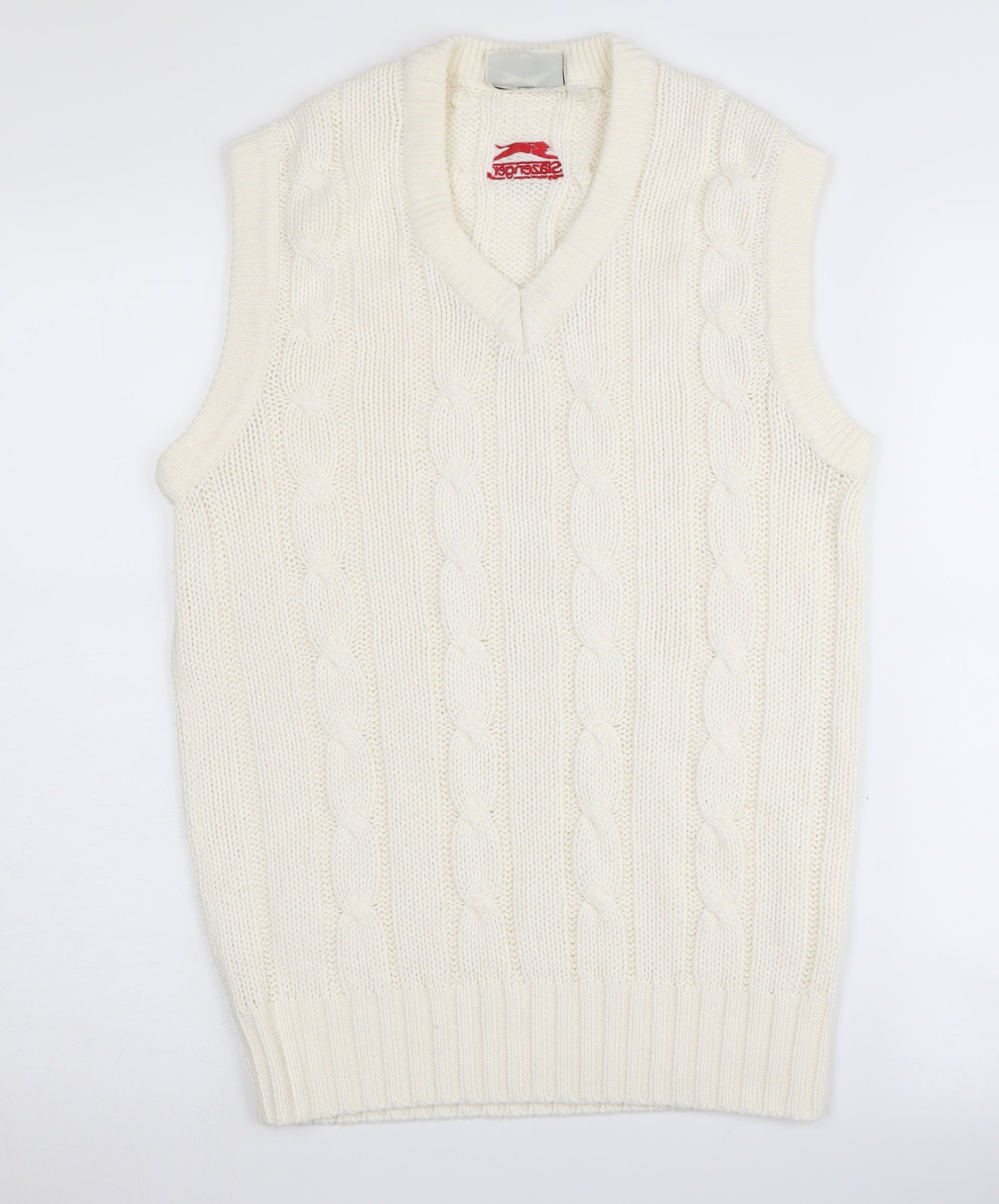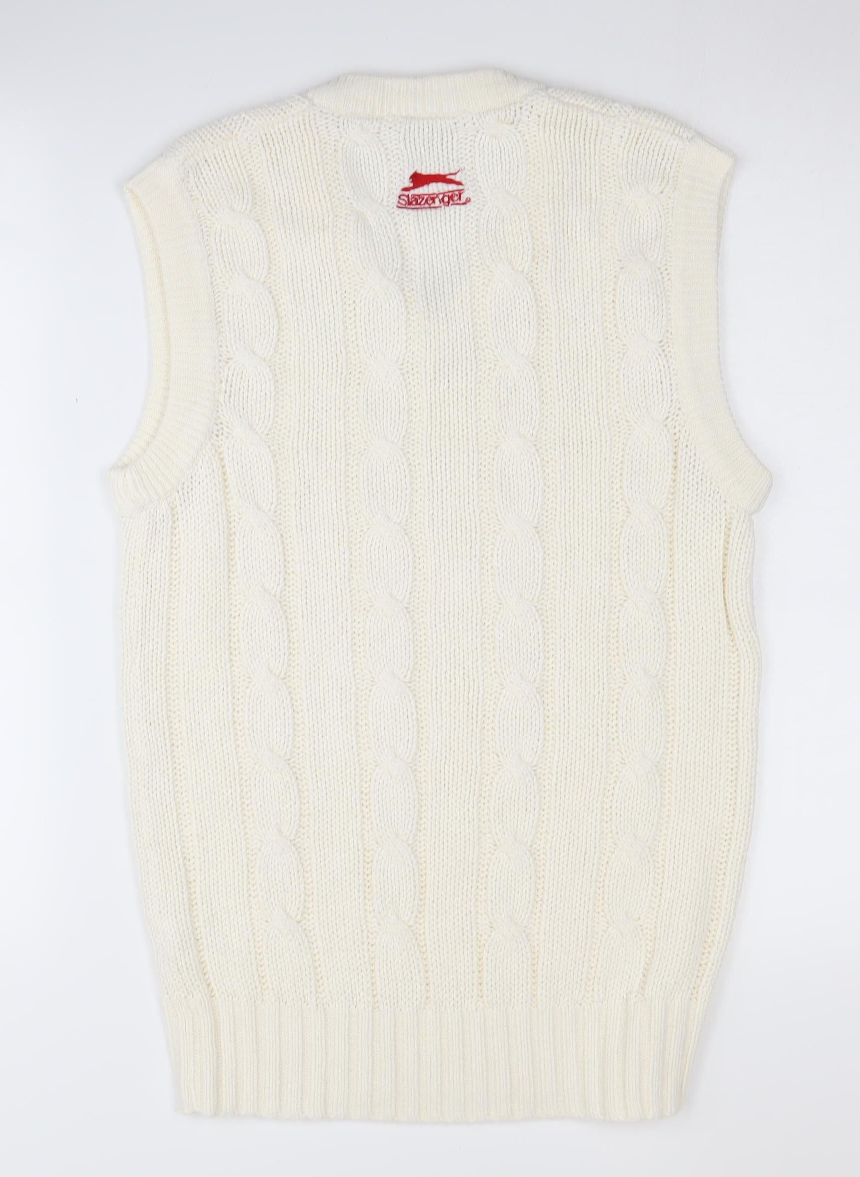 Step into classic style with this Slazenger Men's Ivory Cable-Knit Vest. Crafted for casual comfort, this vest is a perfect addition to your wardrobe for any season. Made from high-quality acrylic, the cable-knit design adds texture and interest to your outfit while the V-neckline offers a traditional look that's never out of style. This sleeveless vest is ideal for layering over your favourite shirts or light jumpers, providing warmth without bulk. Its regular fit ensures comfort and ease of movement, making it a versatile piece for both indoor and outdoor wear. The vest's fine ivory colour is easy to match with various tones, making it a staple piece for every man. Suitable for a range of occasions, from casual outings to smart-casual gatherings, this Slazenger vest embodies timeless appeal. The lack of visible defects indicates the high quality and excellent condition of this garment, ensuring you get both style and longevity. Priced reasonably for a classic knit piece, this vest is a must-have for those who appreciate quality and elegance.