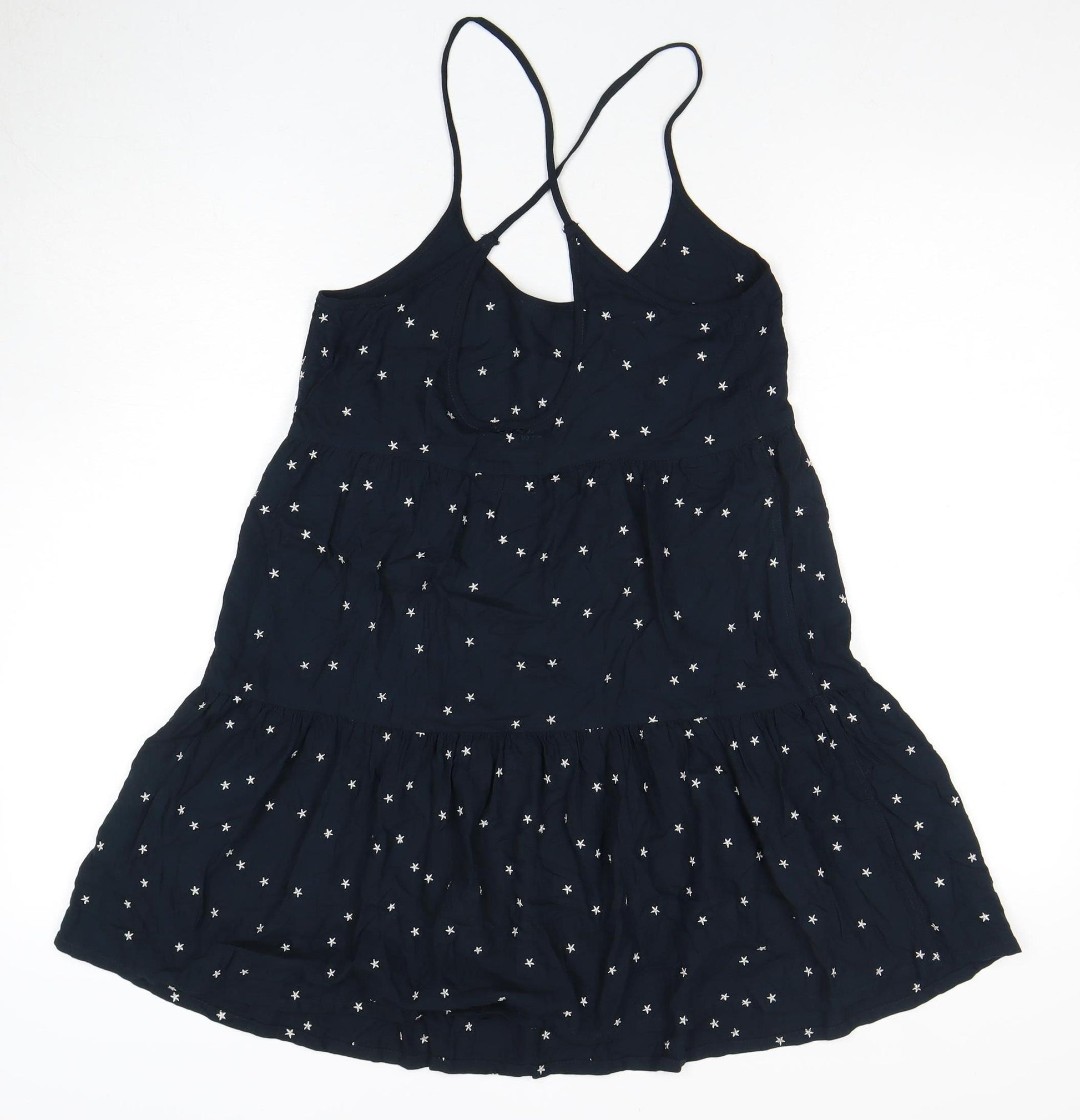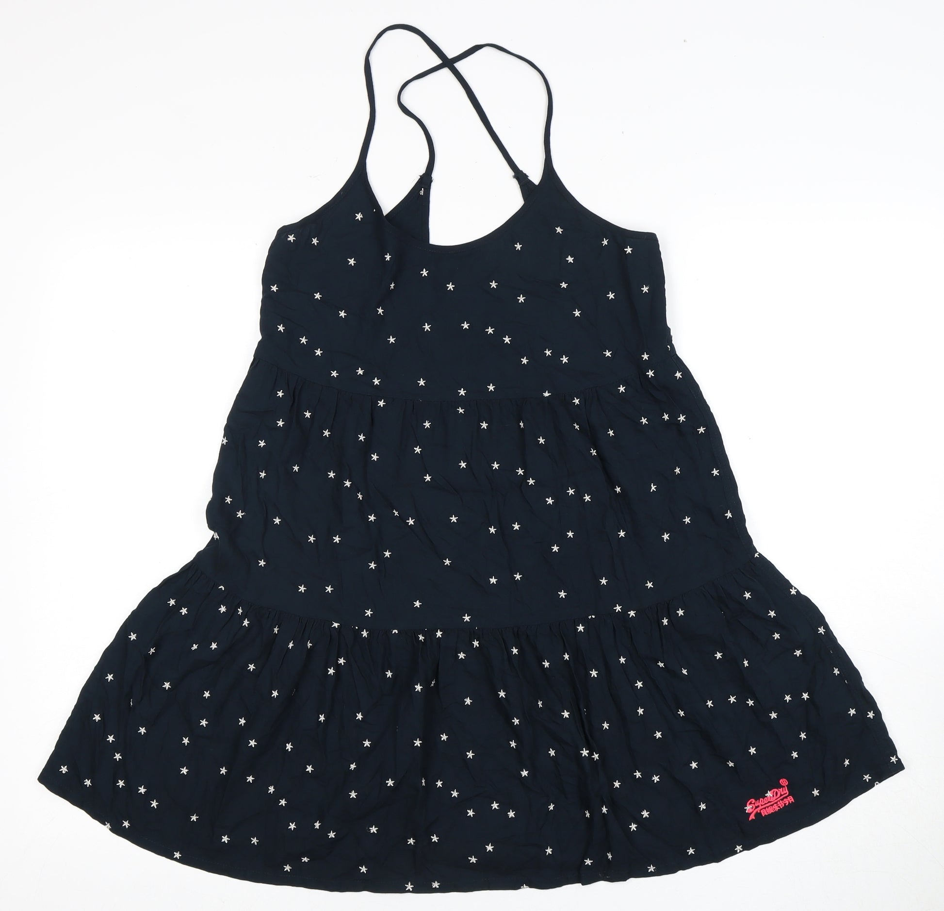 Elevate your summer wardrobe with this elegant Superdry slip dress, expertly crafted for a chic casual look. Designed with a lightweight, breathable fabric, the dress comes in a striking black with delicate star patterns all over, perfect for embracing sunny days with style. The sleeveless cut and scoop neckline offer a comfortable fit, enhanced by its strappy sleeve design that adds a touch of femininity. This versatile dress is ideal for casual outings, ensuring you feel effortlessly fashionable all day long. Its pullover style ensures ease of wear, making it your go-to option for a quick yet stylish outfit. Accentuated by fine embroidery, the dress exudes a unique charm and grace that is sure to turn heads. With no visible wear and meticulously maintained, enjoy this beautiful piece at an excellent pre-loved price.