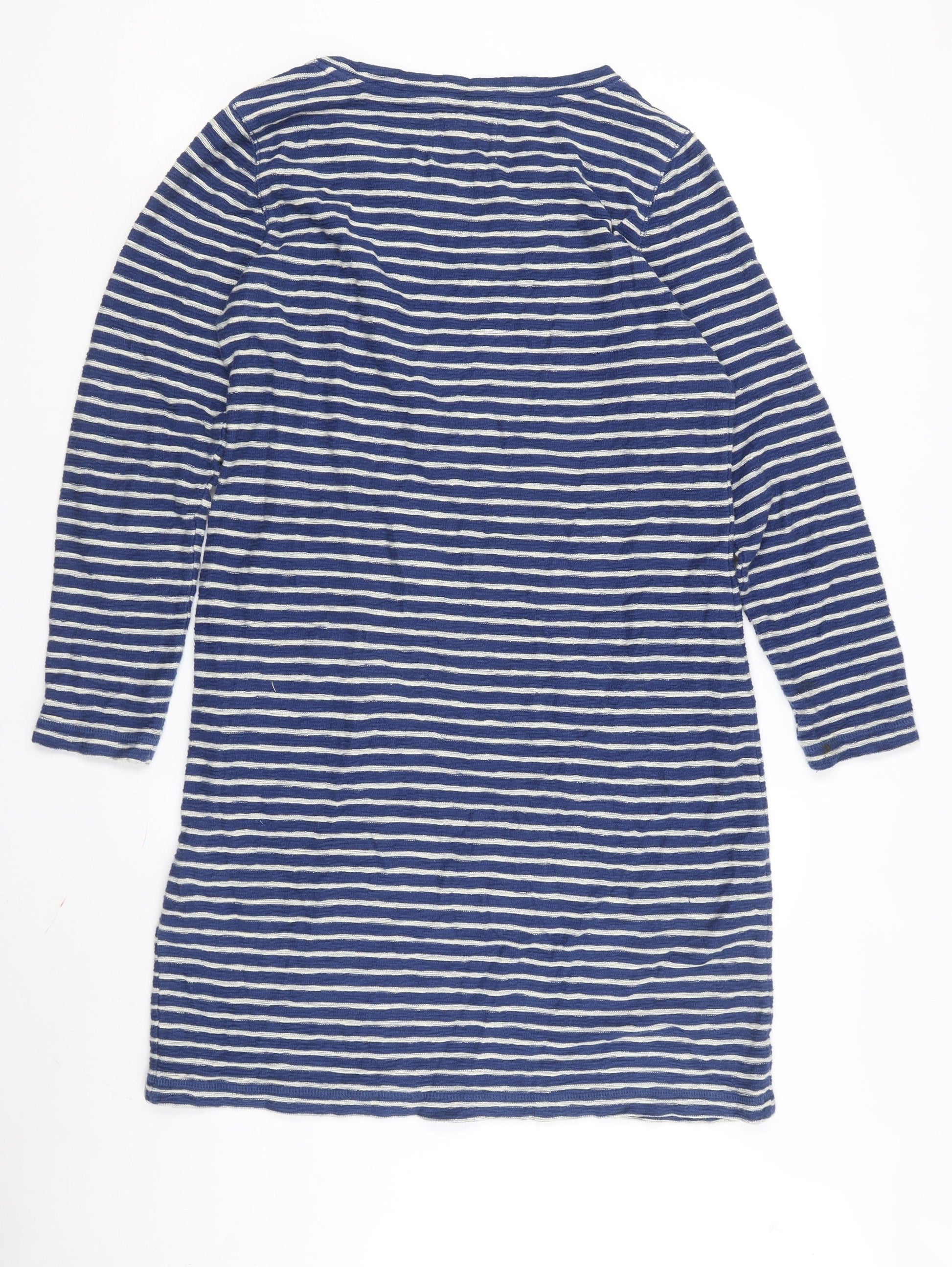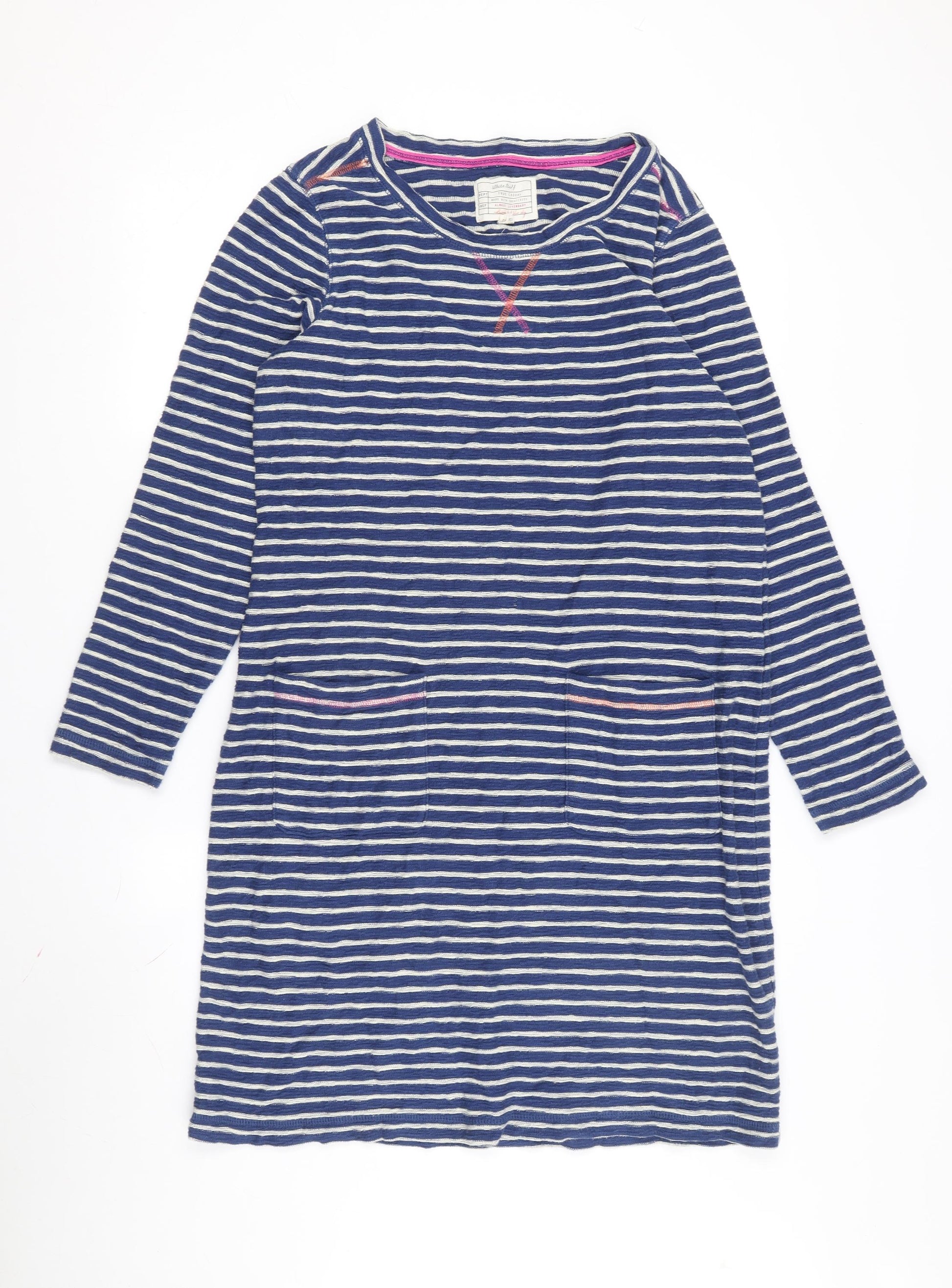 Step into classic comfort with this White Stuff Women's Blue Striped Shift Dress. Crafted from a soft blend of 60% cotton and 40% viscose jersey fabric, this dress offers a relaxed, comfortable fit perfect for everyday wear. Designed in a flattering shift style, it falls to knee length making it an ideal choice for both casual outings and relaxed office days. The dress features a timeless striped pattern in shades of blue, adding a touch of nautical charm to your wardrobe. Its long sleeves offer added warmth and coverage, making it suitable for both spring and autumn seasons. The crew neckline and raglan sleeve design provide a modern touch, while the pullover closure ensures convenience. Practical pockets add an element of functionality, making this dress not just stylish but also extremely wearable. This versatile piece is machine washable, making it easy to care for, while maintaining its excellent condition. A great addition to any wardrobe, it seamlessly blends with various accessories to suit different occasions. Don't miss the chance to own this quintessential White Stuff piece, perfectly combining style and comfort.
