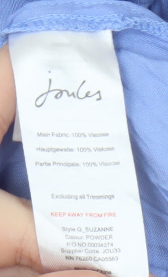 Elevate your casual wardrobe with this elegant blue blouse by Joules, designed exclusively for women. Crafted from 100% Viscose, this breathable and comfortable top features a flattering V-neckline with a stylish button closure. Its short, classic fitted sleeves make it a versatile piece perfect for everyday wear, ensuring you transition effortlessly from day to night. The solid blue hue creates a timeless aesthetic, while the woven fabric adds a touch of sophistication. This regular fit blouse is machine washable, combining convenience with style. Although used in excellent condition, light wrinkles are present, yet they do not detract from its charm. Whether you're dressing for a relaxed weekend outing or a casual workday, this Joules blouse promises comfort and elegance. Discover the perfect balance of style and practicality with this ideal wardrobe addition.