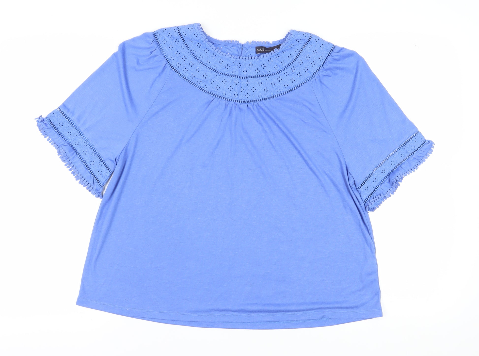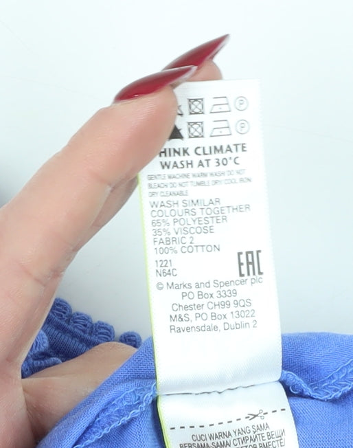 Elevate your everyday wardrobe with this delightful blue blouse from Marks and Spencer. Designed for the modern woman, this blouse offers a regular fit that flatters a range of body types. Crafted from a soft jersey fabric blend of polyester and viscose, it ensures comfort and breathability, making it perfect for warm summer days. Intricate crochet accents adorn the round neckline and flutter sleeves, adding a touch of elegance to this basic style. Ideal for casual occasions, pair it with your favourite jeans or skirt for an effortlessly chic look. The solid blue colour provides a versatile piece that matches seamlessly with a variety of outfits. Additionally, the blouse is machine washable, offering convenience and ease for busy lifestyles. Whether you're heading to a garden party or a weekend outing, this Marks and Spencer blouse is a must-have addition to your wardrobe. In excellent condition and priced at a fantastic value, it promises not only style but also quality and durability. Don't miss out on the opportunity to own this beautiful piece that exudes charm and sophistication. Perfect for adding a pop of colour and finesse to your clothing collection, while keeping your style simple and chic.
