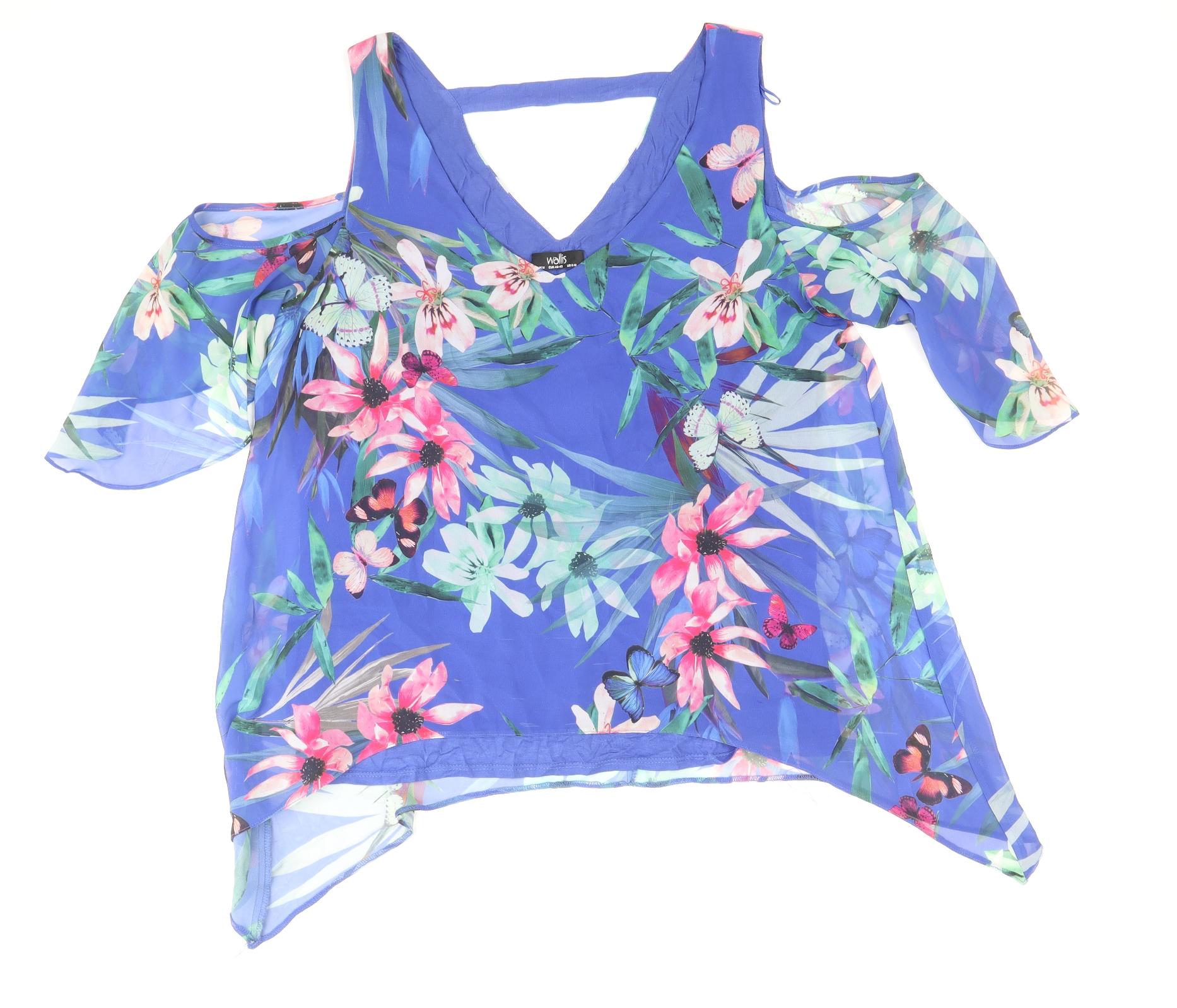Womens Blue Floral Polyester Cropped T-Shirt Size M V-Neck