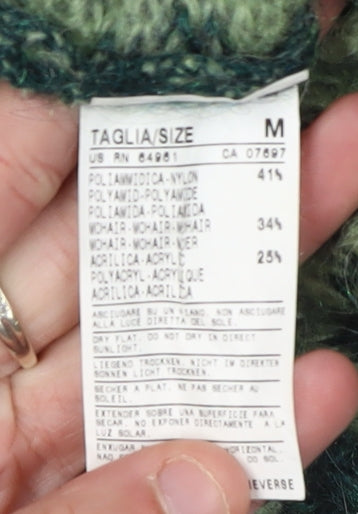 Introducing the Sisley Women's Green Geometric Jumper Dress, an embodiment of chic style blended with winter warmth. Perfect for the modern woman who appreciates a comfortable yet fashionable wardrobe choice, this dress is crafted with a unique blend of materials consisting of 41% Nylon, 34% Mohair, and 25% Acrylic. Fashioned in a rich green hue, this dress features a sophisticated geometric pattern that adds an element of intrigue to your ensemble. With a flattering V-neckline and long sleeves, it offers a classic yet contemporary look that is suitable for both autumn and winter occasions. Designed in a regular size fitting, this medium-sized dress is perfectly tailored for a snug but comfortable fit, ensuring a style that flows naturally with your body. The knit fabric provides an extra layer of comfort, making it a charming choice for casual outings or cozy indoor gatherings. Easy to maintain with its hand wash care instructions, the Sisley Jumper Dress combines practicality with style. Though used, it remains in excellent condition with light wear visible, offering a sustainable fashion choice for eco-conscious individuals. Make a statement in casual settings with this lightweight and breathable dress, a testament to Sisley's commitment to high-quality fashion. Whether paired with boots for a casual day look or accessorized for a more refined appearance, this versatile Jumper Dress is a standout piece in any wardrobe, promising to keep both style and comfort at the forefront.