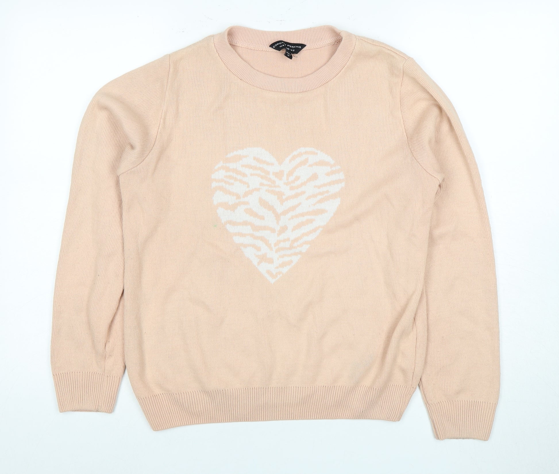 Embrace style and comfort with this charming pullover jumper by Dorothy Perkins. Designed for women, this one comes in a flattering shade of pink with a standout animal print heart across the front, bringing a touch of playful elegance to your wardrobe. Crafted from 100% cotton, this knit garment promises all-day comfort with its regular fit and soft texture. It features a classic crew neckline and long sleeves, making it ideal for casual outings or a cozy day in. Seamlessly machine washable, this lightweight jumper leaves no hassle in upkeep. Note that this piece is in excellent condition, with only slight creasing visible, retaining its charm for every occasion. A must-have for those who seek both style and ease in their collection.