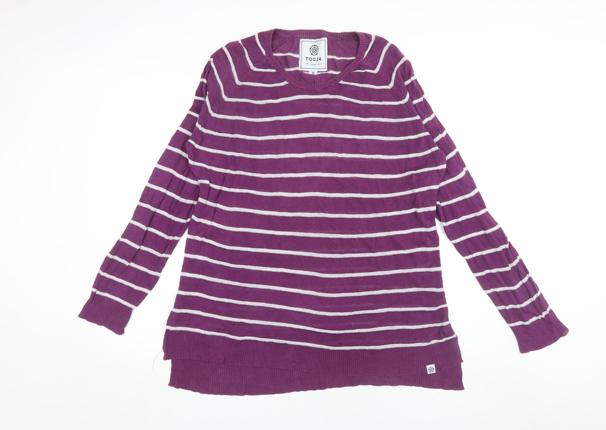 Elevate your wardrobe with the TOG24 Women's Pullover Jumper, perfect for adding a pop of colour to your everyday style. Designed with a vivid purple hue and classic striped pattern, this jumper is your go-to piece for casual outings or cosy evenings at home. The crew neckline and long sleeves provide a timeless silhouette, while the soft knit fabric ensures maximum comfort and warmth during cooler months. Expertly crafted from a luxurious blend of linen and cotton, this jumper offers breathable comfort and durability. Its machine-washable quality makes it easy to maintain, keeping your style as fresh as ever. Whether you're pairing it with jeans and trainers for a laid-back look or layering it over a contrasting shirt for an added dimension, this TOG24 jumper is a versatile addition to any wardrobe. With its excellent condition, this piece promises both style and quality, making it a worthy investment for the fashion-conscious. Snag this must-have jumper and step out in confidence, wrapped in comfort and style.
