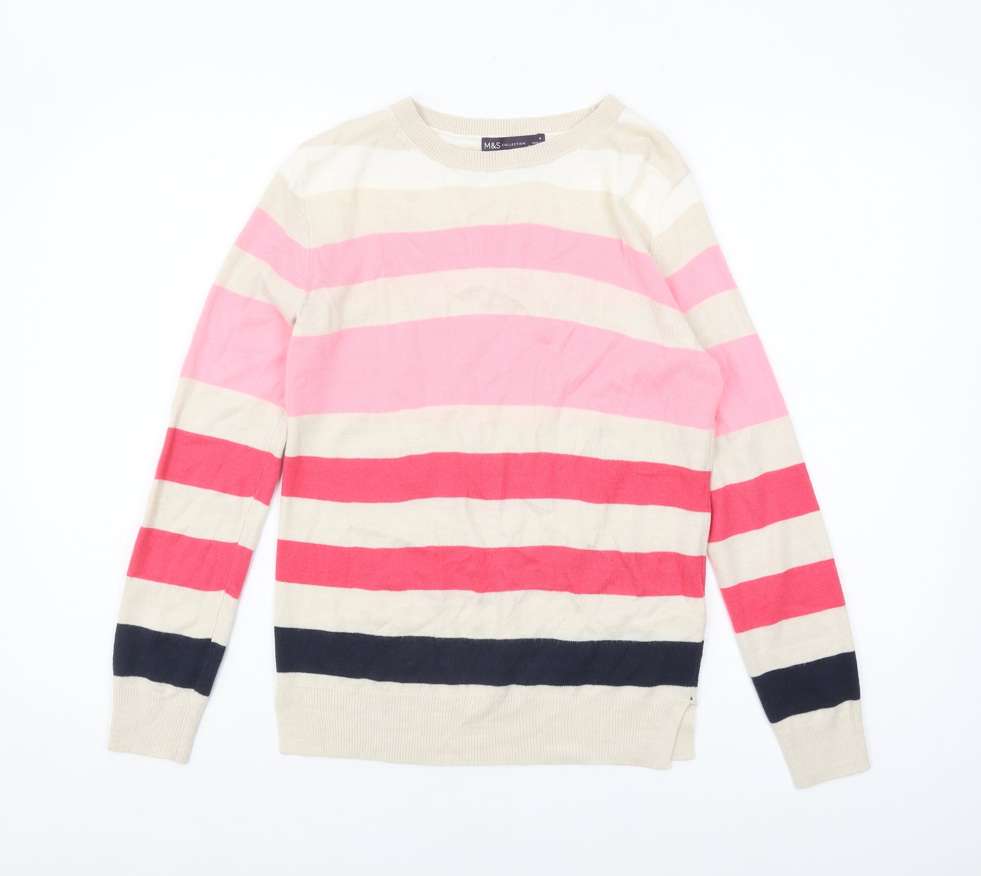 Enhance your wardrobe with this vibrant Marks and Spencer Women's Striped Crew Neck Jumper. Perfect for the style-savvy woman, this pullover brings a pop of colour to any outfit with its eye-catching multicoloured striped pattern. Crafted from 100% acrylic, it offers a cosy, lightweight feel that's ideal for layering during any season. The long sleeves and crew neck design ensure a snug and comfortable fit, making it a must-have for relaxed outings or casual gatherings. The jumper's easy-care, machine washable fabric means maintaining its crisp, polished look is simple and convenient. Whether paired with your favourite jeans for a casual day out or dressed up with a skirt for a coffee date, this versatile piece is sure to make a stylish statement. Don't miss the chance to own this classic yet contemporary jumper, available in size 6 to perfectly fit and flatter. Transform your everyday ensemble and embrace the chic charm of this Marks and Spencer jumper. Grab it now and step out with confidence.