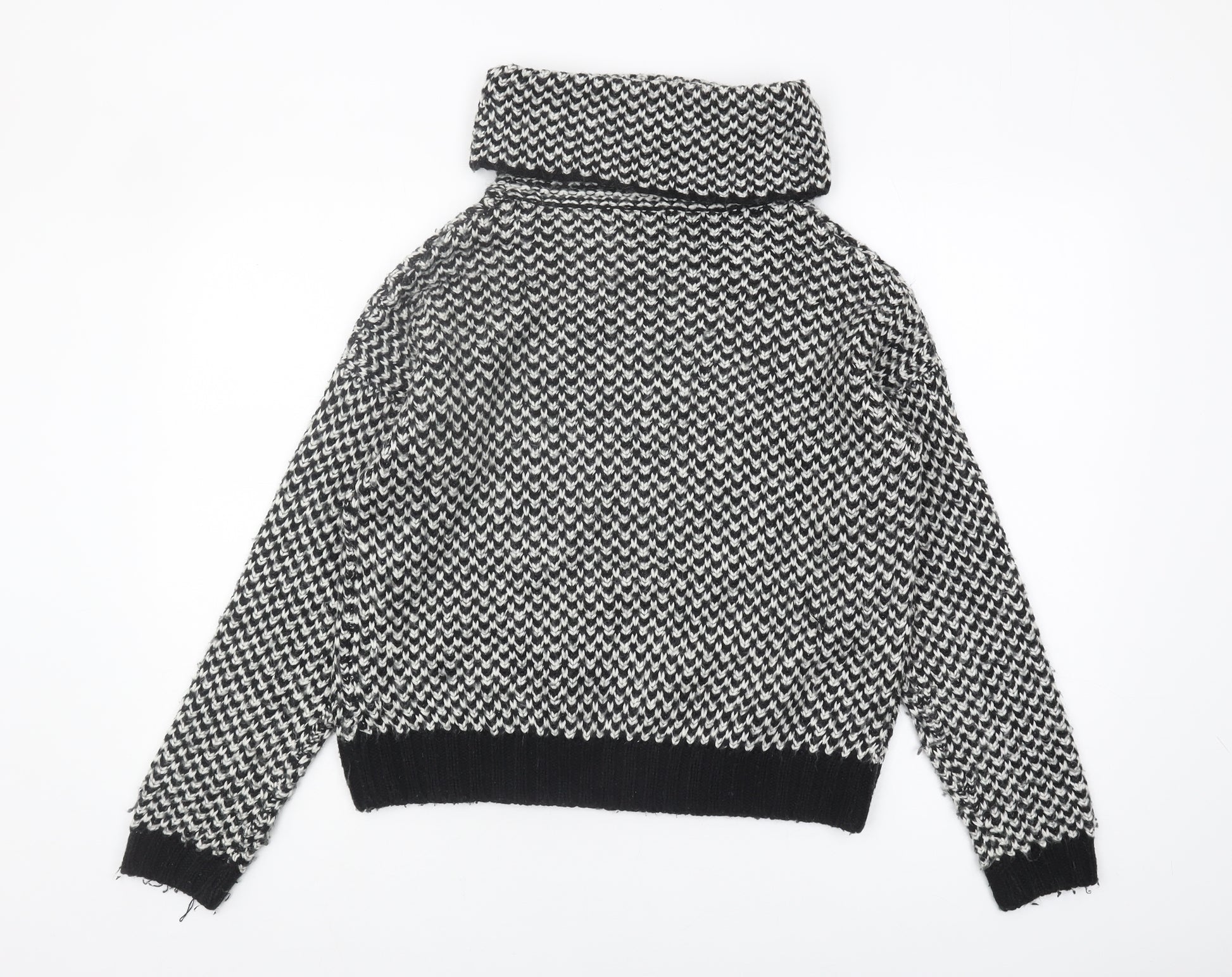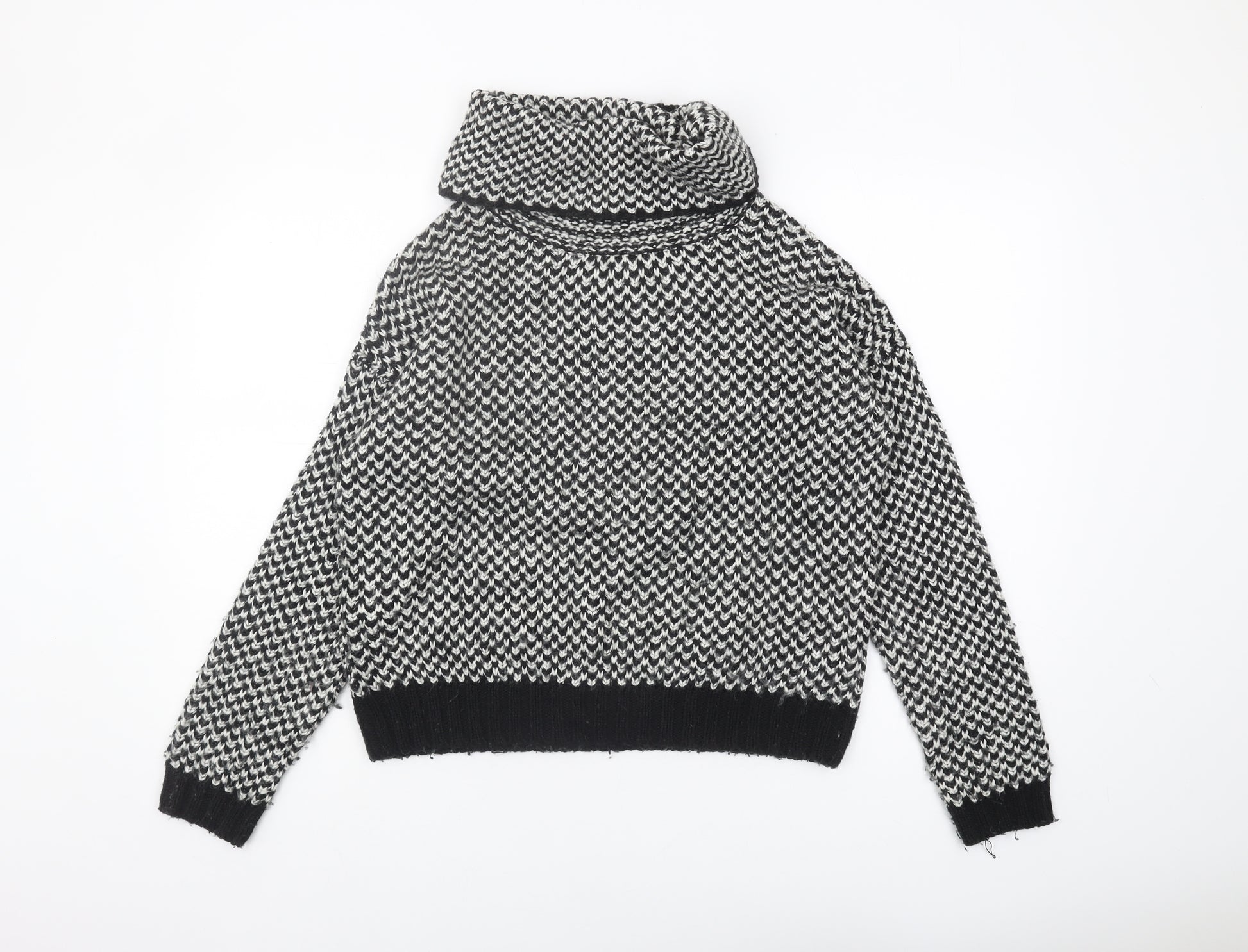 Embrace the cold season with this classic New Look Women's Jumper in size M. Designed with a striking geometric pattern, this pullover features a chunky-knit style, offering both warmth and style in the colder months. The cowl neckline adds an elegant touch, while the long sleeves enhance its utility during winter. Crafted from 100% acrylic, it provides a comfortable fit for regular wear. With its black colour, this jumper pairs effortlessly with any casual outfit, making it a versatile piece for your wardrobe. Enjoy its machine washable fabric for easy garment care, ensuring it becomes your go-to piece for casual occasions. This heavyweight jumper is perfect for cozying up on a chilly day or stepping out in style, maintaining a chic appearance with minimal effort. Despite being pre-owned, it is in excellent condition, ready to deliver warmth and premium comfort to your fashion collection. Elevate your winter look with this timeless knitwear piece, securing both comfort and a touch of elegance effortlessly. Make this sophisticated, classic jumper a staple in your wardrobe today.