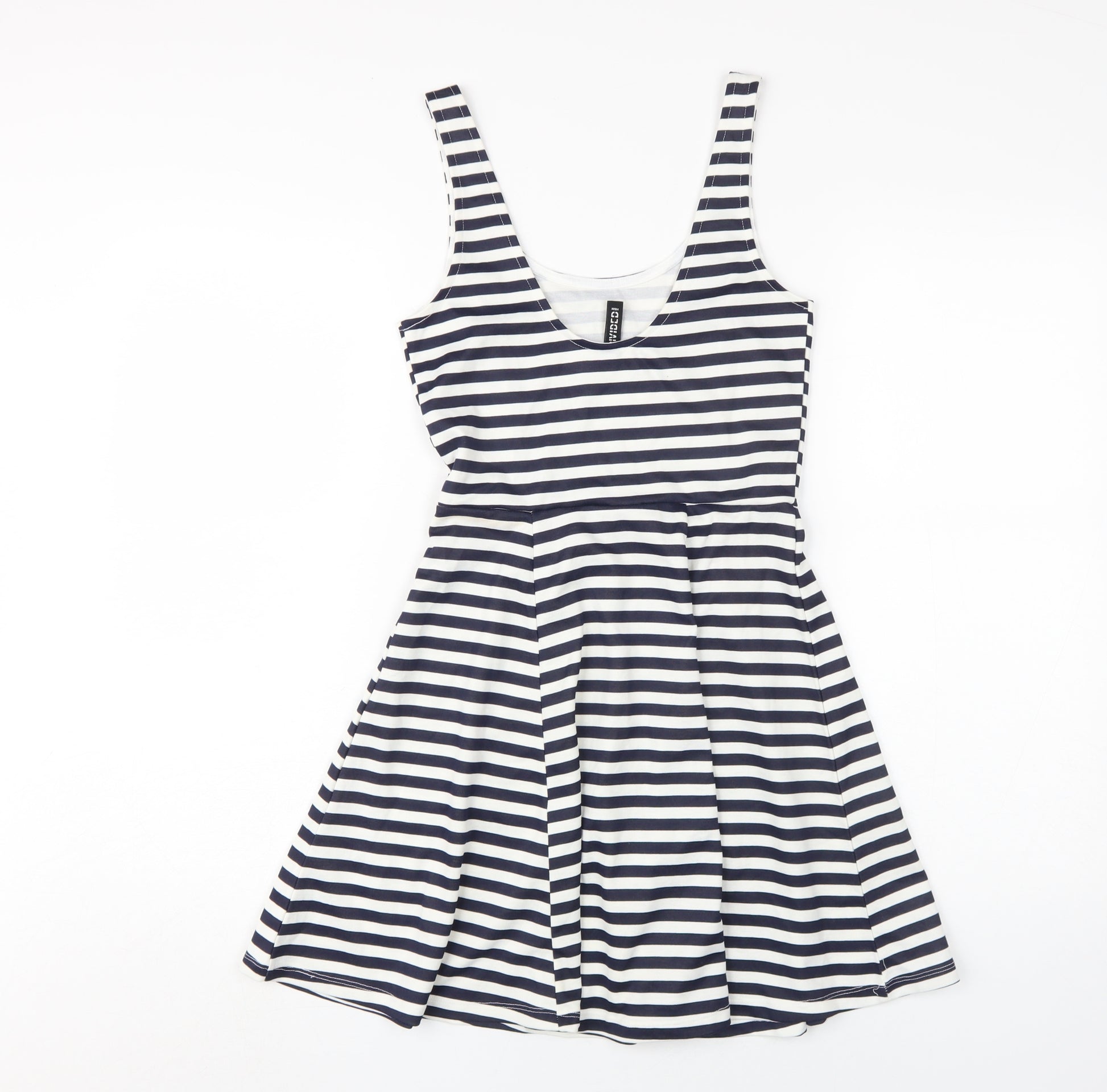 Step into the perfect blend of style and comfort with this charming H&M women's skater dress. Adorned with classic white stripes, this dress conveys a chic nautical vibe ideal for casual outings and cocktail parties alike. The knee-length cut and strappy sleeveless design ensure you stay cool and chic during the warmer summer days. This dress flaunts a flattering scoop neckline that perfectly complements the relaxed A-line silhouette. Crafted from a soft jersey fabric blend of 95% polyester and 5% elastane, the dress offers a gentle stretch perfectly moulding to your shape while providing ultimate comfort. Whether you're attending a garden party or taking a leisurely weekend stroll, this dress will have you looking effortlessly stylish with ease. Pair it with sandals for day-ready looks or elevate the ensemble with wedges for a sensational nighttime appeal. It's machine washable, which ensures low-maintenance care. Displaying minimal signs of wear, this dress still holds a pristine appearance without any noticeable flaws. Embrace the carefree charm and classic elegance with H&M's iconic skater dress.