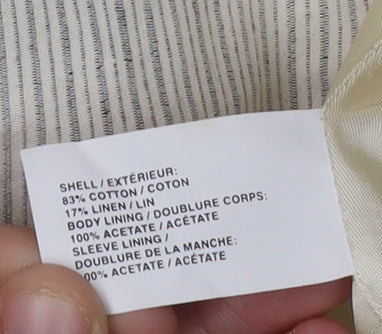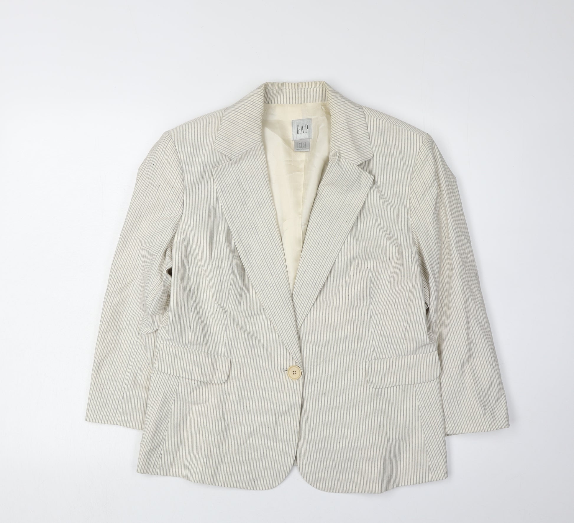 Dive into sophistication with this timeless Gap Women's Blazer in an elegant ivory hue. Designed for the modern woman, this piece is tailored to perfection with a regular fit that flatters the silhouette. Crafted predominantly from cotton with a touch of linen, its woven texture provides comfort while maintaining style. Adorned with an understated pinstripe pattern, it features a classic notch lapel and a practical one-button closure, making it an ideal choice for formal occasions or sprucing up casual attire. The blazer is fully lined, enhancing its durability and ensuring a smooth fit over any outfit. Its long sleeves and single-breasted cut cater to a streamlined look, while the acetate lining adds an extra layer of luxury. Perfect for workwear or adding a chic twist to your everyday ensemble, this piece is set to become a wardrobe staple. Priced competitively, this excellent condition blazer offers you style and quality without the new price tag. Its minimalist yet stylish design proves that less is more, making it a versatile addition to your clothing collection. Experience the blend of practicality and elegance with Gap.