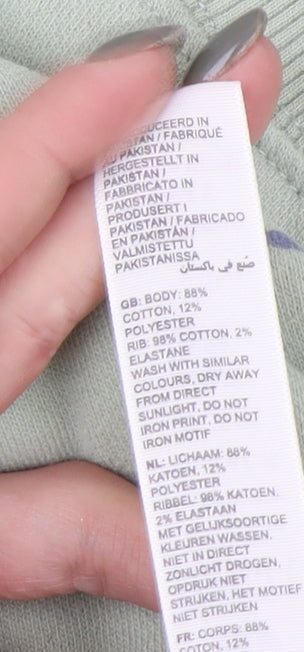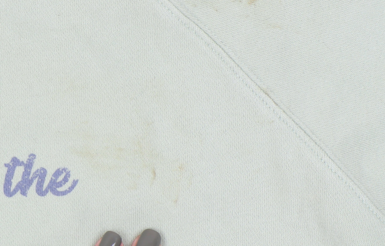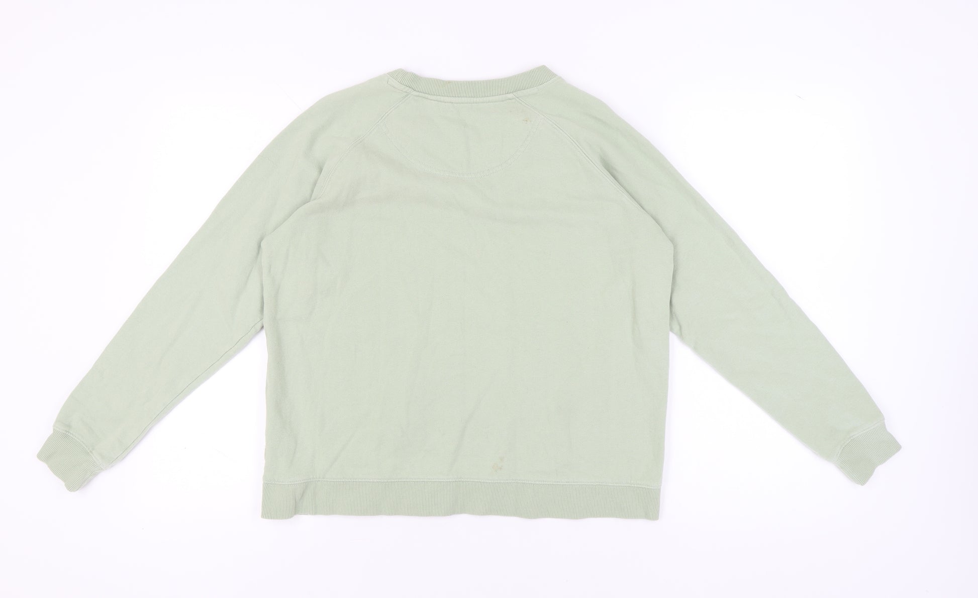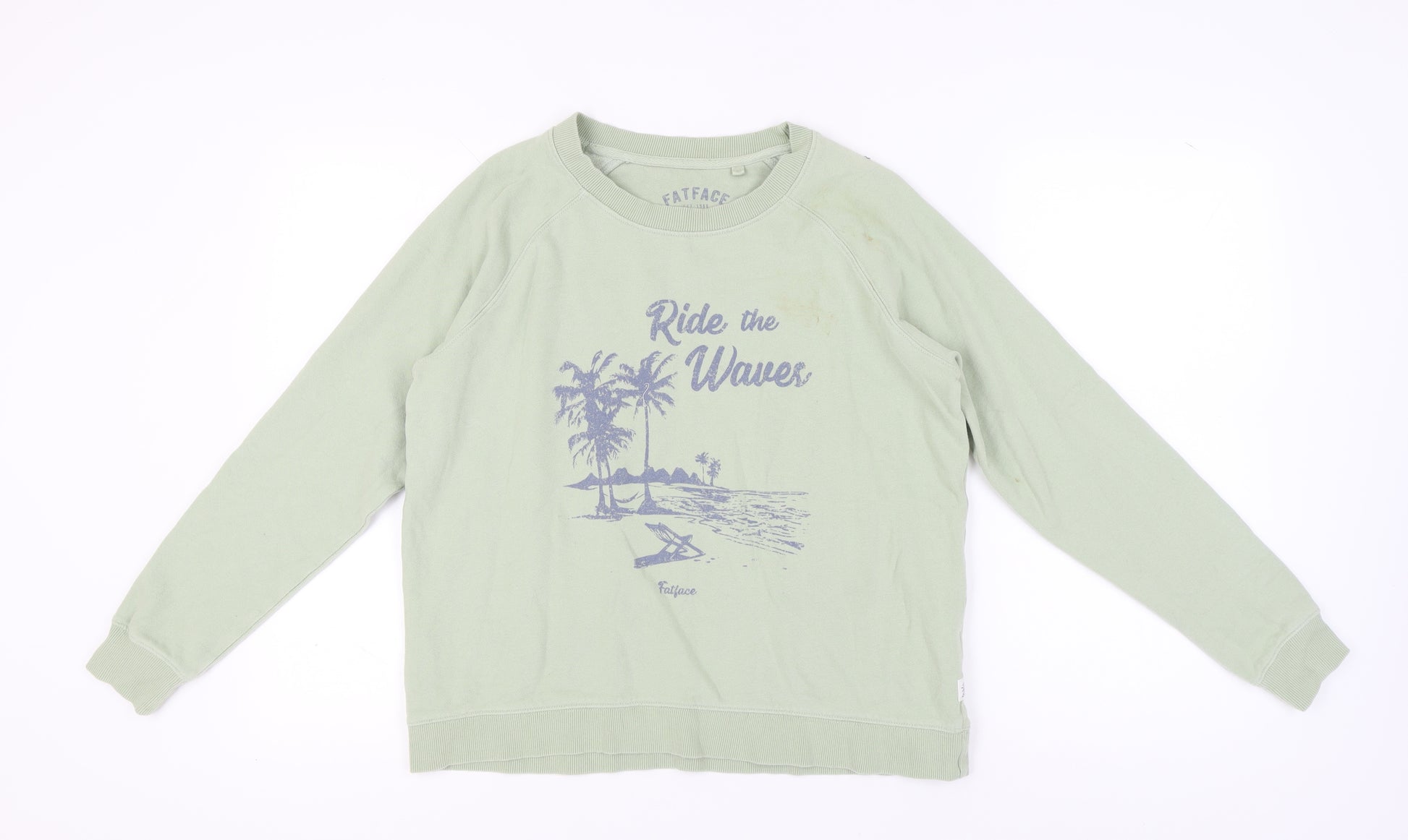 Elevate your casual wardrobe with this delightful FatFace women's pullover sweatshirt in a refreshing shade of green. Perfectly suited for relaxed days or a cozy evening out, this sweatshirt features a charming graphic print with a 'Ride the Waves' design, bringing a touch of fun and beach vibes to your look. Crafted from a comfortable jersey fabric blend of 88% cotton and 12% polyester, this regular-fit sweatshirt promises a comfortable wear that is both soft and breathable. With its long raglan sleeves and crew neck, it keeps style and ease in equal measure, making it a versatile piece for your spring and summer collection. Despite some light staining on the front, the sweatshirt remains in good condition and ready to be part of your favourite casual outfits. Suitable for casual outings, this sweatshirt is machine washable, offering practicality and ease of care. Experience the relaxed comfort and playful style with this FatFace pullover, a perfect choice for women seeking a stylish casual addition to their wardrobe.