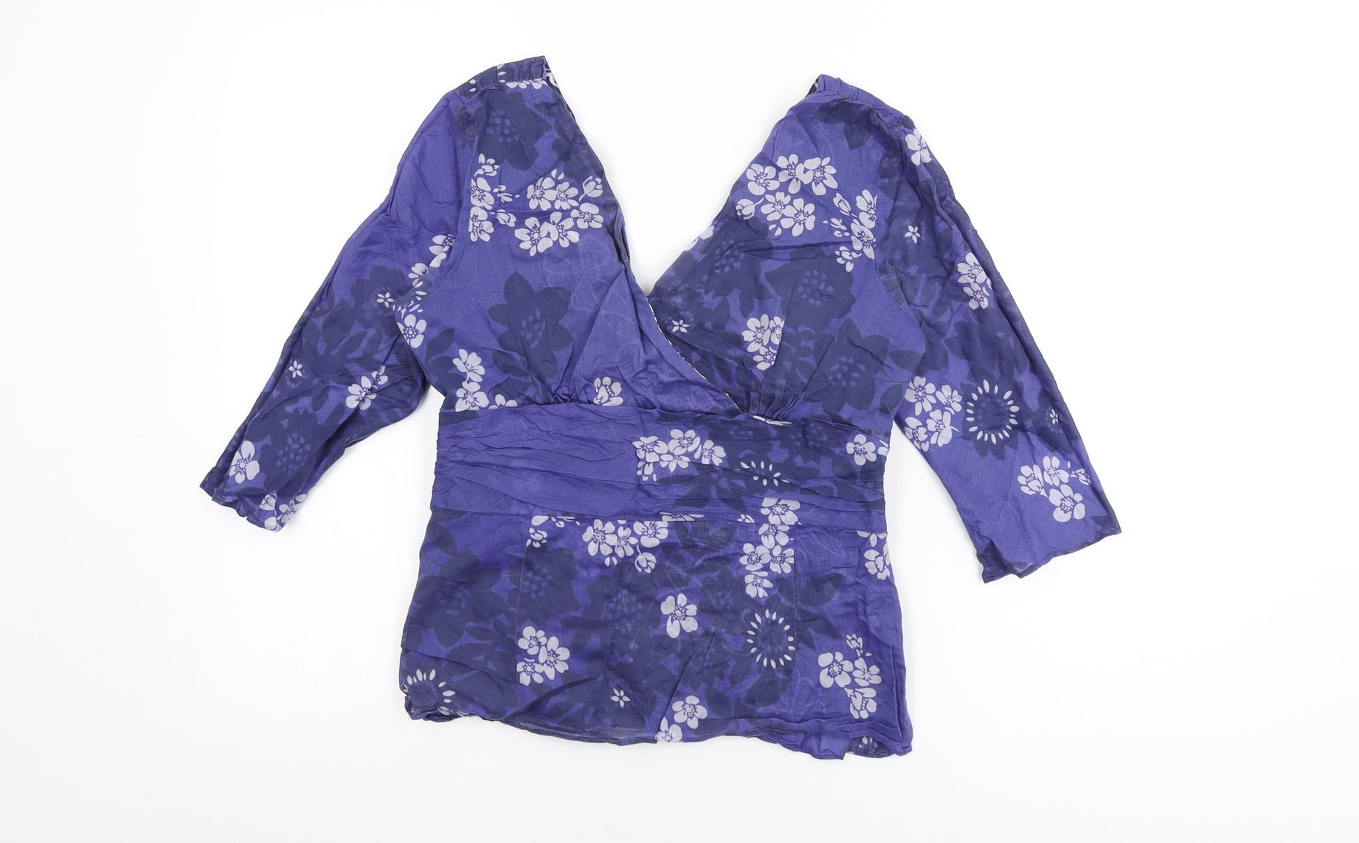 Womens Blue Floral Cotton Basic T-Shirt Size 12 V-Neck