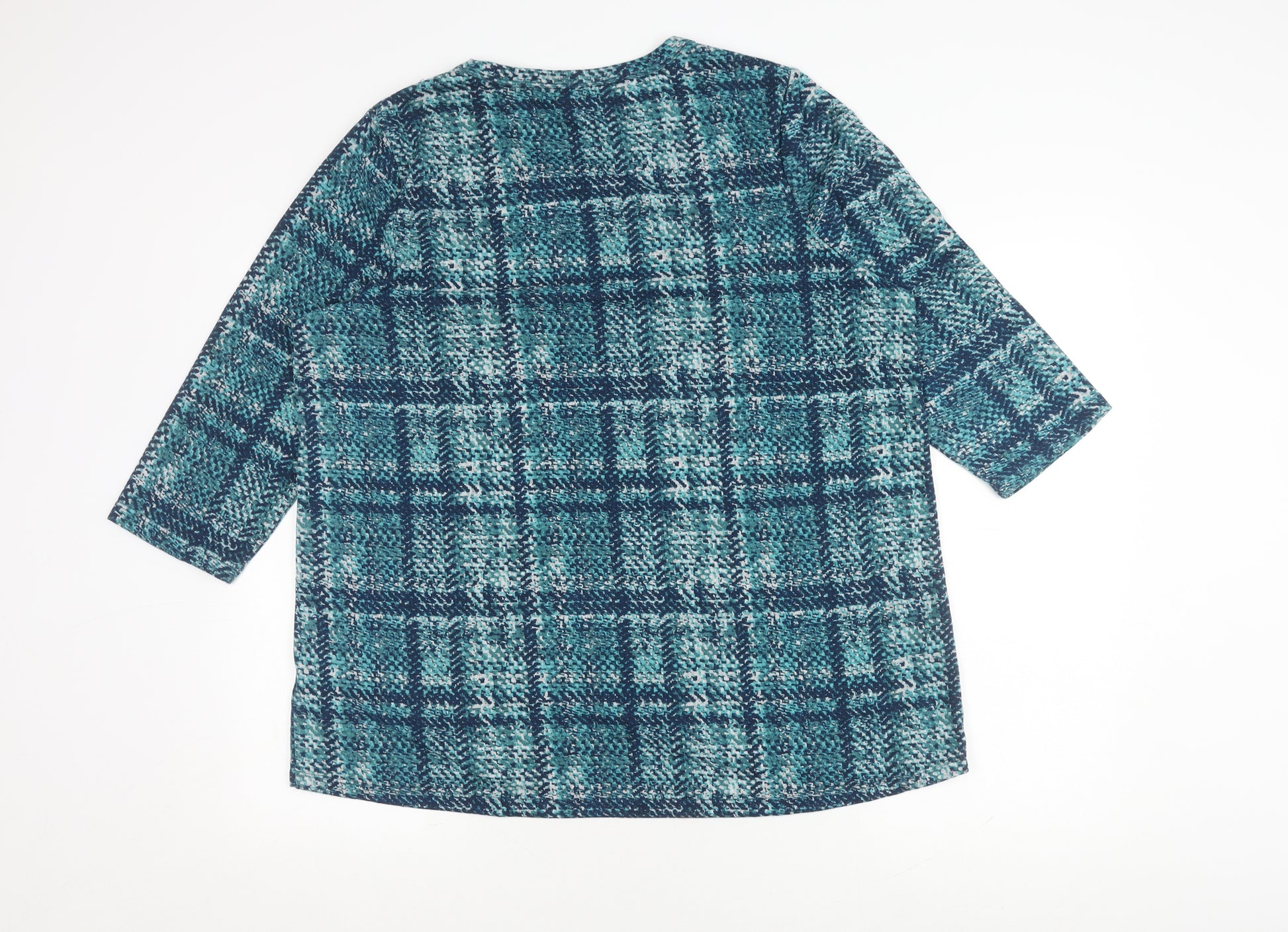 Add a stylish touch to your wardrobe with this vibrant multicoloured plaid top from Bonmarché, perfect for any casual outings. Crafted for the autumn and winter seasons, this piece features a classic round neckline and 3/4 sleeves to give you that relaxed, everyday look. The combination of polyester and elastane ensures comfort and a fit that complements your figure. Details like the button accents serve not only a practical purpose but also add a chic aesthetic to the top. Easily pairing with your favourite jeans or trousers, this regular-fit top stands out with its elegant plaid pattern. Despite being pre-owned, it's in excellent condition, ensuring durability and style throughout the season.