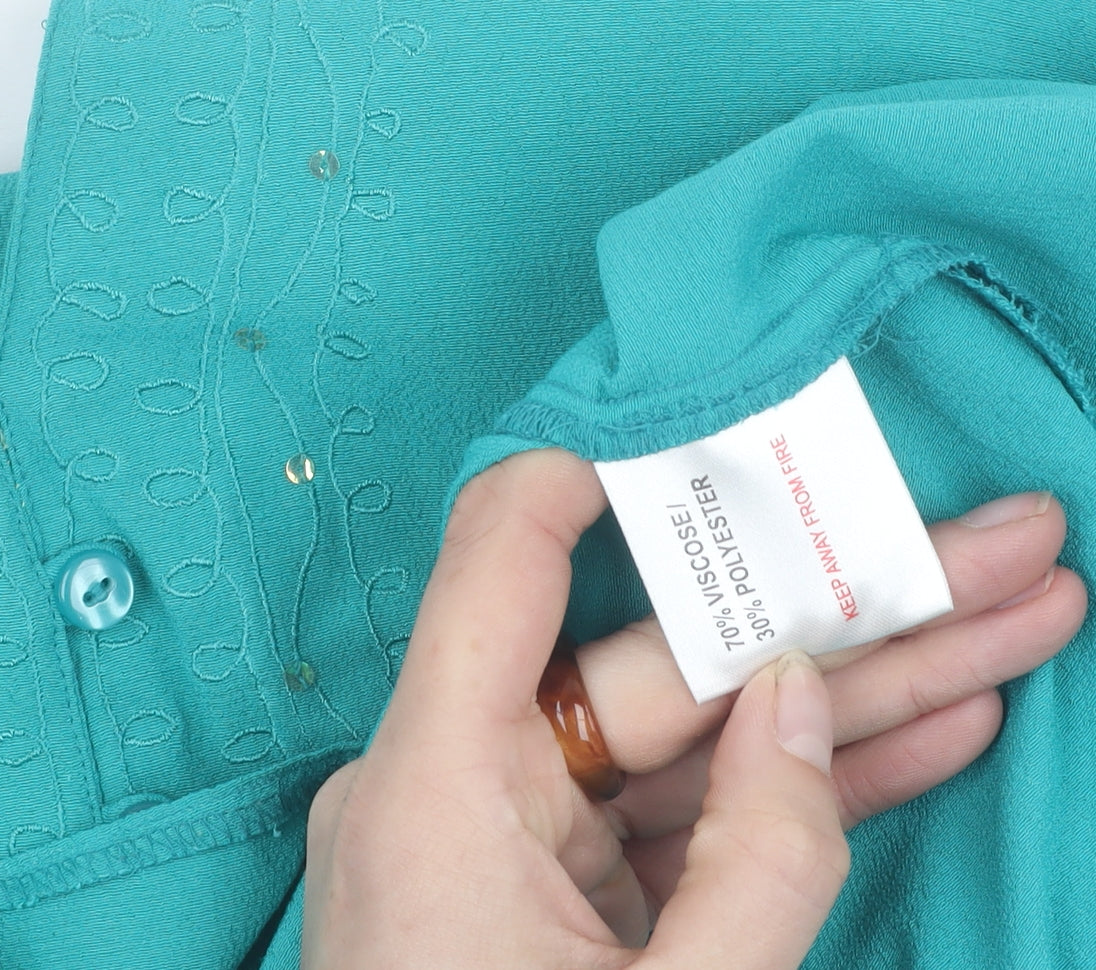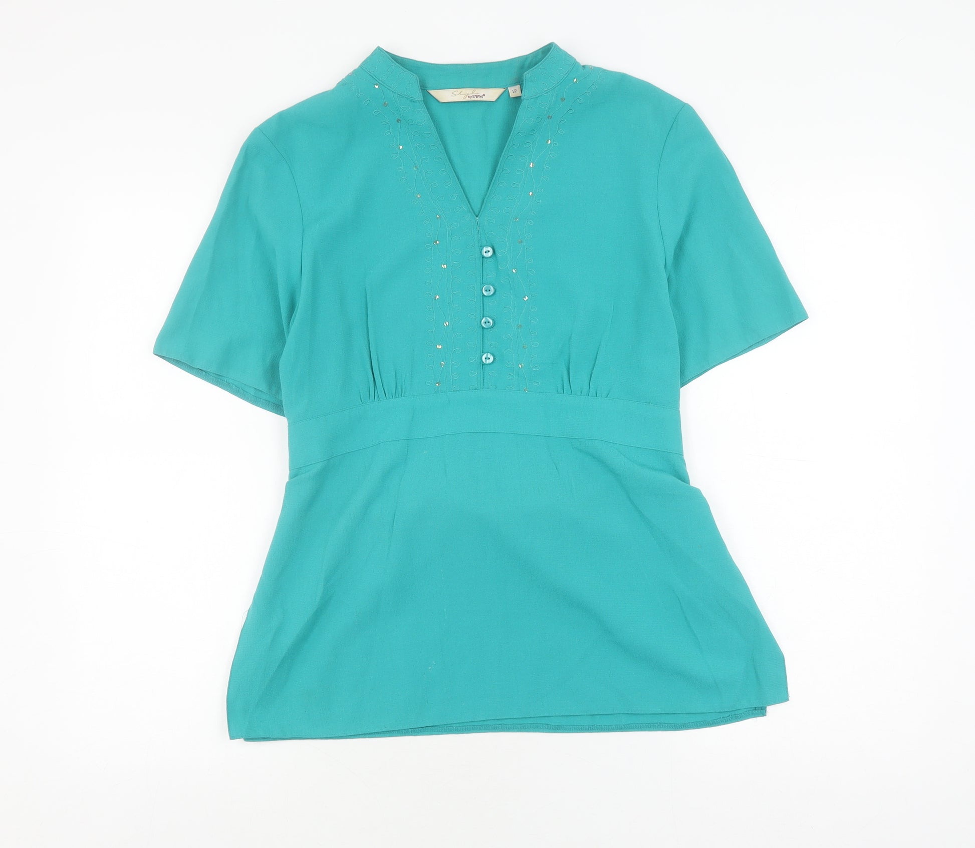 Elevate your everyday wardrobe with this elegant green blouse from Style by EWM, perfect for a variety of occasions. Crafted in a comfortable blend of 70% viscose and 30% polyester, this piece ensures both style and comfort. The regular fit design, coupled with its short sleeves and a flattering V-neckline, make it a versatile addition suitable for the modern woman. The solid green colour offers a splash of vibrancy to your wardrobe, easily pairing with jeans, trousers, or skirts. The blouse also features a button accent, adding a subtle touch of sophistication, and a belted waist, enhancing the silhouette with a feminine touch. Perfect for casual outings or a dressy affair, its regular size fit is complemented by a button closure, ensuring ease of wear. Despite being previously owned, it remains in excellent condition with no notable defects, promising to be a reliable staple that can transition from day to night with ease. Secure this Style by EWM blouse for a wardrobe classic that aligns with your fashion aspirations.