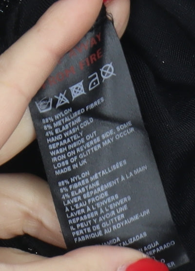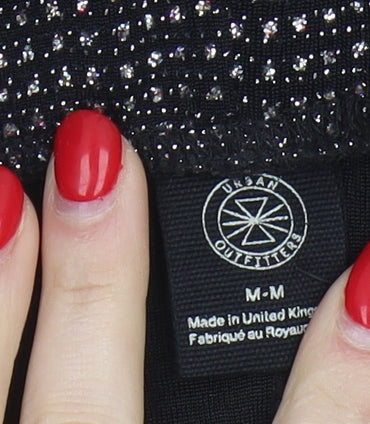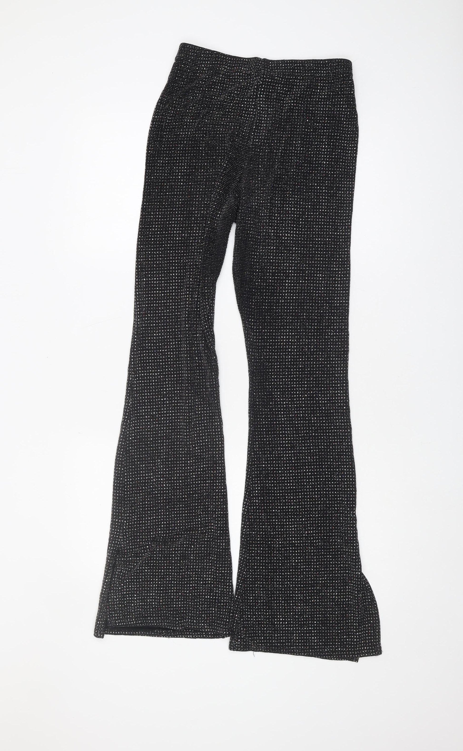 Discover effortlessly chic style with these Urban Outfitters women's flared trousers. In a sleek black hue, these trousers are perfect for adding a little sparkle to any outfit. Made predominantly from soft nylon with a hint of elastane for stretch, these trousers boast 88% nylon for ultimate comfort and 4% elastane for a flexible fit. The slight hint of metallic fibers adds a touch of glamour, making them ideal for evening occasions or casual daytime looks. Featuring a flared leg style, they offer a flattering silhouette, elongating your frame and providing a stylish throwback to classic designs. The trousers are hand wash only, emphasizing their delicacy and quality. Although condition is excellent, no visible signs of wear ensure a polished appearance every time. Perfect for women who appreciate a mix of comfort and elegance, these Urban Outfitters trousers promise to be a versatile addition to your wardrobe. Pair with a simple top for casual settings, or dress them up with a blouse and accessories for a night out. Complete with a flat front and a minimalist design, these trousers are as functional as they are stylish. Don't miss out on this opportunity to enhance your fashion collection with these timeless trousers.