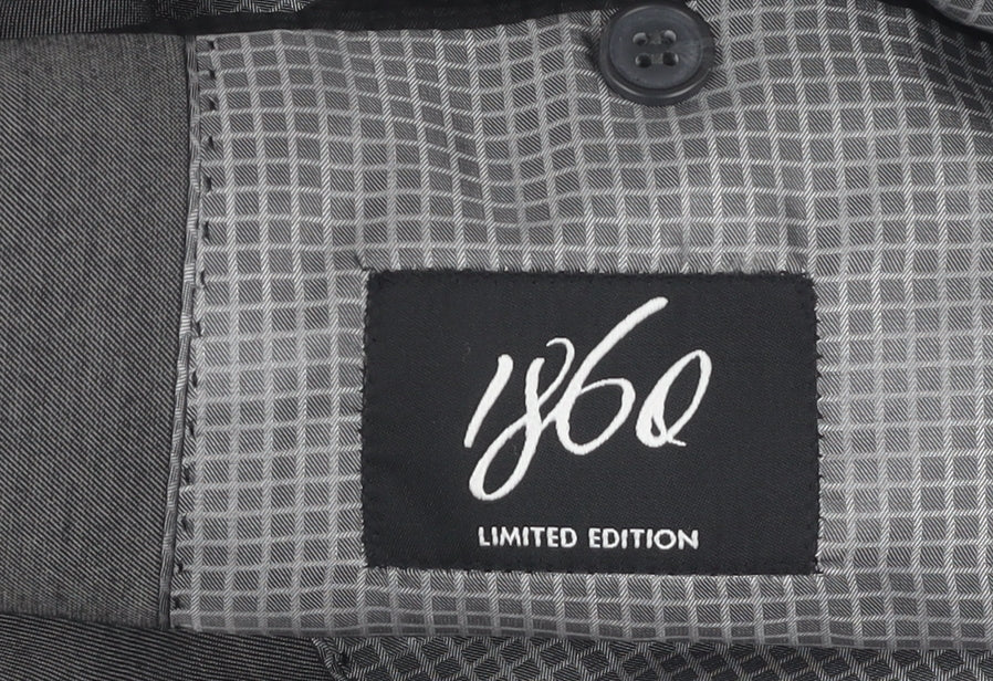Discover elegance and style with the 1860 Limited Edition Men's Grey Suit Jacket. This single-breasted jacket with a two-button front is perfect for business or formal occasions, making it a versatile addition to your wardrobe. Crafted from a high-quality blend of polyester and viscose, it offers durability and a smooth finish. The jacket features a notch lapel and a classic grey hue, allowing for easy styling with various shirts and ties. The double-vented back ensures comfort and a tailored fit, while four-button detailing on the sleeves adds a sophisticated touch. Practical inner pockets provide handy storage for your essentials. Though pre-owned, the jacket is in excellent condition with only slight wear evident. Ideal for autumn and winter, this suit jacket promises to keep you warm and stylish. Whether dressing up for a professional setting or a formal gathering, this jacket is sure to impress.