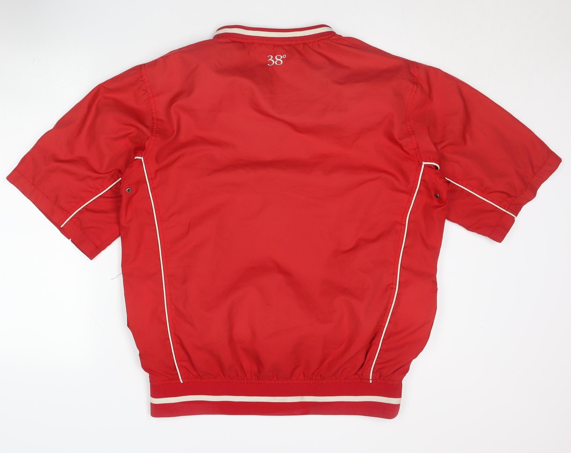 This men's 38 Degrees South red windbreaker jacket is a lightweight and stylish choice for activewear and casual wear alike. Designed with a clean, athletic silhouette, it features a short-sleeve construction ideal for spring or autumn outings where a layer is needed for wind protection without unnecessary bulk. The vibrant red colour makes a bold statement, while the white piping accents add a touch of contrast to the sporty aesthetic. Constructed from 100% polyester, the outer shell offers windproof protection thanks to the brand’s Nano Tech fabric technology, ensuring you remain shielded from breezes during outdoor pursuits. The woven polyester material delivers durability and ease of movement, making it perfect for light activity and everyday wear. It has a comfortable ribbed hem with twin white stripes, helping the jacket retain its fitted shape without restricting movement.Inside, the 38 Degrees South windbreaker offers a smooth polyester lining for a comfortable feel against the skin, while the relaxed fit ensures it pairs easily over light layers. The V-neck collar and short sleeves offer a unique look compared to traditional full-length jacket styles, making it a standout activewear choice. Ideal for transitional weather, the jacket works well for sporting activities, outdoor walks, or as a laid-back style piece on breezier days. Its machine washable fabric means low maintenance and long-lasting wear.In excellent condition with light signs of previous wear but no notable flaws, this pre-owned windbreaker represents fantastic value for money, particularly for those seeking a quality activewear jacket from a reputable brand without the high retail price tag. The overall style versatility means it can be worn with joggers, jeans, or shorts for a variety of casual looks.Add this vibrant and functional 38 Degrees South red windbreaker to your wardrobe for a blend of comfort, performance, and style.