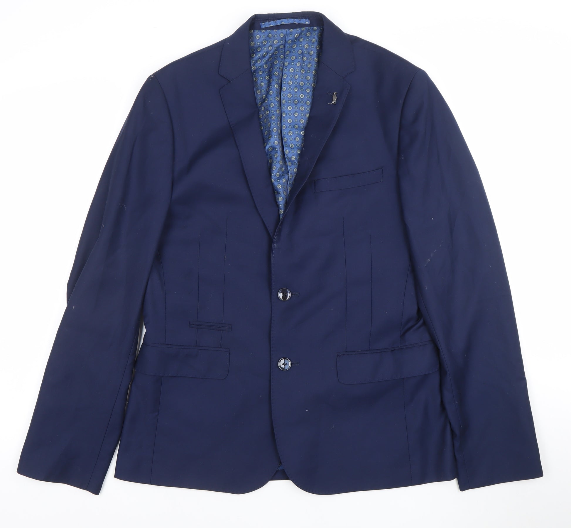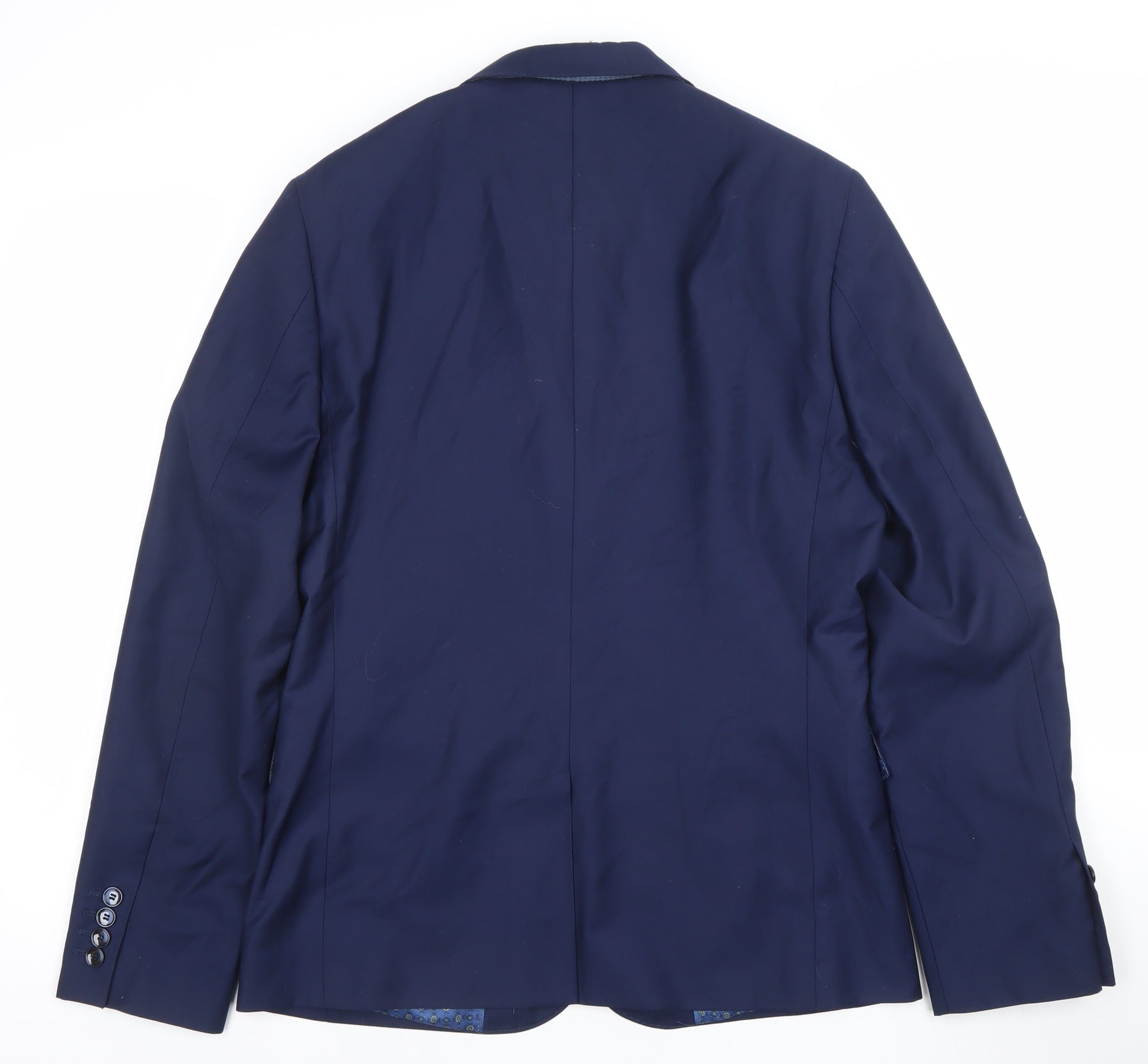 This 6th Sense Men's Blue Blazer is a timeless and versatile piece designed to offer both sophistication and practicality. Expertly crafted from a blend of 68% polyester and 32% viscose, the jacket provides a polished look while remaining breathable and comfortable for wear throughout different seasons, particularly spring and autumn. Made in a regular fit, it features a classic two-button front closure with a notched lapel, perfect for business meetings, formal events, or adding a refined touch to a smart-casual outfit. The interior showcases a smooth 100% polyester lining in an elegant geometric pattern, ensuring all-day comfort and durability. Thoughtfully designed with multiple inner pockets, this jacket conveniently accommodates essentials while maintaining a streamlined silhouette. Four buttons on each cuff and a double-vented back enhance comfort and mobility, while giving the blazer an updated modern appearance. The deep blue colour lends a universally appealing hue that pairs effortlessly with trousers, chinos, or jeans, adapting easily from formal wear to a stylish evening look. In excellent pre-owned condition with minimal signs of wear, this jacket has been well cared for and retains its shape and visual appeal. Ideal for men seeking a smart, classic layer that embodies confidence and style, this 6th Sense blazer is perfect as part of a two-piece suit or as a standalone jacket. Whether for the office, special occasions, or smart casual dressing, it brings a touch of effortless class to any wardrobe.
