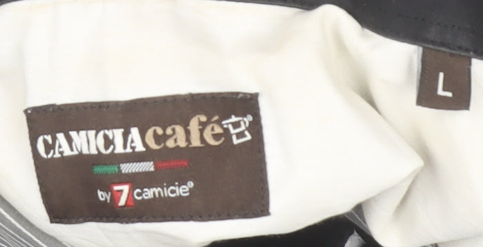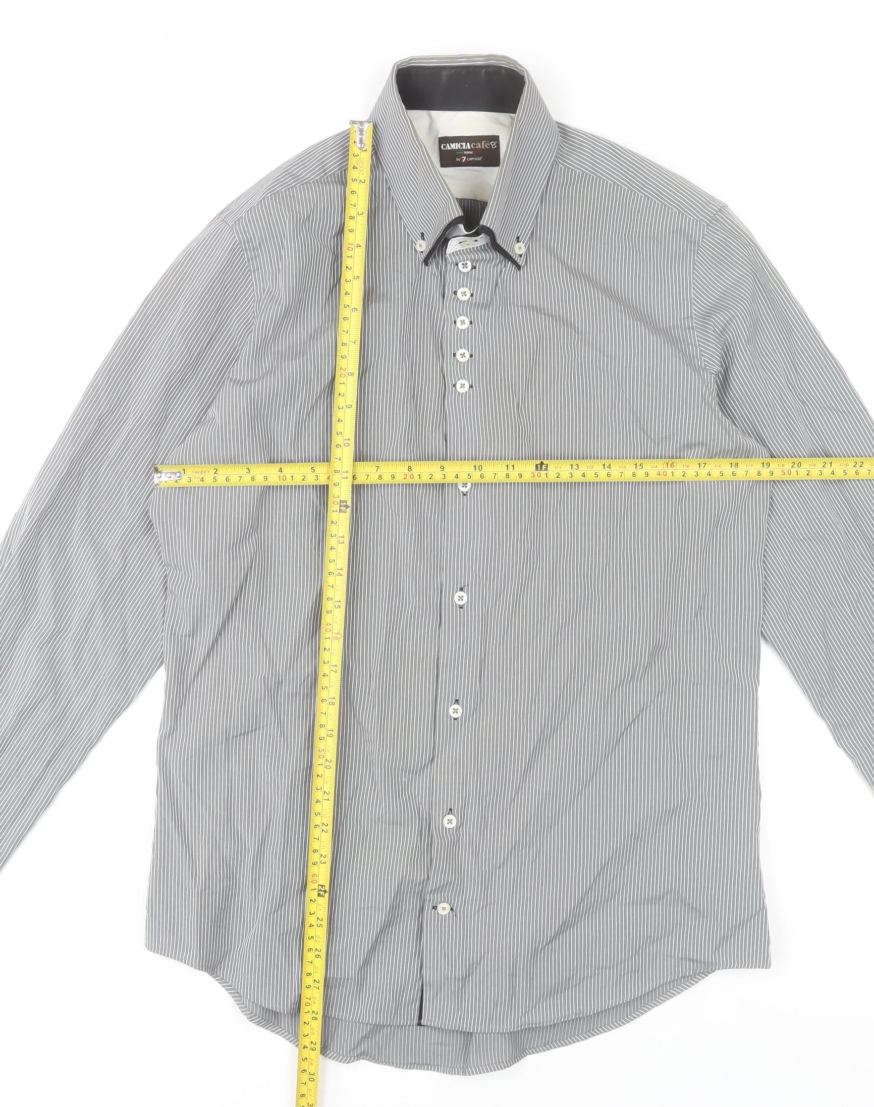 Elevate your formal and business wardrobe with this stylish men’s grey striped dress shirt from 7 Camicie. Crafted from a comfortable and durable blend of 65% cotton and 35% polyester, this shirt offers the perfect balance between breathability and ease of care. The woven fabric provides a smart, polished finish that keeps you looking professional and confident throughout the day. With its classic striped pattern, this shirt presents a timeless look that can be effortlessly matched with tailored trousers or a sharp suit. The button-down collar adds a refined touch, ensuring your appearance remains composed in both business and formal occasions. Featuring long sleeves with double-button cuffs, this design captures a sleek professional aesthetic without compromising on comfort. Designed in size Large with a measured chest size of approximately 55 cm and a shirt length of around 80 cm, this piece ensures a flattering fit for a range of builds. Its collared neckline and secure button closure ensure reliability while enhancing its smart-casual adaptability. Ideal for business, workwear, or more formal gatherings, this shirt transitions seamlessly to evening events when styled with a blazer or tie. Lightweight yet structured, it maintains its shape through daily wear while the cotton blend ensures softness against the skin. Offered in very good condition with only minimal signs of light wear and no visible damage, this shirt remains a versatile and reliable wardrobe essential. Perfect for professionals seeking a dependable staple or anyone looking to elevate their smart-casual collection, this piece from 7 Camicie represents accessible Italian tailoring with enduring appeal. A must-have addition to any discerning gentleman’s clothing selection.
