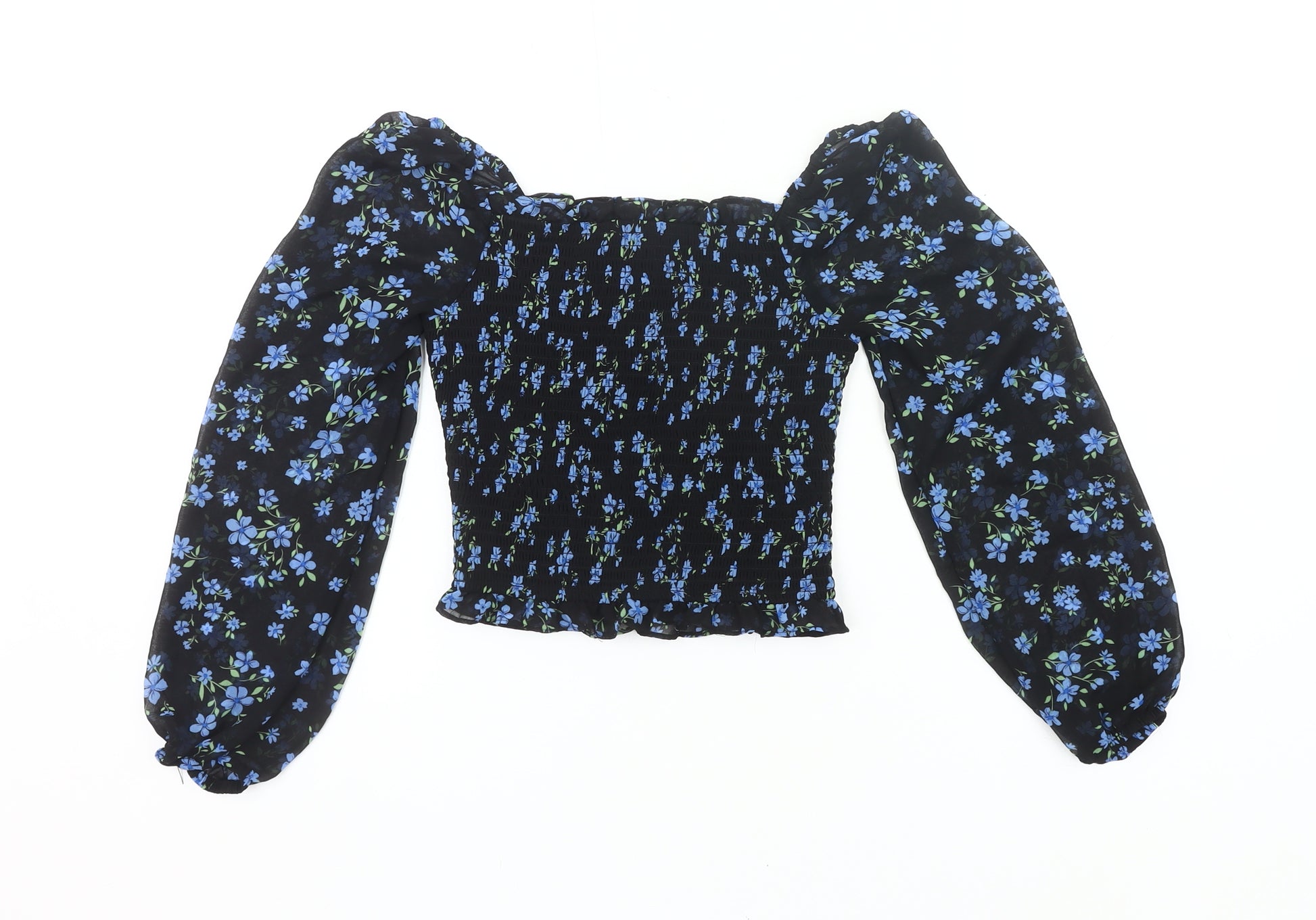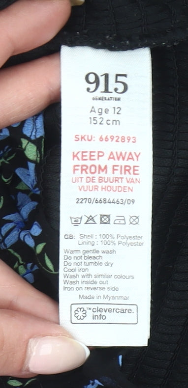 Add a stylish touch to your young girl’s wardrobe with this beautiful blouse from 915 Generation. Designed for age 12 years (152 cm), this cropped blouse is perfect for casual wear or parties and will quickly become a favourite. The black base is beautifully complemented by a delicate blue floral print, making it versatile while still eye-catching. Crafted from a lightweight chiffon-style polyester fabric, it offers a breathable and comfortable fit for spring and summer seasons. The blouse features an elegant square neckline and long sleeves with a soft, slightly puffed structure, enhancing the feminine shape. The shirred body provides a stretchable and comfortable fit, ensuring it moves easily while offering a flattering silhouette. At the hem, a subtle ruffled edge adds a delicate accent, making this piece perfect for festive occasions or everyday stylish moments. With its pullover closure, it is simple to wear, while the machine washable fabric ensures easy care for busy parents. Whether styled casually with jeans or dressed up with a skirt, this blouse is a versatile and charming addition to any collection. Condition is excellent, with no tags attached but in great wearable quality ready for a new home. A lovely piece that combines fashion and function for an effortlessly chic look.