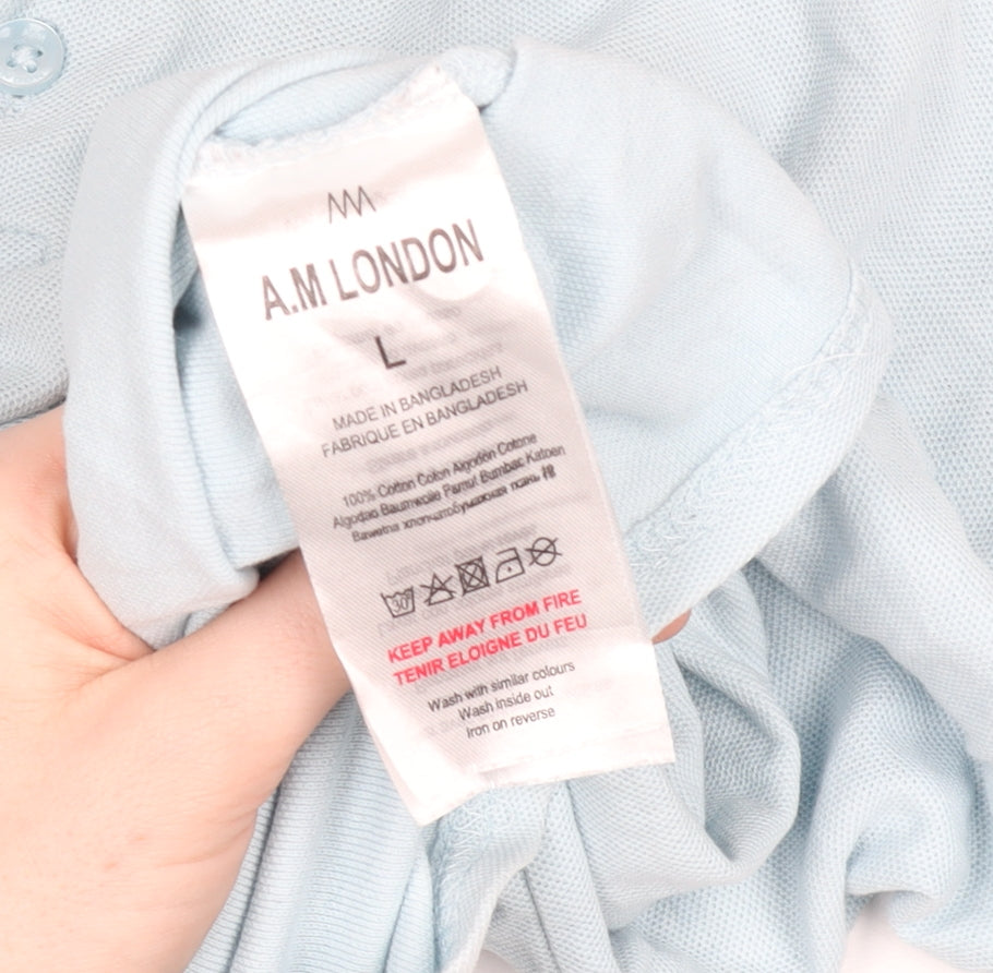 This A.M London men's polo shirt in size Large offers a perfect balance between timeless style and everyday wearability. Crafted from 100% cotton, it provides softness and breathability, perfect for warmer days or casual layering throughout the seasons. The light blue colour gives it a fresh, modern look that pairs effortlessly with jeans, chinos or shorts, making it a true wardrobe essential for smart-casual occasions. Featuring a classic button-down collar with contrast stripe detailing and a short sleeve design, this polo delivers an easy-going yet polished style that transitions smoothly from leisure to a more refined casual setting. The embroidered A.M London logo on the chest adds a subtle branded accent, while the solid collar and fitted finish enhance its versatile appeal. Designed for comfort and durability, this lightweight and breathable cotton polo ensures excellent wear throughout the day. Ideal for weekends, casual outings, or smart-casual work environments, it embodies a clean and modern aesthetic. The shirt has been gently worn with only light creasing visible, maintaining its overall very good condition. Machine washable for easy maintenance, this high-quality piece offers both practicality and dependability. Whether styled under a jacket or worn solo, its simplicity and quality construction make it a go-to option for any man’s wardrobe. A smart, versatile polo offering understated British charm from A.M London — a great value choice for everyday wear.