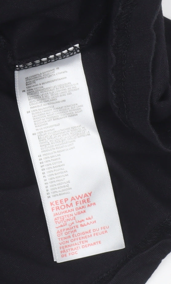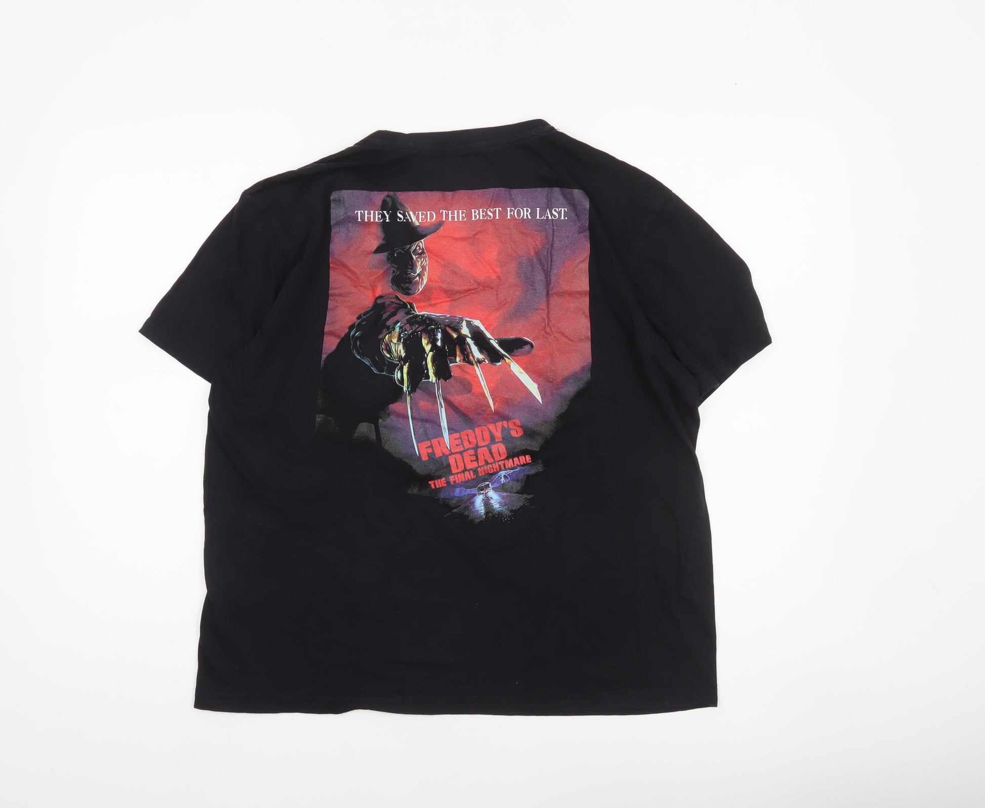 Step into iconic horror movie style with this officially licensed A Nightmare On Elm Street women's T-shirt. Perfect for fans of classic cult cinema, this black cotton tee showcases a bold front print featuring the instantly recognisable logo from the legendary horror series, while the back highlights a vibrant image of Freddy Krueger from 'Freddy's Dead: The Final Nightmare'. Made from 100% cotton with a soft and breathable jersey fabric, it guarantees comfort whether worn casually or styled as a statement piece. The regular fit ensures ease of movement, complemented by its crew neckline and classic short sleeves, making it ideal for layering or wearing alone. Designed for women who love a touch of nostalgia and pop culture flair in their wardrobe, this T-shirt captures the essence of retro horror aesthetic while staying comfortable enough for everyday wear. Perfect for autumn, spring, or summer seasons, it pairs effortlessly with jeans, leather jackets, or casual skirts for a laidback yet edgy look. Whether you're heading to a film marathon, a casual outing, or looking to showcase your love for 80s horror, this tee is a must-have collectible and fashion statement rolled into one. The lightweight, breathable cotton makes it perfect for day-long wear, while maintaining a high-quality printed design that celebrates vintage style. Its durable construction ensures lasting use, even with regular washing. Although gently used with some slight wear to the print, it's still in very good condition, offering timeless appeal at great value. Fans of horror, retro film memorabilia, or unique statement apparel will appreciate this well-crafted piece of classic cinema history. Bring home a wearable piece of fright-filled nostalgia that pays tribute to one of horror’s most enduring icons, and let your style scream personality and fandom wherever you go.