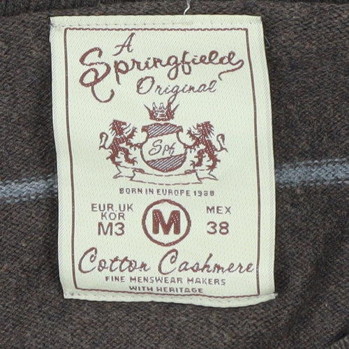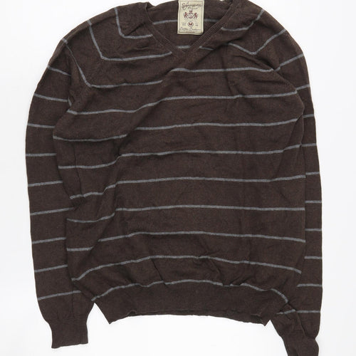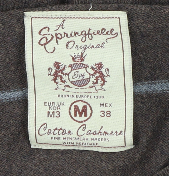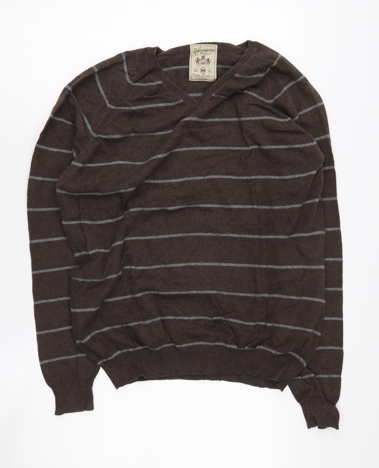 Elevate your wardrobe with this classic men’s V-neck pullover from A Springfield Original. Crafted in a rich brown hue, this medium-sized jumper is composed of a luxurious blend of cotton and cashmere, ensuring both comfort and durability. The lightweight knit fabric is perfect for year-round wear, making it an ideal choice for layering during the cooler months or as a stand-alone piece in spring and autumn.Featuring a striped pattern, the design adds a stylish edge, making it suitable for a variety of occasions, from casual outings to more relaxed business settings. The long sleeves provide ample coverage while maintaining flexibility and comfort throughout your day.Despite its chic appeal, please note there is a minor hole present, which reflects the overall condition rating of 'Good'. This offers a unique opportunity to add a high-quality jumper to your collection at a fantastic value.Whether dressing up for a night out or keeping it casual, this jumper is a versatile addition to any wardrobe. Pair it with your favourite trousers or jeans for an effortlessly stylish look. Don’t miss out on this rare find at an unbeatable price.