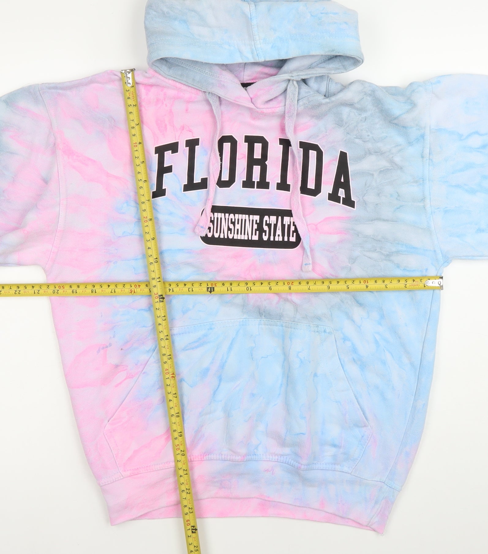Bring vibrant colour and comfort into your wardrobe with this multicoloured tie dye hoodie from A.U. Apparel. This women’s pullover hoodie, in size Small, is designed to combine casual style with easy wearability, making it a versatile choice for layering across seasons. Featuring a bold tie dye design in shades of blue and pink, this hoodie is eye-catching and perfectly suited for those who love standout casualwear. Made from a comfortable cotton and polyester blend, the fabric is soft against the skin while remaining durable enough for everyday wear. The addition of polyester ensures shape retention and easy care, while the high cotton content keeps the hoodie breathable and cosy. A classic drawstring closure at the hood allows adjustability, while the large kangaroo pocket adds both functionality and laid-back style. The bold “Florida Sunshine State” logo print across the chest enhances the graphic appeal, making this hoodie great for travel, lounging, or casual outings. The long sleeves with ribbed cuffs and a straight hem provide a comfortable fit, while the relaxed regular cut ensures freedom of movement. Designed with both practicality and style in mind, this hoodie can be worn across multiple seasons including Autumn, Winter, and Spring. Pair with jeans, joggers, or shorts depending on the season and occasion. This item is in very good condition with only light signs of normal wear and no significant flaws, preserving its bright colours and structure. Machine washable fabric makes it easy to maintain, ensuring ongoing freshness with minimal effort. Perfect for casual and travel occasions, this hoodie blends sporty charm with a bold, playful vibe. Whether heading to a college event, a weekend outing, or simply relaxing, this piece delivers both comfort and individuality. Add it to your wardrobe as a fun, stylish, and practical staple at an excellent price.
