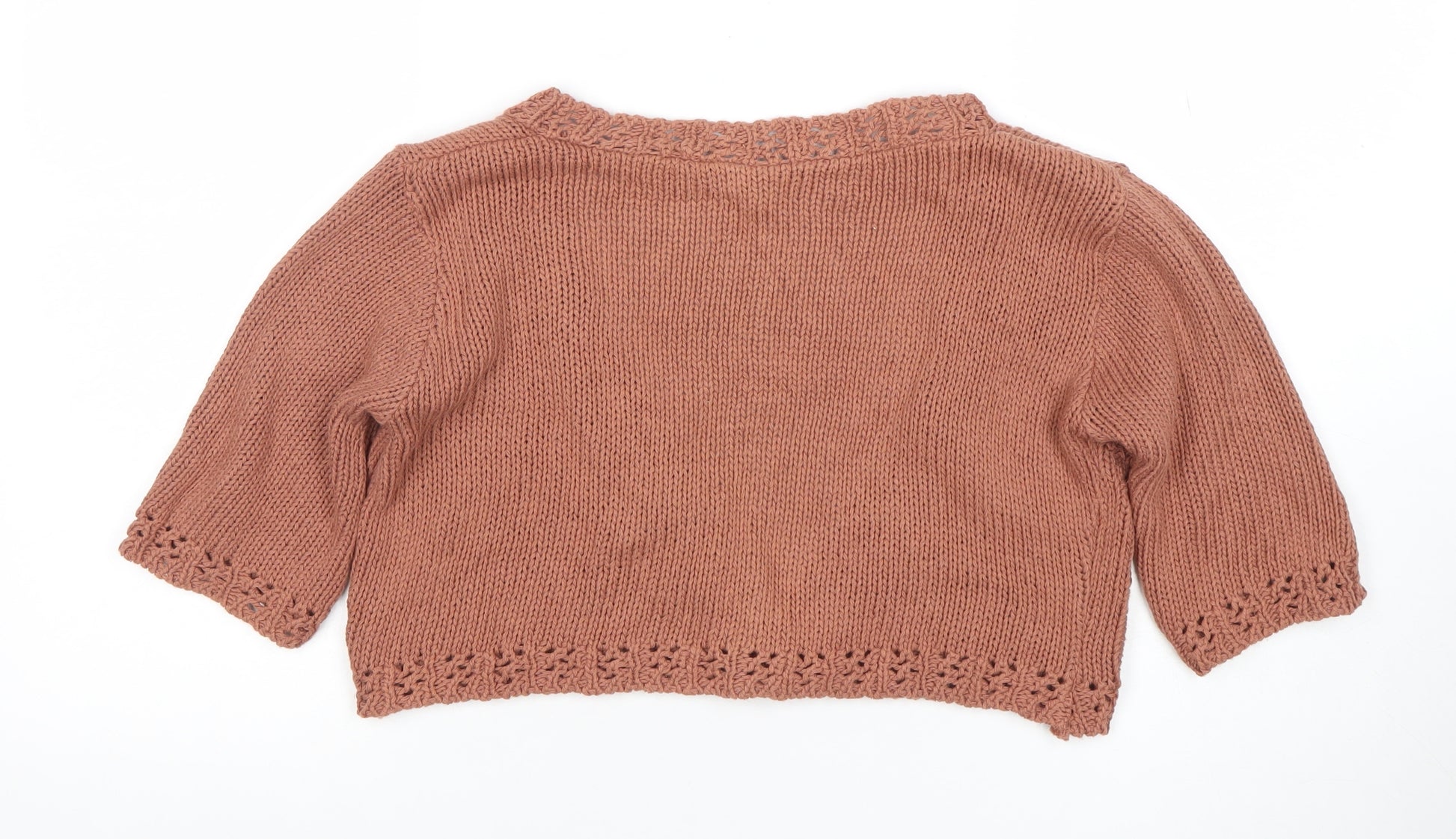 This A|Wear women’s brown V-neck cardigan offers a timeless, easy-to-wear piece ideal for layering throughout the seasons. Crafted from 100% cotton, the soft knitted texture gives it a comfortable and breathable feel, perfect for both spring and autumn days. The open-knit crochet design adds a feminine touch, complemented by a single front button fastening that brings a subtle classic detail to the overall look. The 3/4 sleeves provide the right balance of coverage and style, making this cardigan versatile enough for casual occasions, pairing beautifully over dresses, blouses, or camis for relaxed sophistication. The lightweight construction ensures a flattering drape and lasting comfort, whether for a day at the office, casual brunch, or evening outing. Its mid-brown tone adds warmth to your wardrobe and complements a variety of colours, from neutrals to patterns. Designed in a cropped fit, this open-front cardigan features fine crochet accents along the neck, cuffs, and hem, giving it a touch of handcrafted charm. In excellent pre-owned condition with no visible flaws, this piece shows minimal signs of wear and has been gently cared for. Stylish yet effortlessly wearable, it’s a wardrobe essential that brings texture and balance to any outfit. Machine washable for easy garment care, this cotton knit cardigan combines practicality with elegance, offering enduring appeal for many seasons to come. Whether dressing up or down, this A|Wear cardigan is the perfect finishing layer for a softly refined outfit. Secure this versatile knitwear piece today and enjoy elegance with comfort for all your casual and smart-casual looks.