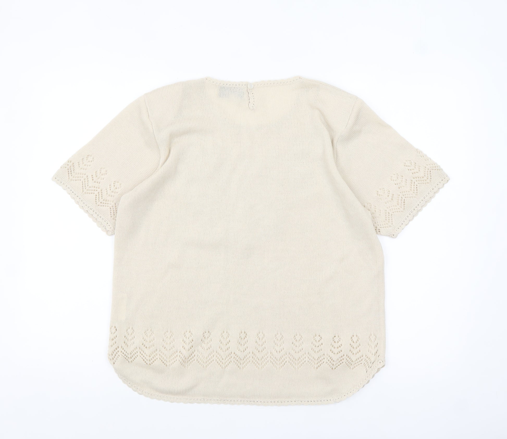 Add timeless elegance to your wardrobe with this ABEL Women's Beige Knit Tunic Blouse in size XL. Crafted from a soft blend of 80% acrylic and 20% nylon, this chic top offers both comfort and durability. The lightweight knit fabric gives it an airy feel, perfect for transitional seasons such as spring and autumn, and equally comfortable for mild summer days. The delicate embroidered appliqué floral detail elevates its simple design, adding a graceful touch of texture and uniqueness. This beige hue complements every wardrobe, pairing effortlessly with jeans, skirts, or tailored trousers. The blouse features short sleeves with a subtle lace-inspired knitted pattern and scalloped trim, giving the top a feminine charm while maintaining a relaxed fit. The round crew neckline ensures comfort and versatility for both casual and smart-casual occasions. Designed with a pullover closure, this piece combines ease with refinement, ideal for layering or styling alone. Perfect for relaxed weekends, lunches out, or casual workwear, it balances understated sophistication with everyday practicality. Its breathable construction ensures lasting comfort throughout the day. In excellent pre-owned condition, this beautiful ABEL tunic demonstrates minimal signs of wear and no visible flaws — ready to become a cherished part of your collection. Hand wash only to maintain the integrity of the delicate knit. With its blend of comfort, quality, and elegant detailing, this ABEL blouse is a versatile choice for those who appreciate refined simplicity and classic design. Make this timeless knit top a part of your seasonal wardrobe rotation and enjoy subtle luxury with every wear.