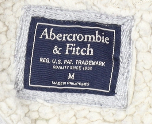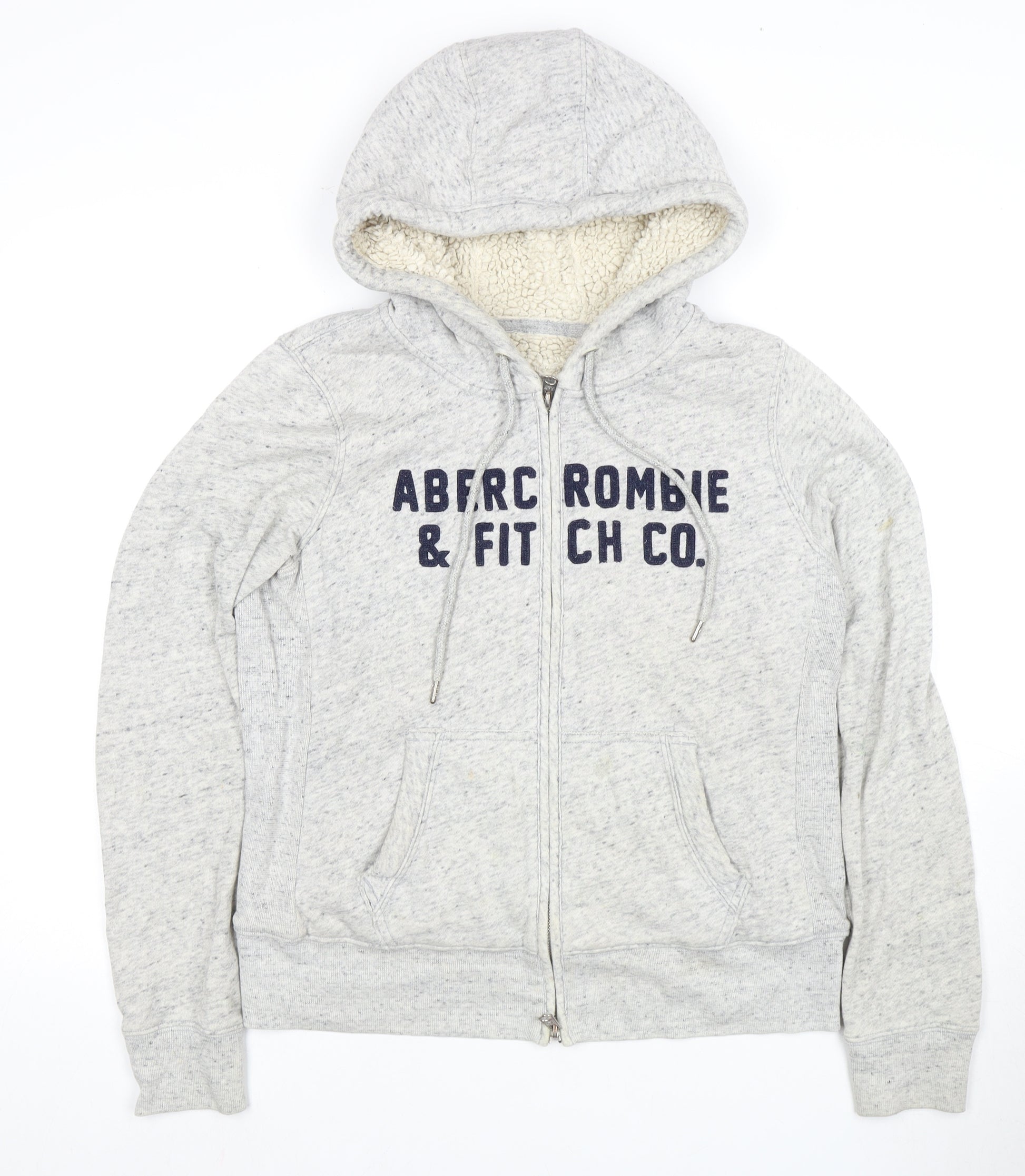 Experience the comfort and style of this Abercrombie & Fitch Men's Grey Full Zip Hoodie. Crafted from a soft fleece blend of 64% cotton and 36% polyester, this hoodie provides warmth and comfort, making it perfect for autumn and winter outings. With a convenient full zip closure and functional pockets, it meets your everyday needs. The hooded design adds an extra layer of comfort, while the prominent logo accent on the front gives it a trendy, branded look. Suitable for various casual occasions, this hoodie is a versatile addition to any wardrobe. Though pre-loved, it is in excellent condition with only slight wear on the cuffs, ensuring a great value buy.