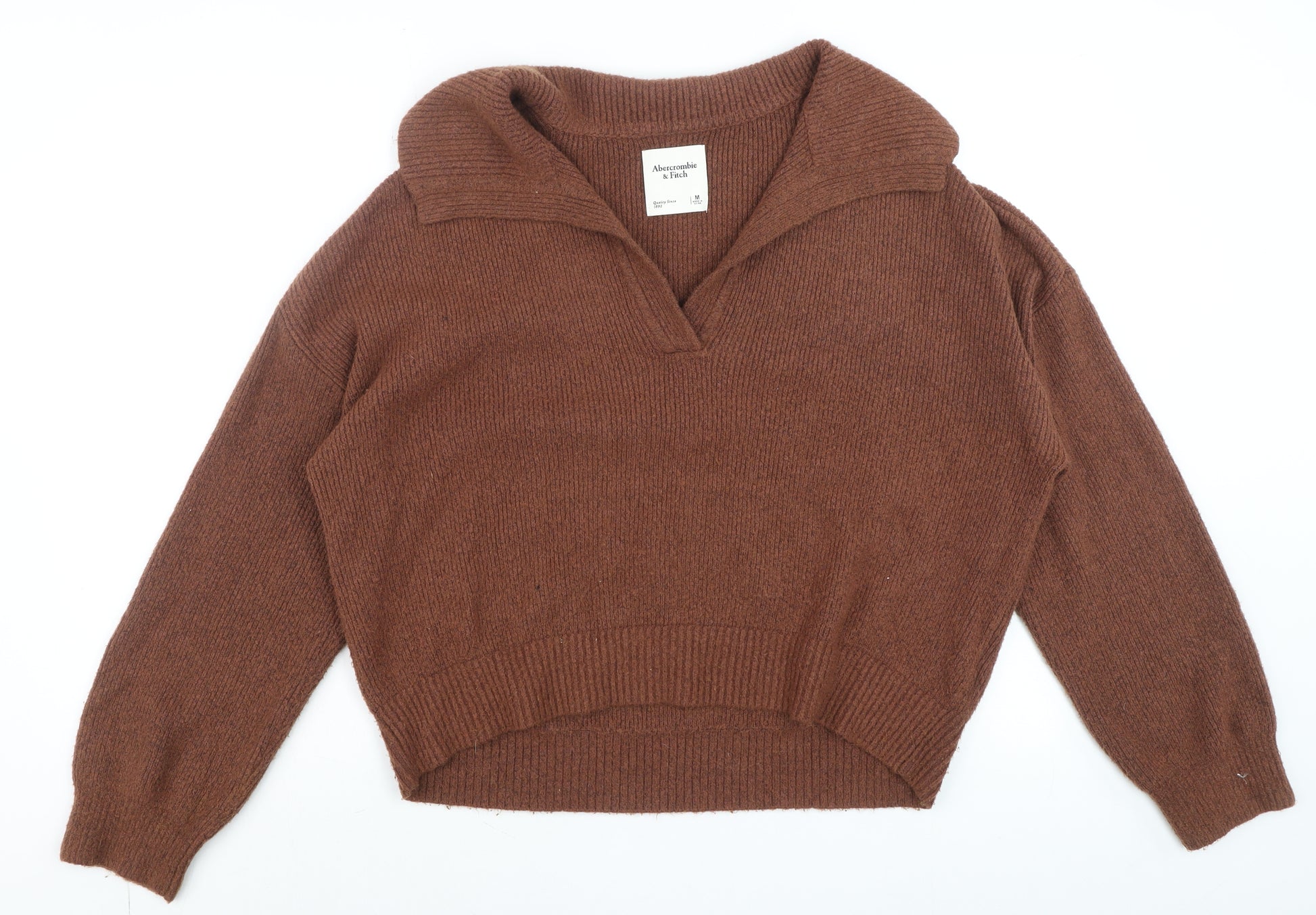 This Abercrombie & Fitch women’s brown collared jumper offers the perfect combination of casual comfort and timeless design. Crafted from a soft blend of nylon, viscose, polyester, and elastane, this jumper provides a cosy yet breathable feel that is ideal for the cooler autumn and winter seasons. Its rich brown shade exudes warmth and versatility, pairing beautifully with jeans, skirts, or tailored trousers for an effortlessly chic look. The pullover style and collared neckline bring a refined touch, while the long sleeves and ribbed hem and cuffs ensure a snug and flattering fit that enhances everyday appeal. The lightweight knit construction offers subtle stretch, giving you plenty of ease and comfort throughout the day. Designed with simplicity in mind, this piece features a clean, no-pattern finish and a classic regular fit, making it both practical and stylish. Whether layered over a white shirt for a polished look or worn solo for relaxed weekend wear, this jumper transitions seamlessly between smart and casual occasions. Made from high-quality materials (47% nylon, 42% viscose, 9% polyester, and 2% elastane), it maintains durability and shape retention over time. Suitable for casual outings, coffee dates, or office layering, it’s an essential garment for your cold-weather wardrobe. Easy to care for with machine-washable convenience, this Abercrombie & Fitch piece embodies understated luxury that the brand is renowned for. In excellent pre-loved condition with no visible marks or damage, this jumper remains in great shape and ready to wear. Its refined simplicity ensures it will become a wardrobe staple. Don’t miss out on adding this soft, stylish, and versatile knit to your collection—a classic piece that complements every outfit through the seasons.