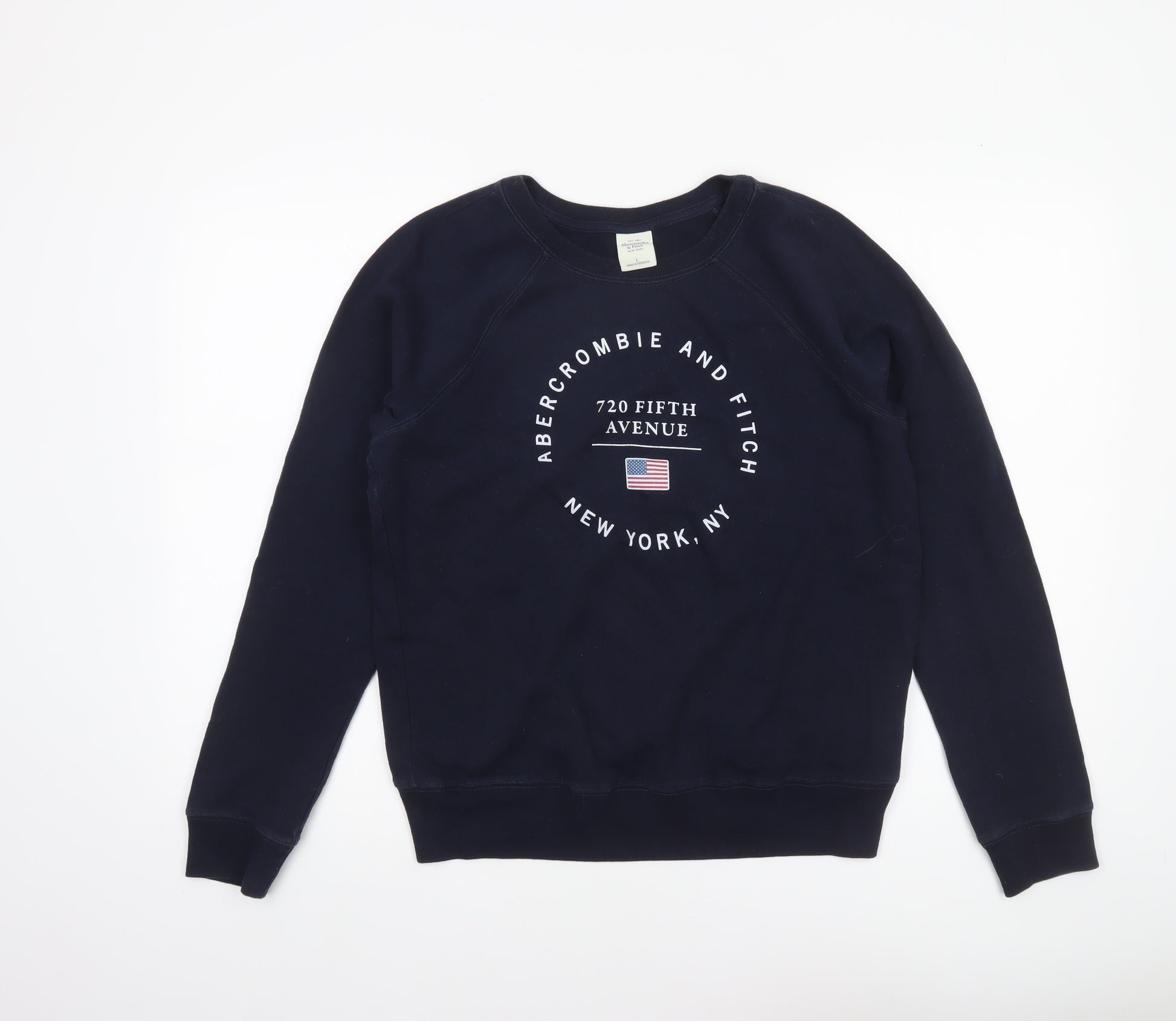 Stay cosy and stylish with this navy blue Abercrombie & Fitch women’s pullover sweatshirt, crafted from a comfortable cotton and polyester blend for a soft, breathable wear. The design features the brand’s iconic logo and ‘720 Fifth Avenue, New York, NY’ graphic print on the front, offering a classic American-inspired aesthetic that seamlessly blends casual fashion with everyday comfort. Ideal for layering across all seasons, this sweatshirt is perfect for casual outings, lounging, or pairing with jeans for a relaxed weekend ensemble. The crew neck and long sleeves provide a timeless silhouette, while the ribbed cuffs and hem give a snug fit that helps keep warmth in. Its midweight fabric ensures all-day comfort, making it suitable for both indoor and outdoor use. The fabric composition – 60% cotton and 40% polyester – offers durability and shape retention after washing. Despite being gently pre-loved, the sweatshirt remains in excellent condition, showing only minimal signs of wear. With its versatile look and premium feel, this Abercrombie & Fitch sweatshirt appeals to those who value understated luxury and authentic design. Whether you wear it with leggings, denim, or joggers, it makes a reliable addition to your wardrobe for chilly evenings or casual days out. Don’t miss this opportunity to own a genuine piece of classic Abercrombie comfort and heritage. This garment represents effortless everyday style – practical, enduring, and unmistakably cool. Perfect for women and teens alike, it makes an excellent gift or a timeless staple for your own collection.