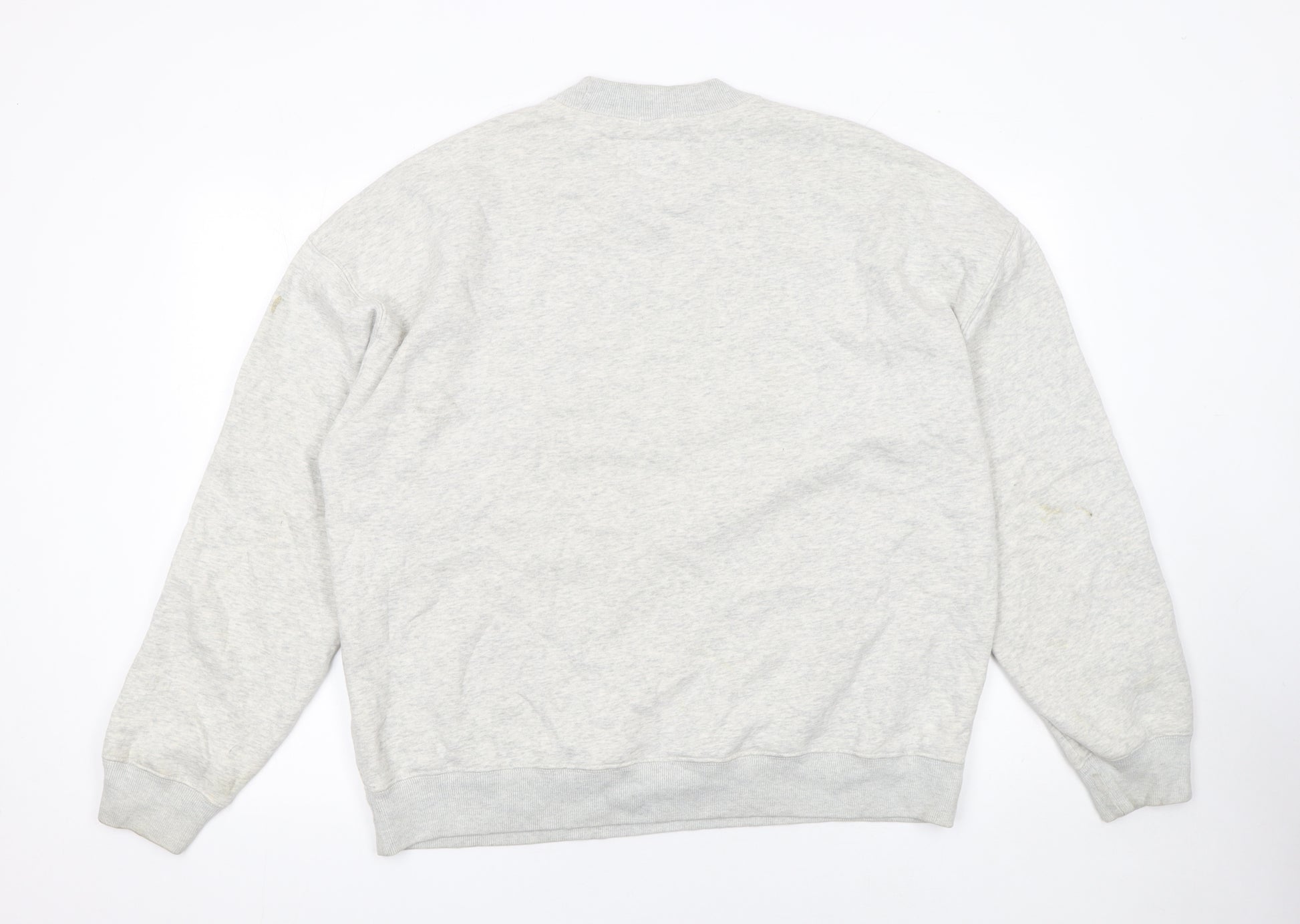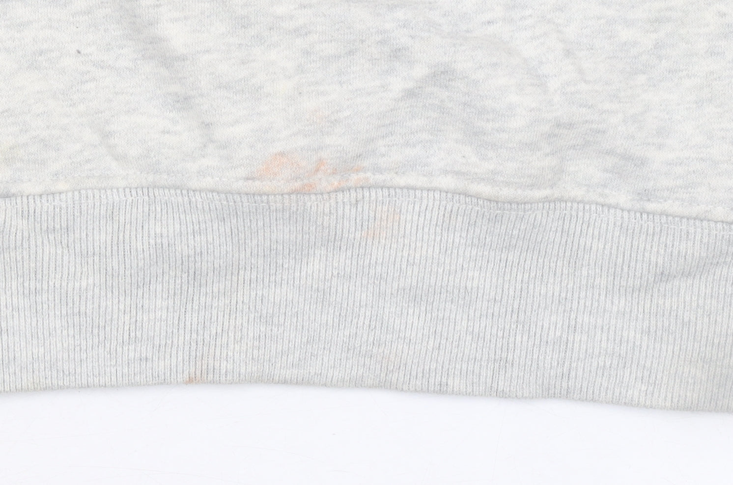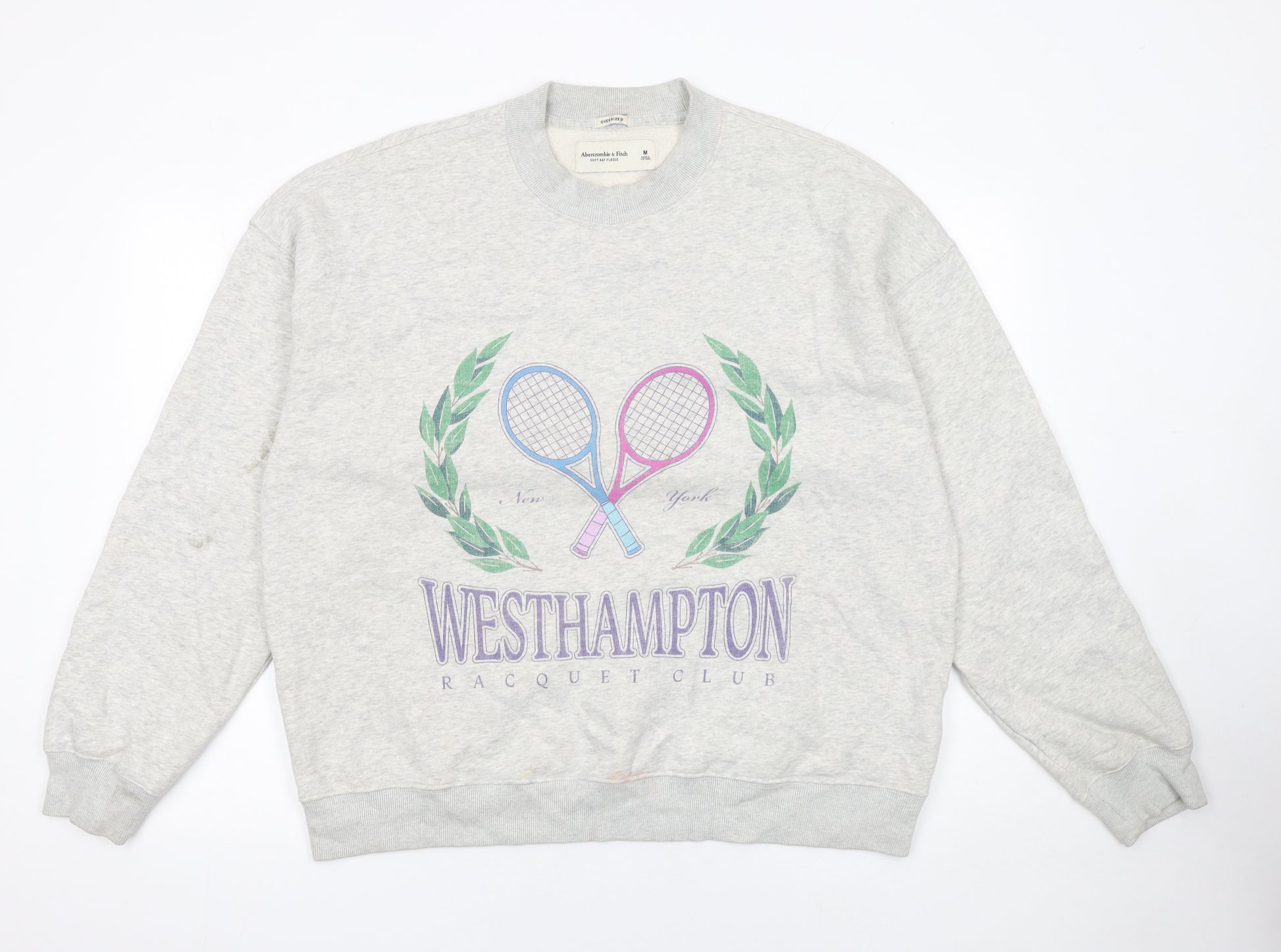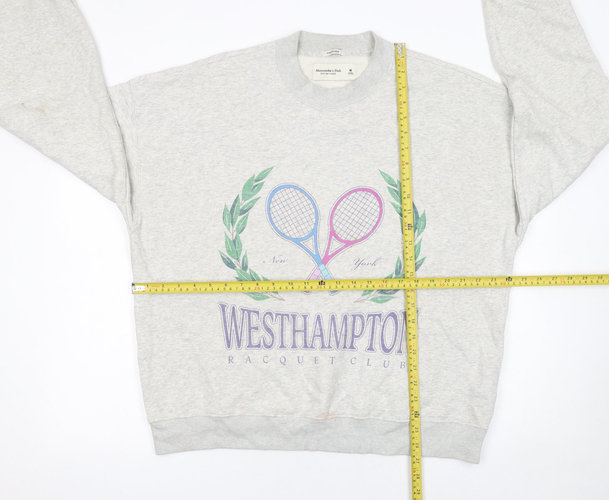 This Abercrombie & Fitch women’s oversized sweatshirt combines laid-back comfort with a classic sporty aesthetic. Crafted from a soft cotton blend fleece, this sweatshirt offers an effortlessly casual look perfect for year-round wear. The pale grey colour complements most wardrobes, finished with an eye-catching 'WESTHAMPTON RACQUET CLUB' graphic across the front, featuring crossed tennis racquets and a laurel motif for a timeless, vintage-inspired feel. Designed in a relaxed oversized fit, this sweatshirt ensures maximum comfort and movement. The ribbed neckline, cuffs, and hem add structure while maintaining a cosy look. Its crew neck and long sleeves make it perfect for layering on cooler days. Ideal for casual days out, lounging, or pairing with leggings and trainers for a retro sporty outfit. Made from 70% cotton and 30% polyester, it’s machine washable and built for both comfort and durability. While gently used, this piece still holds excellent wearability, showing only minor marks reflecting light use. This sweater blends casual appeal and preppy charm, perfect for women who love understated fashion with a touch of collegiate style.