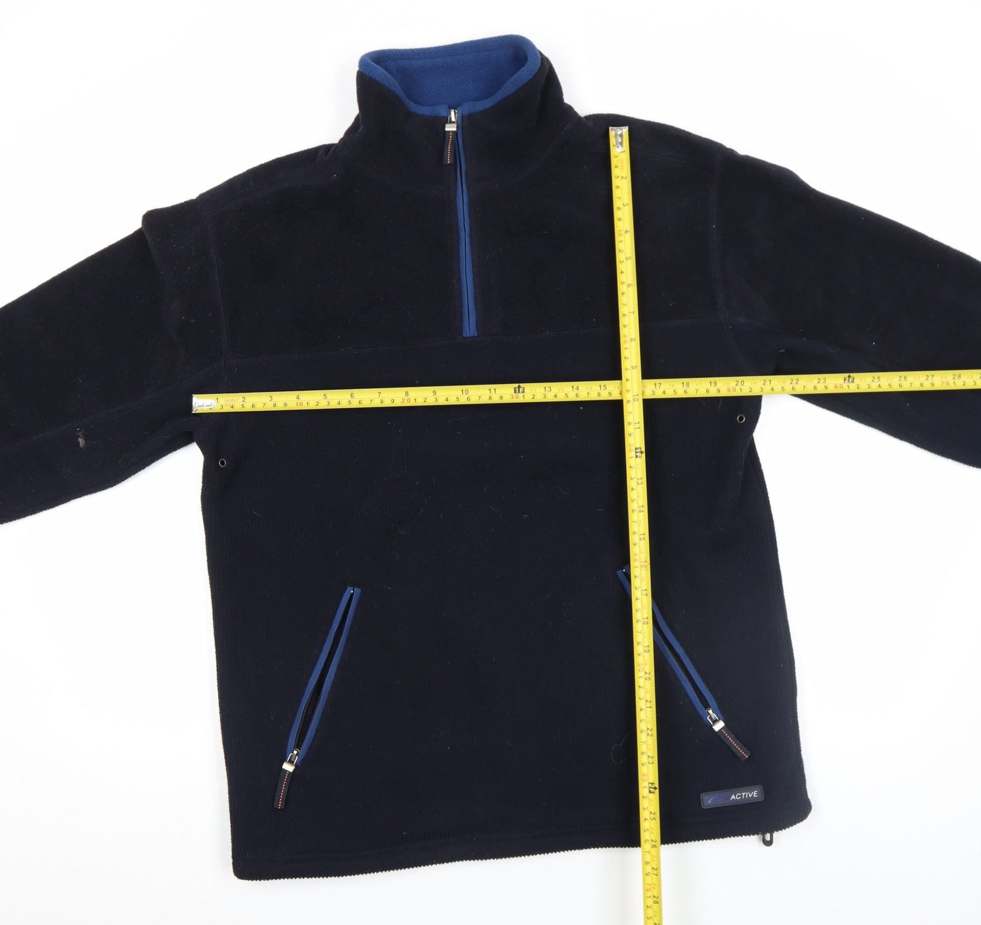 Stay warm, comfortable, and ready for any outdoor activity with this Active Sportswear men's fleece pullover. Designed in a versatile deep blue colour with striking contrasting trim details, this piece combines practicality and casual style. Crafted from 100% polyester fleece fabric, it ensures a soft yet hardwearing texture that provides excellent insulation without unnecessary bulk. The fleece construction offers both warmth and breathability, ideal for wear during cooler autumn or winter days whether you're hiking, walking, or simply relaxing outdoors. The pullover features an easy-to-use 1/4 zip fastening at the front with a stand-up collar, providing adjustable ventilation and added comfort. The zip pockets at the front give convenient, secure storage for your essentials while you're on the move. Elasticated hems and cuffs deliver a neat and functional finish, helping to retain body warmth during physical activity or casual wear. The small logo label positioned near the hem adds a subtle branded touch without overpowering the minimalist appeal of the design. Cut in a regular fit for complete ease of movement, this fleece is ideal for layering over a t-shirt or base layer. The garment has been machine washable for easy maintenance, ensuring practicality for everyday use. Visible signs of its pre-owned nature amount only to light linting typical of soft fleece material, with no major flaws or damage. Perfect for active days or laid-back evenings, this Active Sportswear fleece pullover blends functional utility with timeless outdoor style. Suitable for hiking trails, casual weekend wear, or gym warm-ups, it’s a versatile wardrobe essential offering enduring comfort, warmth, and everyday reliability. Priced affordably for its quality, this piece represents an excellent value choice for anyone seeking reliable mid-layer performance clothing this season.