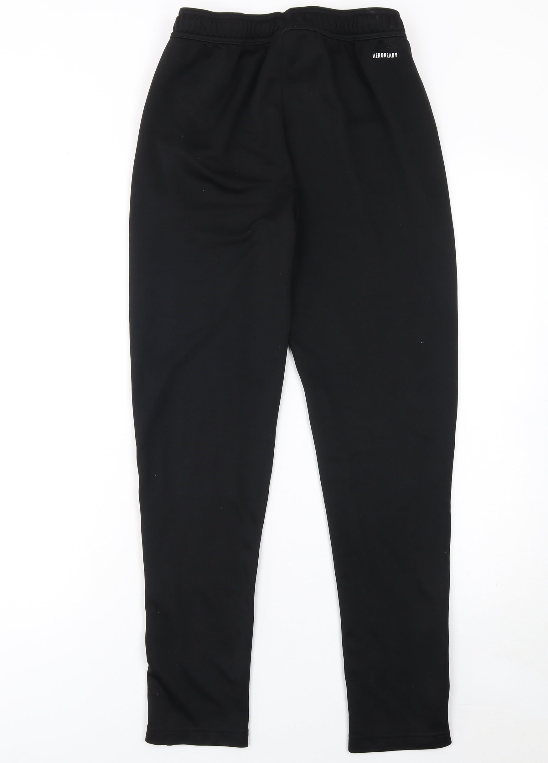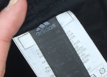 Keep your young one comfortable and stylish in these black Adidas jogger trousers, designed with active boys in mind. Crafted from 100% polyester, these trousers are durable, lightweight, and built for movement, making them ideal for sports, school, or casual wear. The soft knit fabric offers a smooth finish and breathable comfort, while Adidas’ AEROREADY technology helps wick moisture away to keep the wearer cool and dry during play or training. Featuring an elasticated waistband with an internal drawstring for a secure fit, these joggers also come with side pockets for convenient storage of small essentials. The ankle zips make them easy to take on and off over trainers. Subtly branded with the Adidas logo, these sleek black trousers have a streamlined athletic look that pairs easily with T-shirts, hoodies, or sports tops. Suitable across all seasons, they’re perfect for layering in cooler weather or wearing alone during warmer days. These trousers are in excellent pre-owned condition with minimal wear and show no marks or defects. Machine washable, they’re easy to care for and maintain their shape and colour wash after wash. Ideal for football practice, running, or simply relaxing, these Adidas joggers provide a perfect combination of style, comfort, and practicality. An essential addition to any active boy’s wardrobe, these versatile trousers deliver the trusted quality and performance you expect from Adidas, ensuring that he looks and feels his best every day.