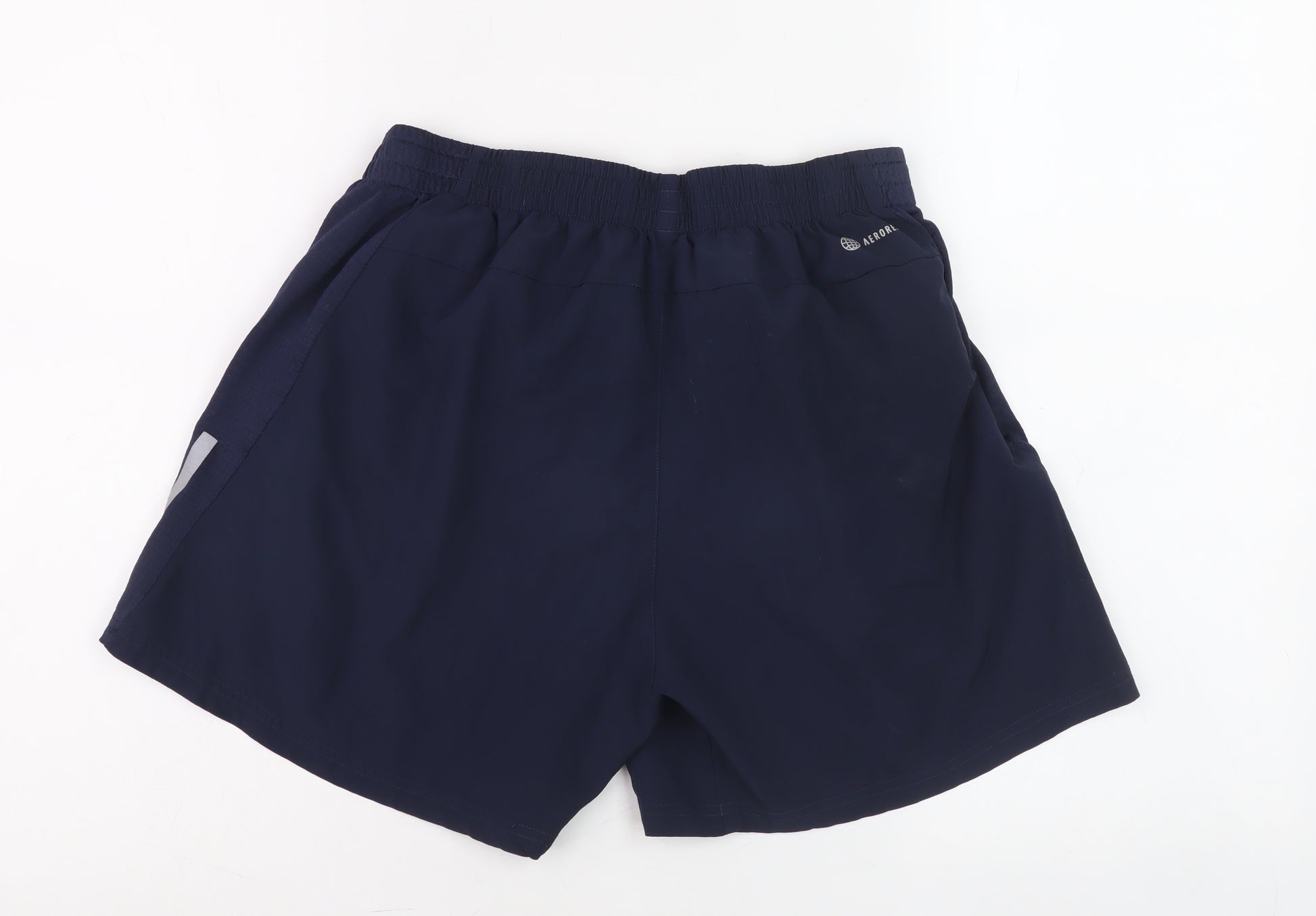 Stay ahead in style and performance with these Adidas Boys Blue Athletic Running Shorts in size M. Perfect for activewear, these shorts are crafted from a lightweight jersey fabric made of 100% polyester, ensuring breathable comfort while jogging or running. Designed with a regular fit and an elastic waist for easy wear, these shorts are ideal for casual and active occasions alike. Their flat front and sports theme enhance the sporty vibe, making them a practical choice for spring and summer. Although they lack original sales tags, these shorts remain in excellent condition, free from any visible damage or stains. Machine washable for effortless maintenance, these shorts promise durability and consistent performance. A great addition to any active young wardrobe, offering reliability and iconic Adidas style.