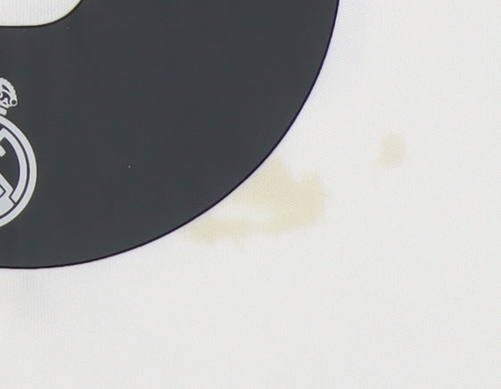 This Adidas Boys Football Jersey in pristine white is the perfect blend of comfort and style. Designed for the young football enthusiast, this jersey is suitable for all seasons, offering breathability and performance with its 100% polyester fabric. Sporting the classic crew neck and short sleeves, it is ideal for active wear. The jersey features the unmistakable Adidas logo and classic football aesthetics, making it both fashionable and sporty. With a regular fit and solid pattern, it ensures maximum comfort and ease of movement on the field. Despite being in very good condition with a minor stain on the back, this jersey remains a great choice for sports activities. Machine washable, it promises easy care, letting your young athlete play without worry. Grab this stylish and functional sports jersey today to enhance their active wardrobe.