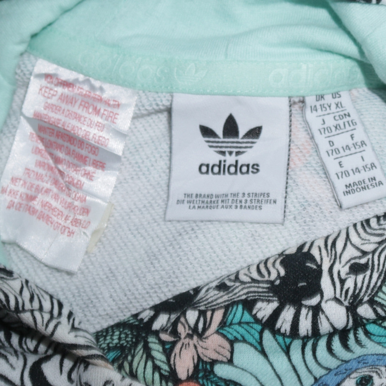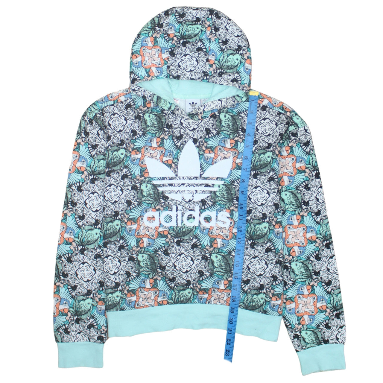 Brighten up casual days with this girls' multicoloured adidas pullover hoodie, combining comfort, quality and a bold graphic design. Made from a soft cotton and polyester jersey blend, the hoodie delivers breathable comfort and long-lasting wear suitable for everyday adventures. The striking all-over print features a playful mix of animals and floral motifs in shades of turquoise, peach, black and white, creating a unique look that stands out effortlessly. The iconic adidas Trefoil logo printed across the chest adds an unmistakable sporty touch, distinguishing this piece as an authentic staple from one of the world’s most trusted sportswear brands.Designed with a classic pullover style, the hoodie features a spacious hood with a soft cotton lining to keep warm during cooler seasons, while its ribbed cuffs and hem maintain shape and provide a snug fit. The XL sizing makes it ideal for older girls seeking both style and practicality, making it a great option for school, weekend wear or casual outings. Suitable for spring, autumn or winter layering, it delivers dependable comfort across all seasons.While previously owned, this hoodie remains in excellent condition, showing minimal signs of wear and retaining its vibrant colour and structure. The lightweight yet warm fabric blend offers easy care and durability, perfect for an active lifestyle. Pair this stand-out hoodie effortlessly with jeans, leggings or joggers for a trendy streetwear-inspired look. This adidas piece is a great choice for those who appreciate lively prints and athletic style blended with everyday versatility. With its eye-catching pattern, soft fabric composition, and trusted brand detailing, it’s an essential addition to any young wardrobe that values both fashion and function.