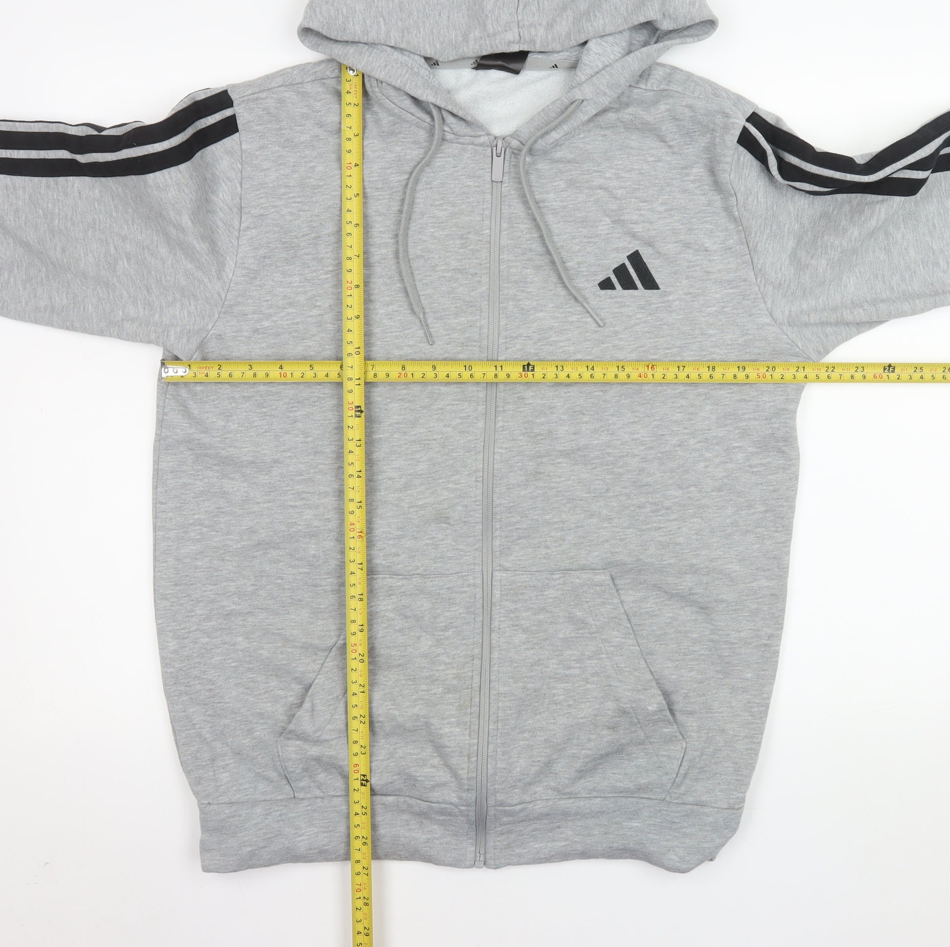 Step into casual comfort and sporting style with this men’s grey hooded jacket from Adidas. Perfect for layering in cooler seasons, this full zip jacket is crafted from a soft and breathable blend of 55% cotton, 36% polyester, and 9% viscose, delivering both warmth and flexibility. The fleece-like interior lining ensures additional comfort, ideal for all-day wear whether you’re running errands, travelling, or relaxing. Designed in a regular fit with a mid-length cut, this versatile jacket includes a practical hood with drawstrings, a full front zip closure, and two convenient front pockets. Its minimalist grey colourway is enhanced by the iconic Adidas black logo on the chest and three-stripe detailing along the sleeves, lending a sporty, timeless appeal. The fabric composition ensures durability and easy garment care, being fully machine washable—ideal for everyday use. Suitable for activities such as gym training, jogging, and walking, this piece balances casual comfort with athletic edge. Lined for additional warmth and featuring a modern yet classic silhouette, it’s an excellent wardrobe staple for men seeking functionality with style. In very good used condition, with a light mark on one sleeve, this jacket retains great overall appearance and wearability. Whether paired with joggers or jeans, it transitions effortlessly between sportswear and laid-back casual looks. A great choice for the autumn, spring, or winter months. Grab this Adidas grey zip-up hooded jacket in size M and experience the quality and understated style the brand is known for—perfect for everyday outfits, travel, and active lifestyles.