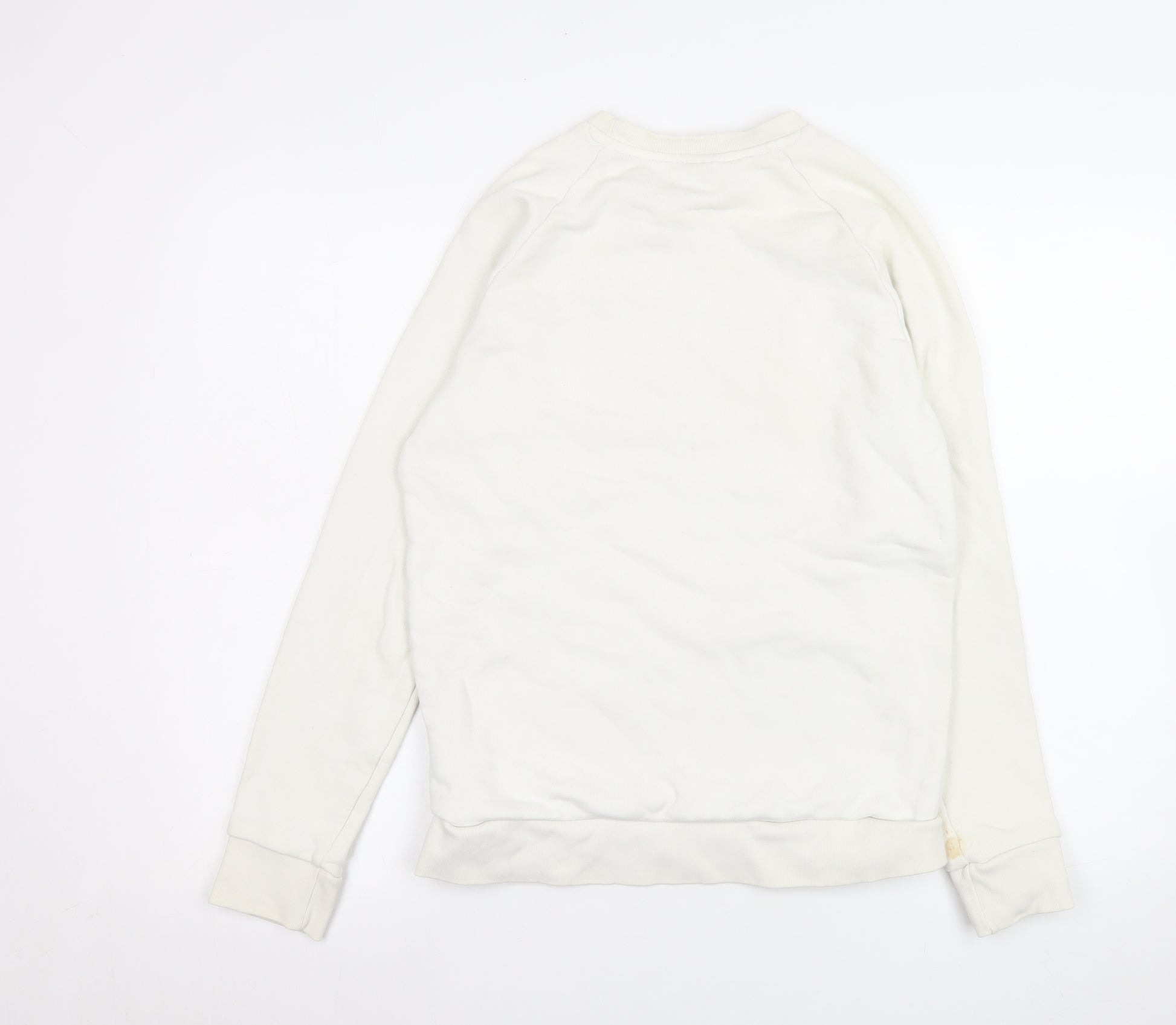 Refresh your casual wardrobe with this Adidas men’s ivory pullover sweatshirt, designed for comfort and everyday wear. Crafted from soft cotton jersey fabric with a touch of elastane, this sweatshirt ensures a naturally breathable feel while providing flexible movement throughout the day. The classic crew neckline and long sleeves create a timeless silhouette that pairs seamlessly with joggers, jeans, or shorts for a sporty yet relaxed look. Finished with the iconic Adidas Trefoil logo on the chest, it captures an effortlessly athletic and modern vibe that never goes out of style. Perfect for cool autumn strolls, laid-back spring outings, or layering during the winter months, this piece offers reliable warmth without excess bulk. With its lightweight yet durable construction, it’s an ideal choice for gym sessions, casual streetwear, or just lounging in comfort. Its soft ivory tone gives a clean aesthetic that complements any outfit, while the ribbed cuffs and hem provide a secure and flattering fit. This sweatshirt is made mainly from high-quality cotton, offering natural breathability and softness you can feel. The fabric’s slight elastane content allows subtle stretch, ensuring freedom of movement whether you’re at the gym or relaxing. The garment remains easy to care for, being machine washable for added convenience. Please note there is a visible stain on one sleeve, reflected in the value and condition rating. Despite this, the sweatshirt remains in good wearable condition, maintaining its shape and comfort. Priced affordably for its premium quality, this Adidas sweatshirt offers classic style, versatile wearability, and everyday ease—making it an excellent addition to any staple wardrobe.